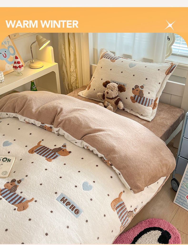 当前位置: 91家纺网 > 商品网购 > 床品套件 > 四件套 > 法莱绒四件套 > 川悦生活 2025新款立体雪花绒印花四件套学生床系列二场景二 腊肠小点