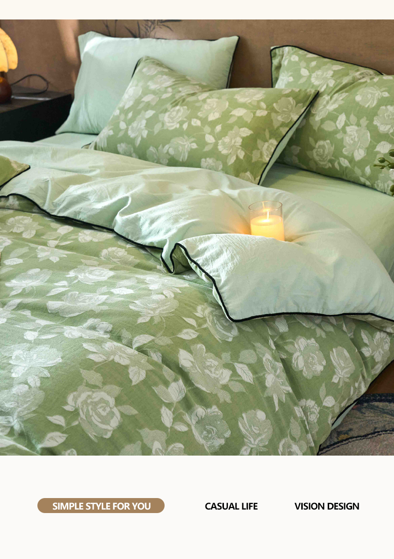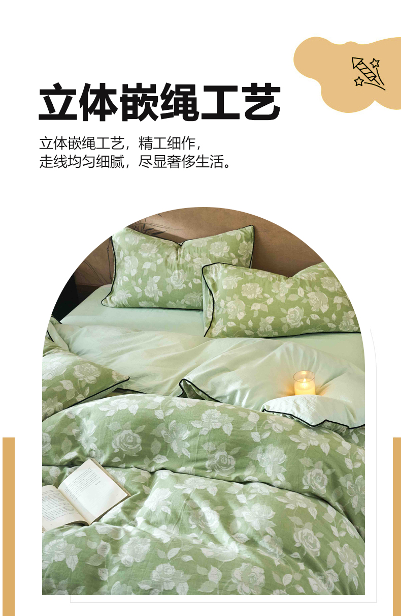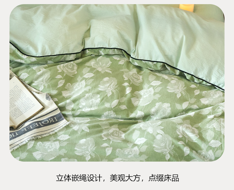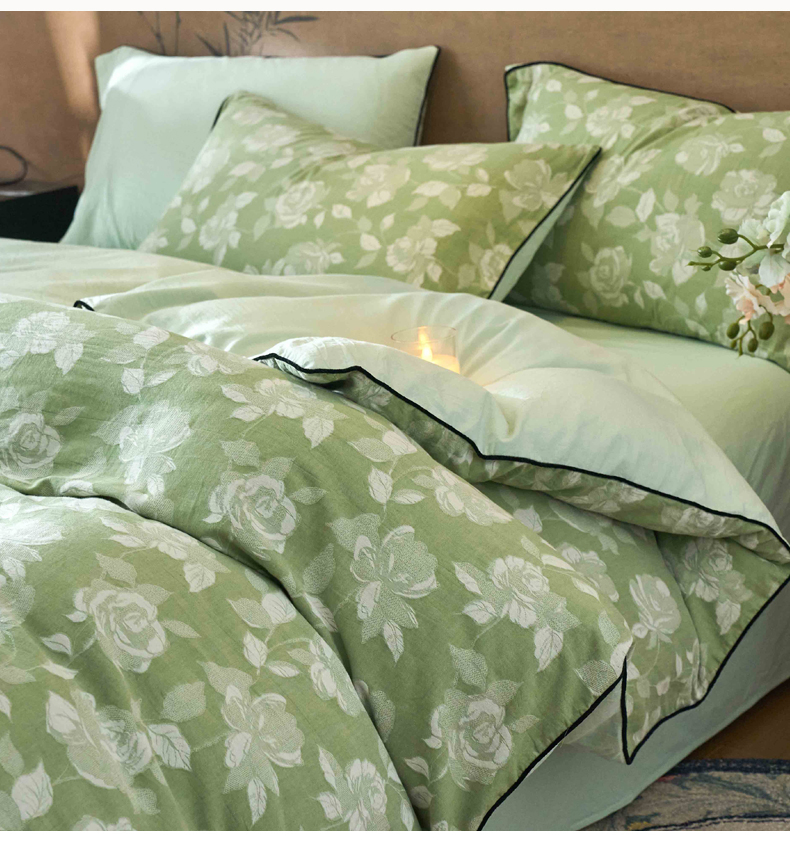 当前位置: 91家纺网 > 商品网购 > 床品套件 > 四件套 > 全棉普通四件套 > 兰紫橙家纺 2025新款全棉纯棉嵌边色织提花四件套 玫瑰之约-草绿