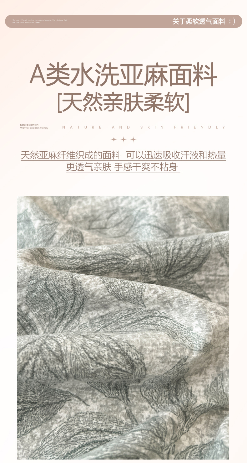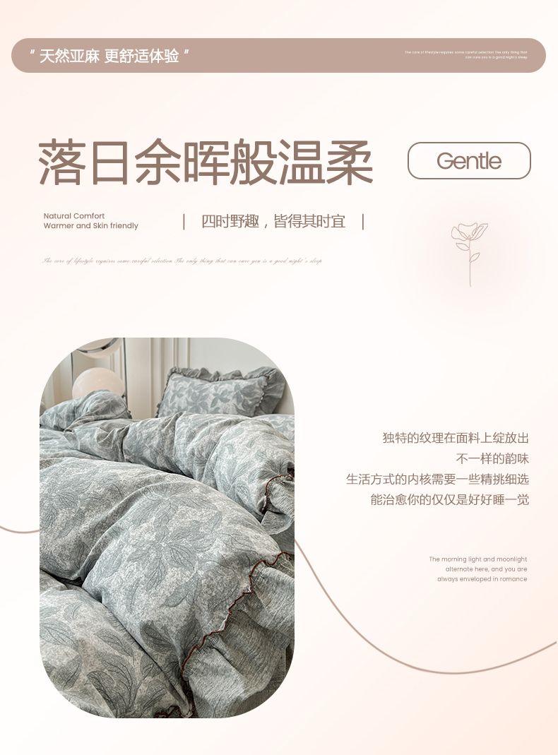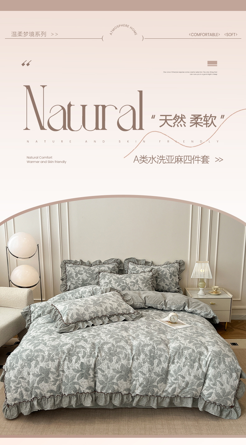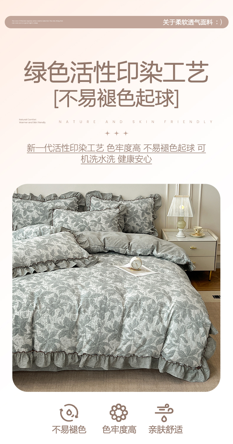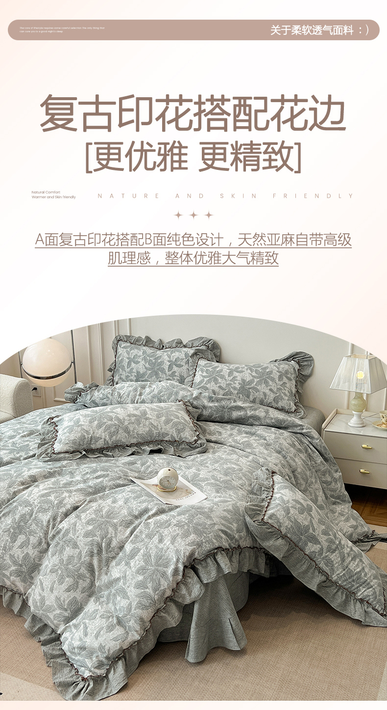 商品名称:鑫利来家纺 2025新款加厚高克重亚麻复古原麻皱皱纱印花法式花边四件套 叶之舞
