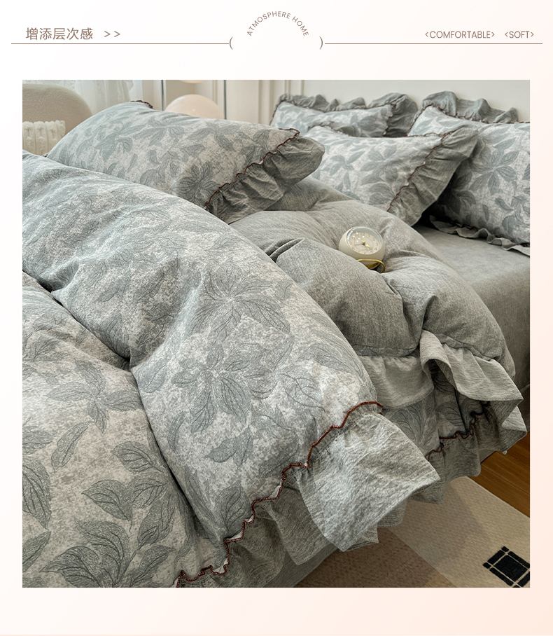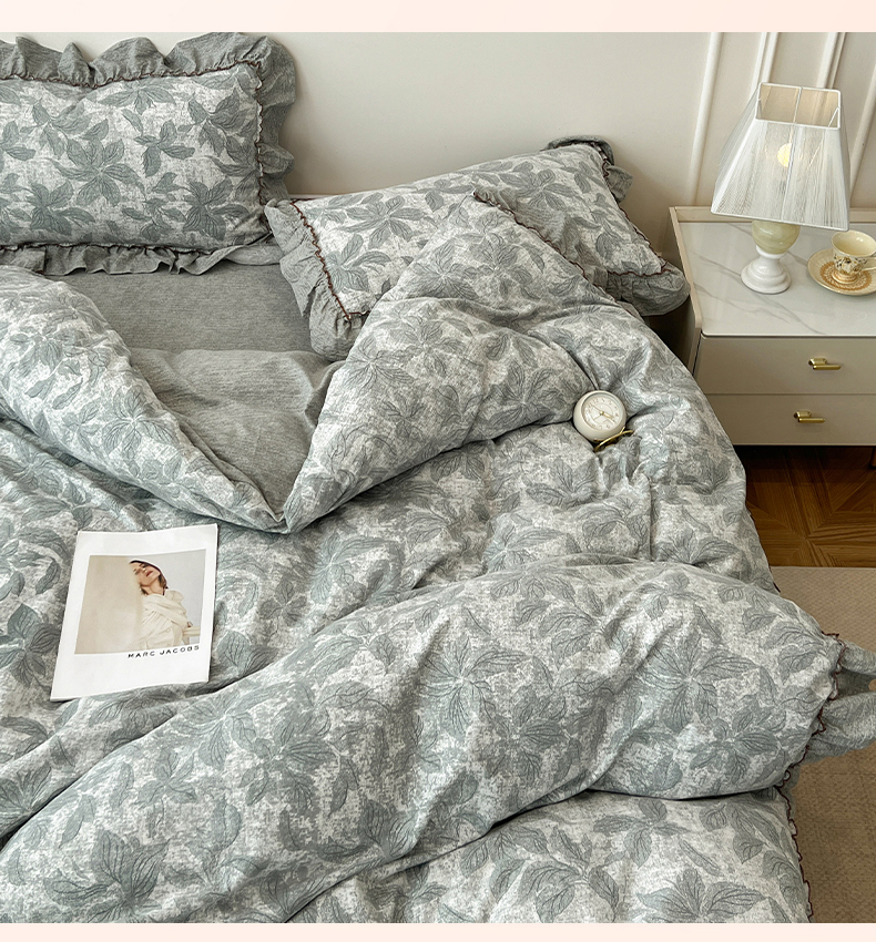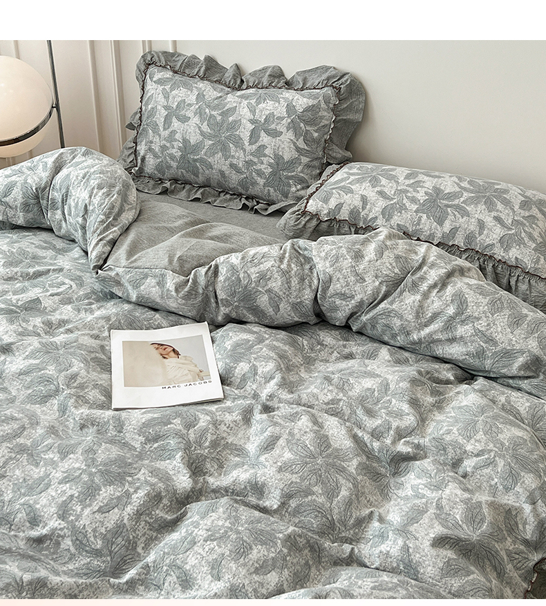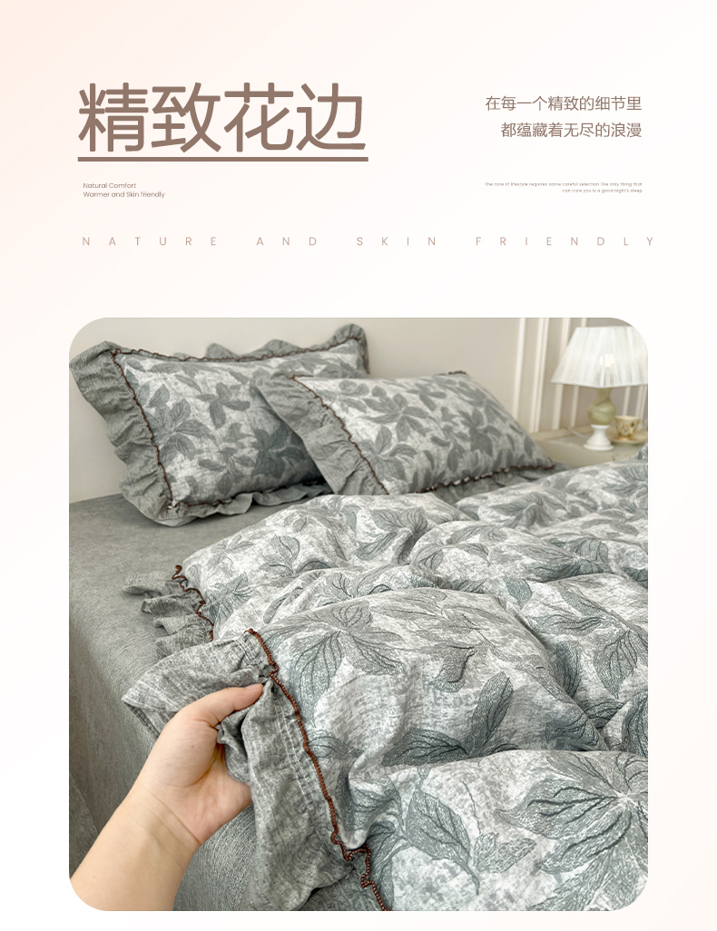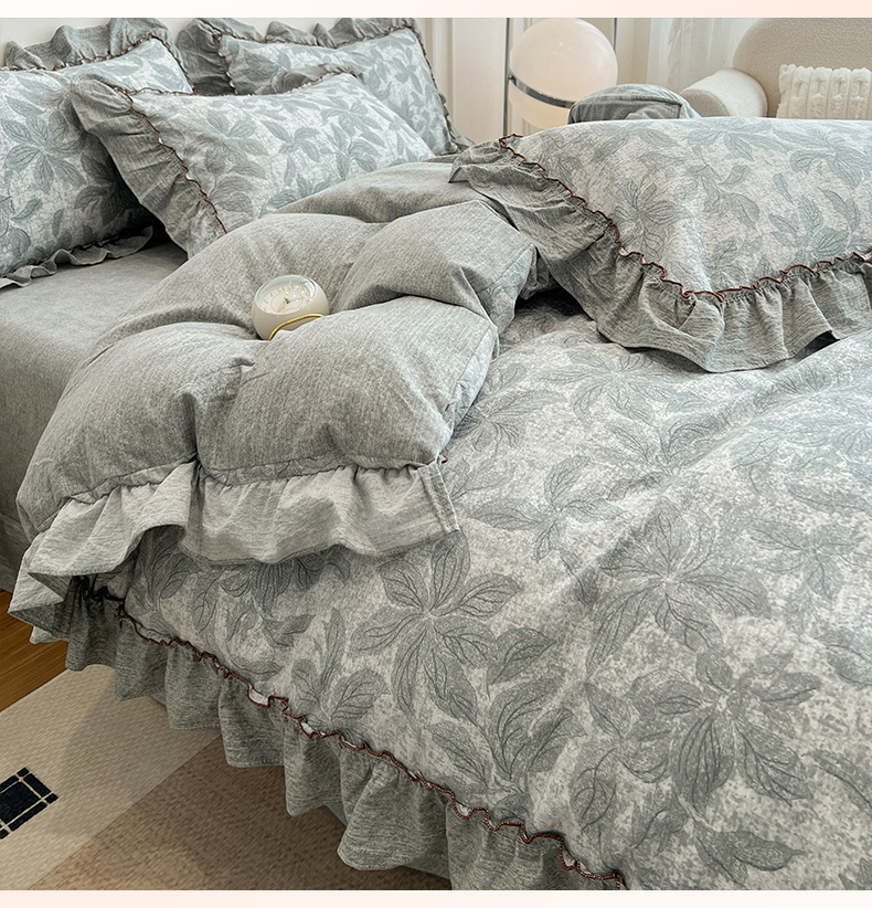 鑫利来家纺 2025新款加厚高克重亚麻复古原麻皱皱纱印花法式花边四件套 叶之舞