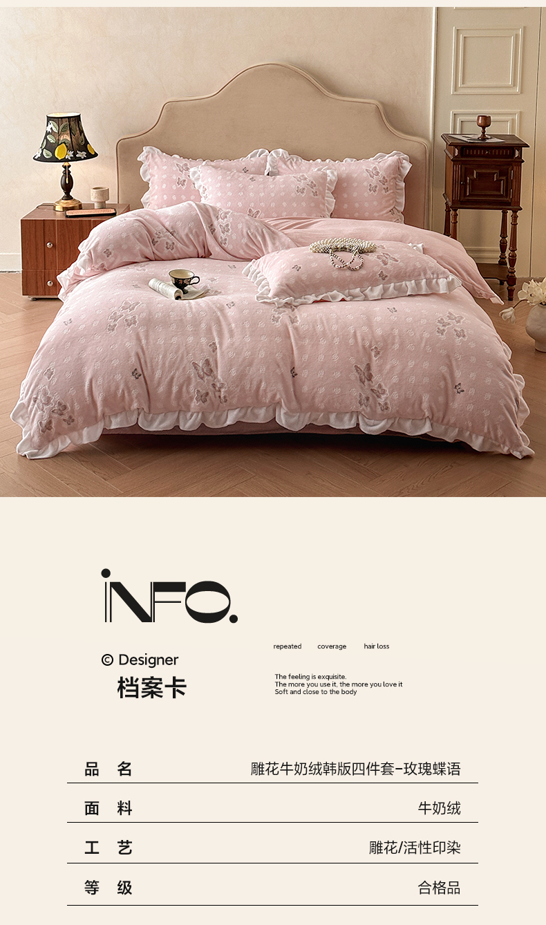 澳梵家居 2025新款雕花牛奶绒韩版四件套-玫瑰蝶语 粉钻花漾
