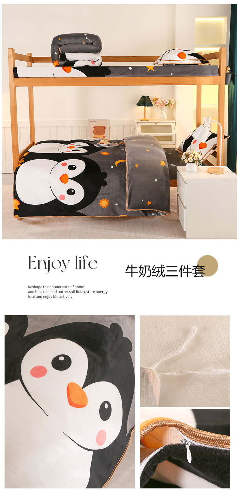 雨洋家纺 2025新款学生季加厚保暖牛奶绒金貂绒婴儿宝宝学生三件套企鹅