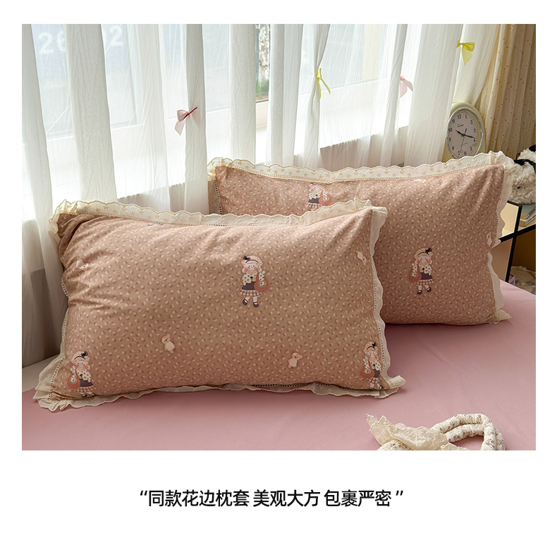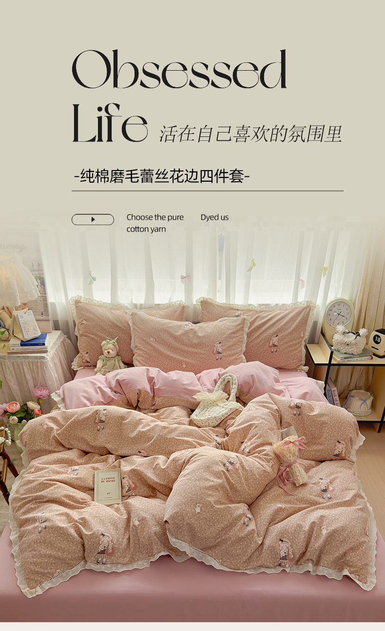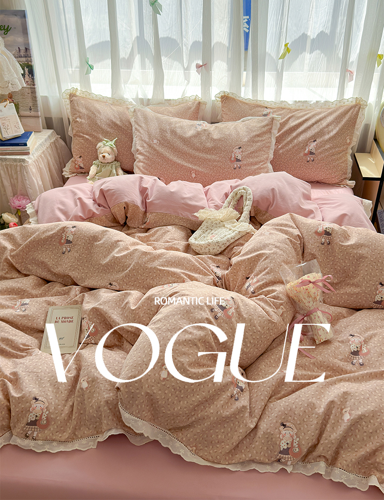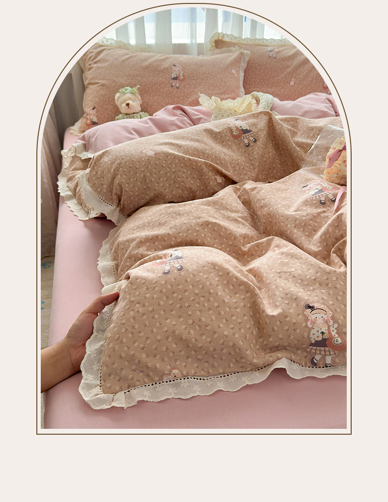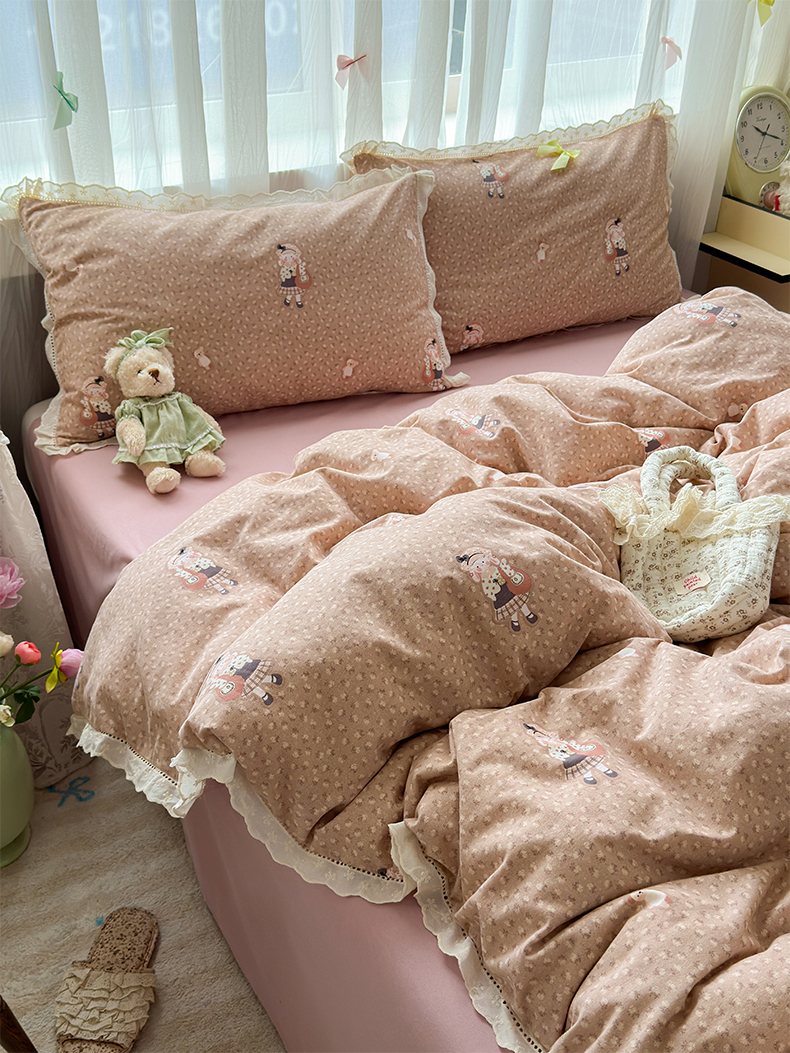 简宜家居(朝初家纺) 2025新款全棉磨毛蕾丝花边四件套 兔兔花被窝