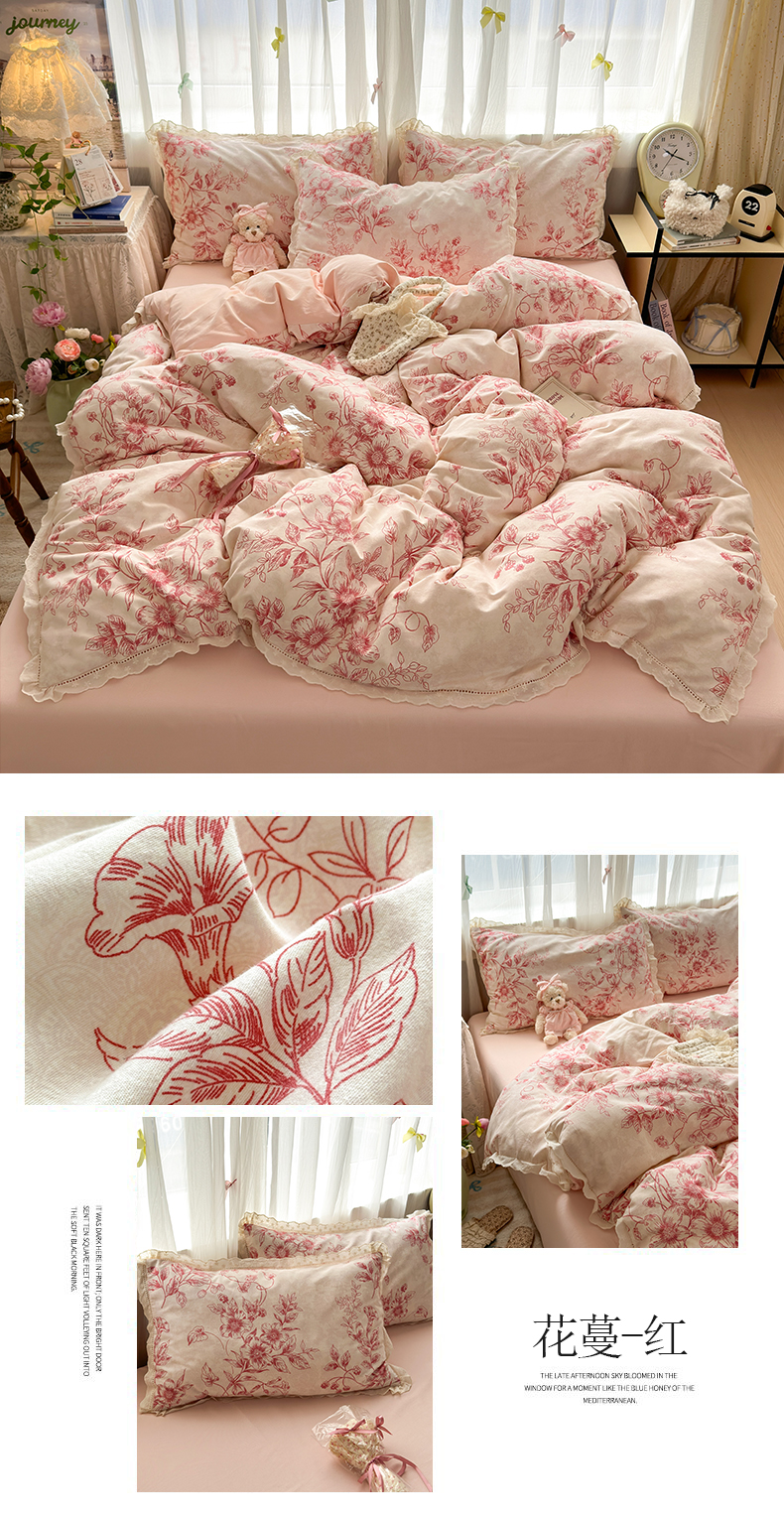 (总)简宜家居(朝初家纺) 2026新款13070全棉纯棉40支斜纹蕾丝四件套,初朵,粉桃小花,含苞蔷薇,花田小兔,橘果团子,蓝调花册,奶白萄笺,青柠果络