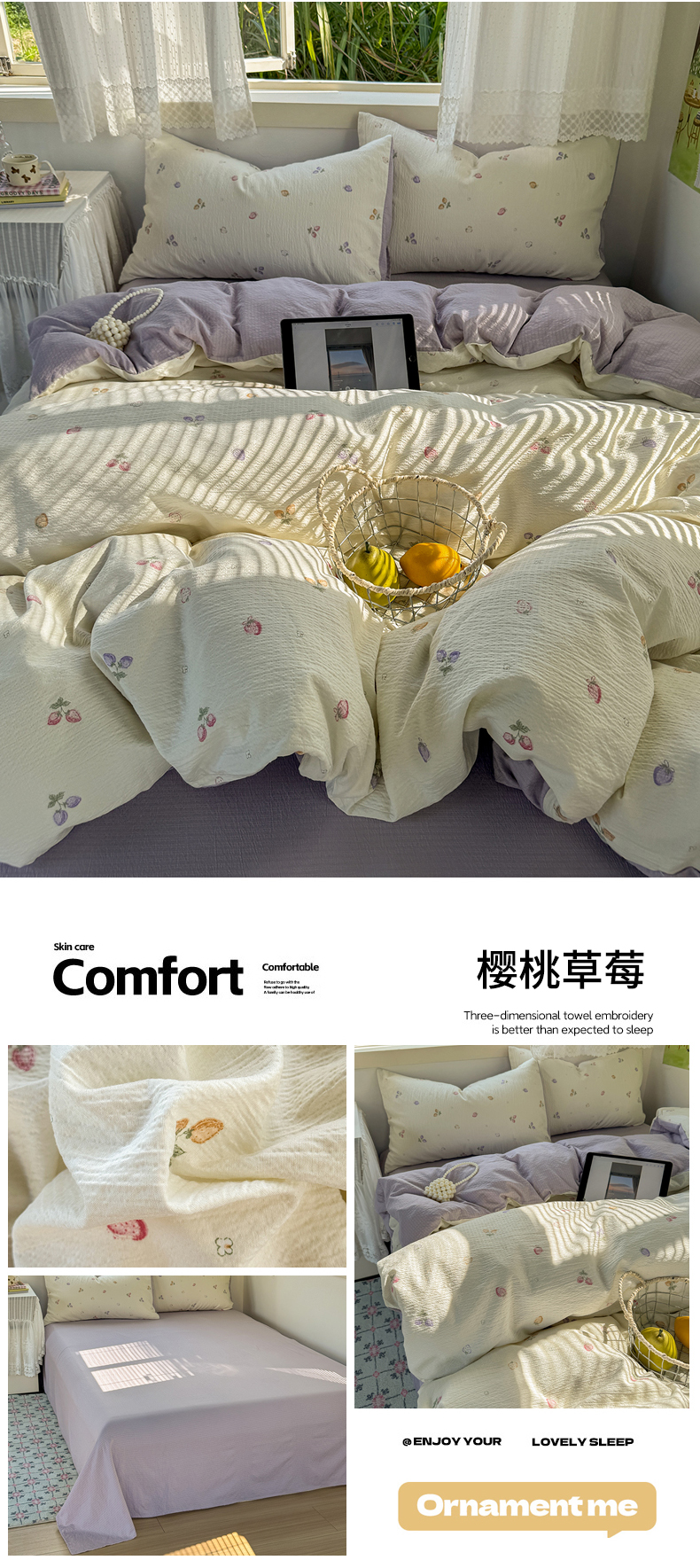 当前位置: 91家纺网 > 商品网购 > 床品套件 > 四件套 > 化纤活性四件套 > 优兰朵 2025新款超柔云感木棉印花小清新四件套 樱桃草莓