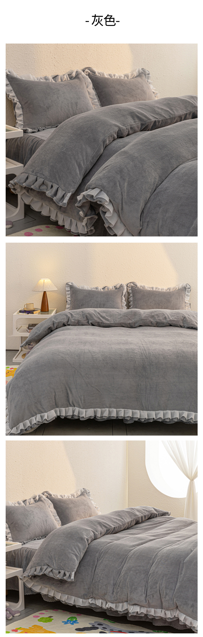 当前位置: 91家纺网 > 商品网购 > 床品套件 > 四件套 > 牛奶绒四件套 > 恩和家纺 2025新款白色薄纱双层飞边牛奶绒四件套 灰色