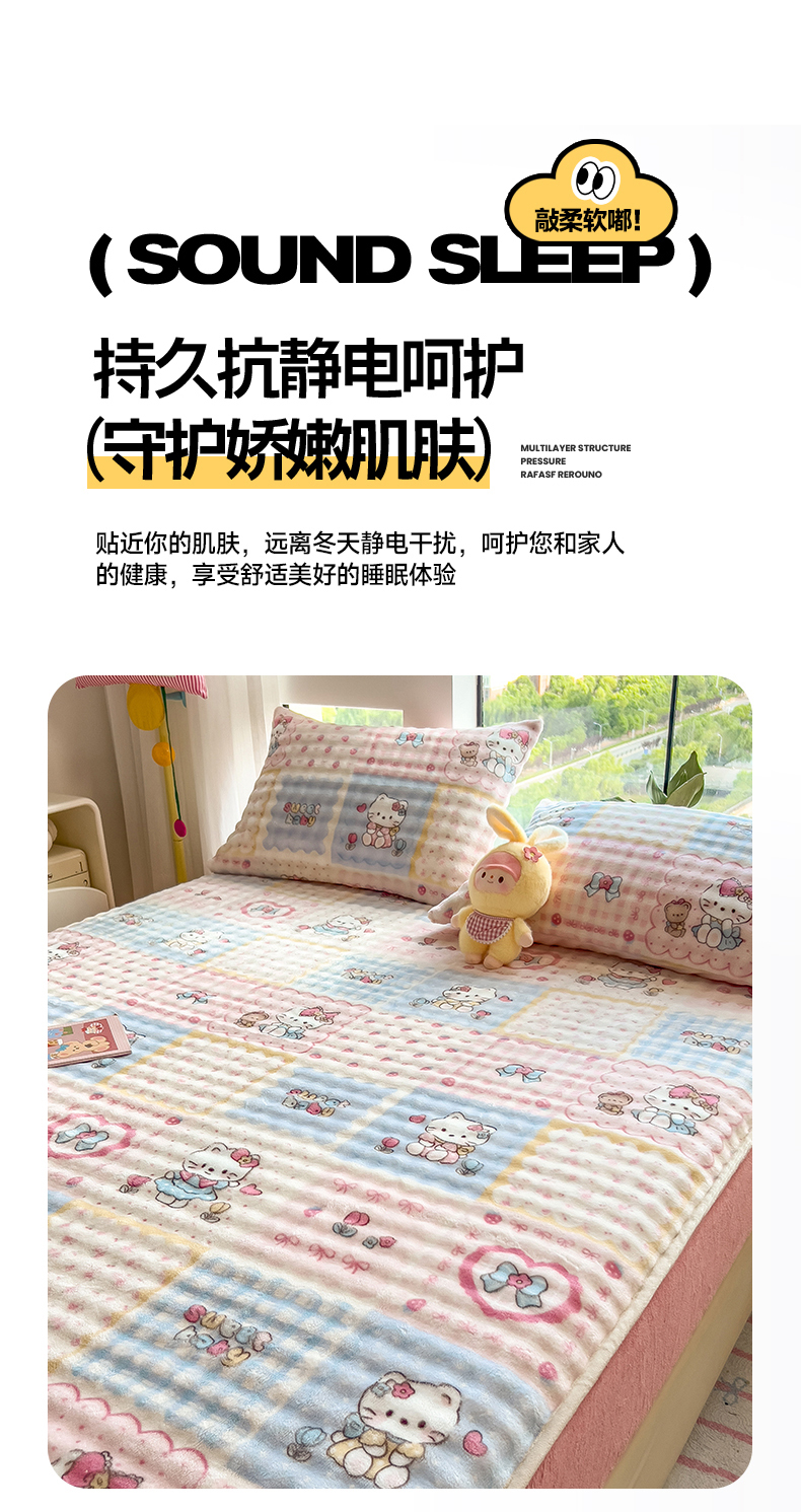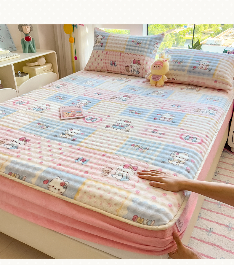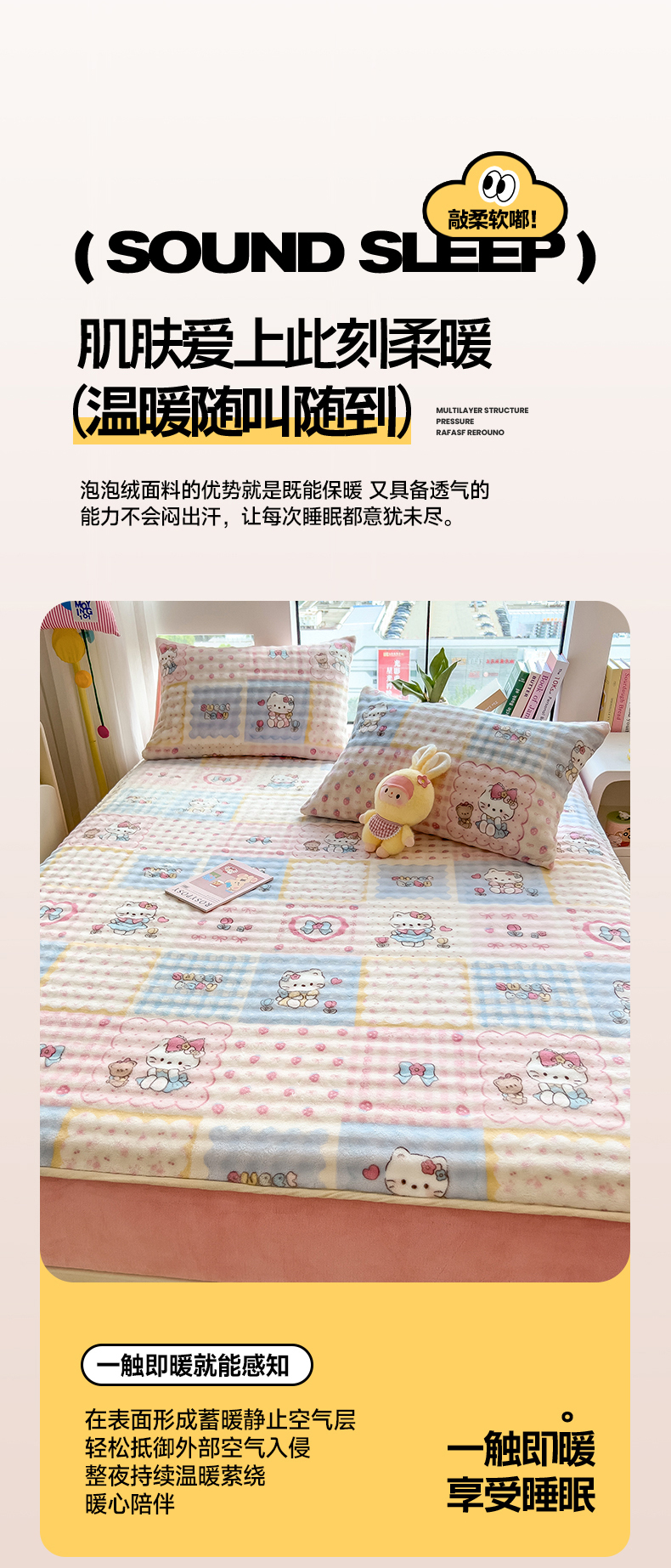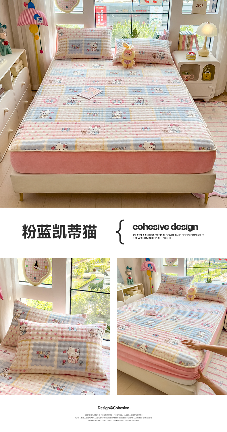 • 91家纺网 家纺一手货源 找家纺 摩妮卡 2025新款加厚牛奶绒泡泡绒床笠三件套 粉蓝凯蒂猫