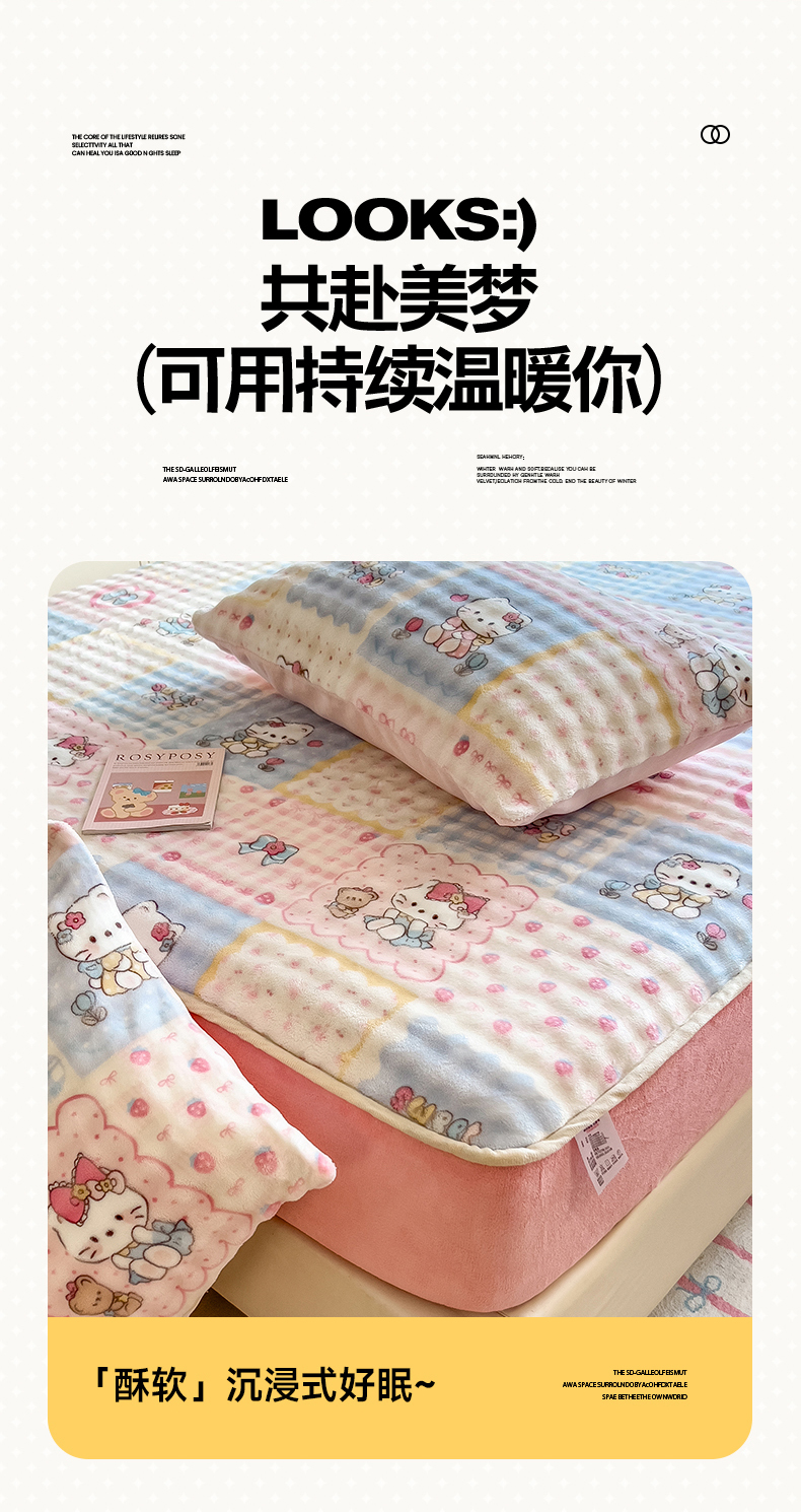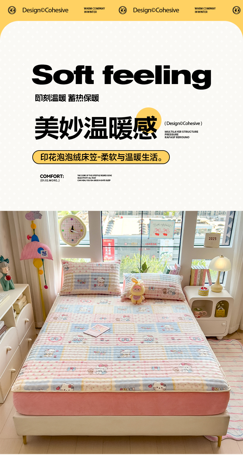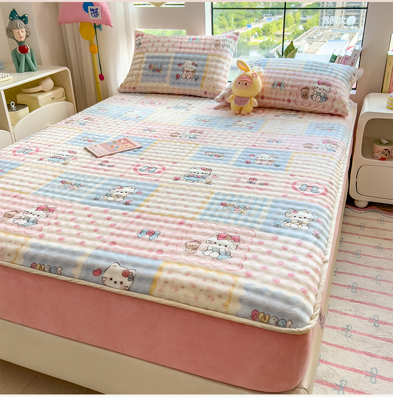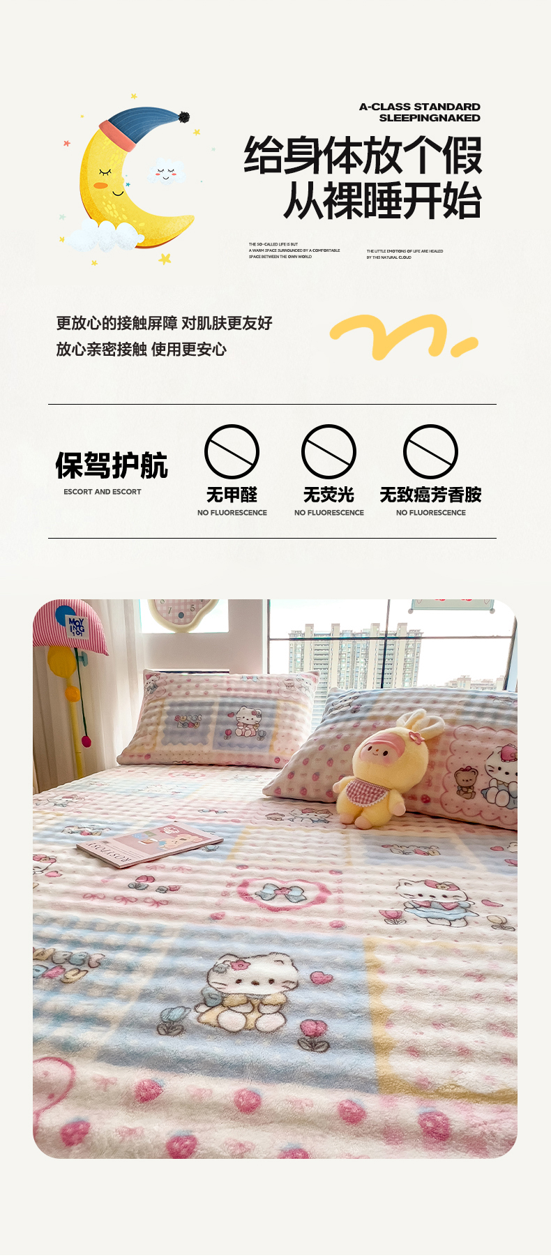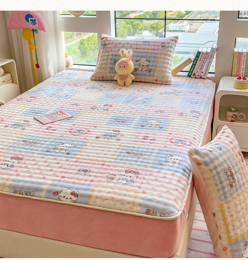 • 91家纺网 家纺一手货源 找家纺 摩妮卡 2025新款加厚牛奶绒泡泡绒床笠三件套 粉蓝凯蒂猫