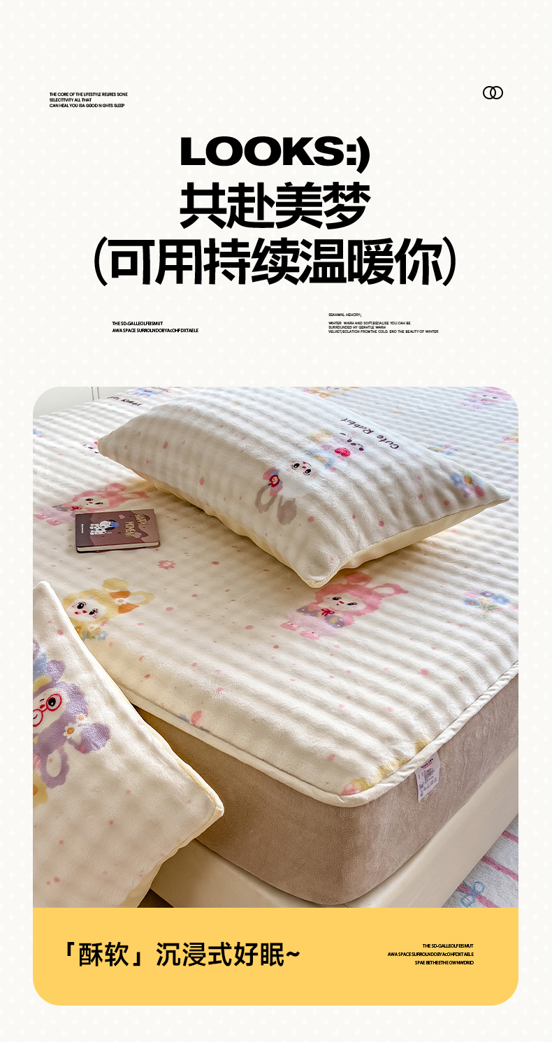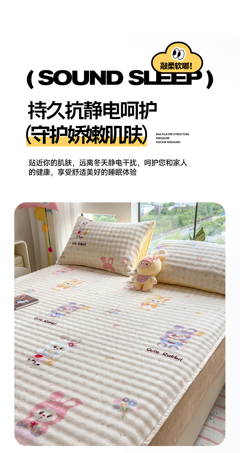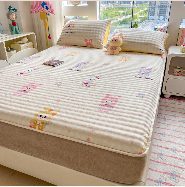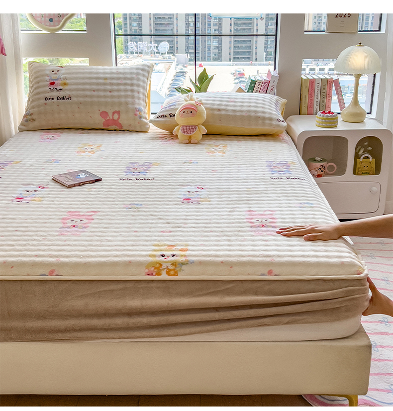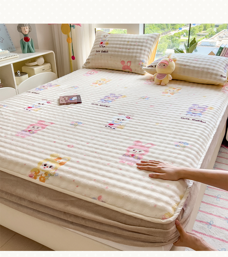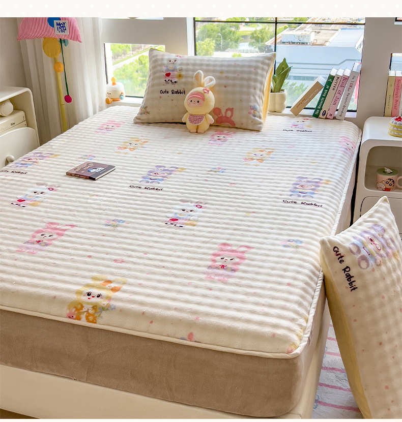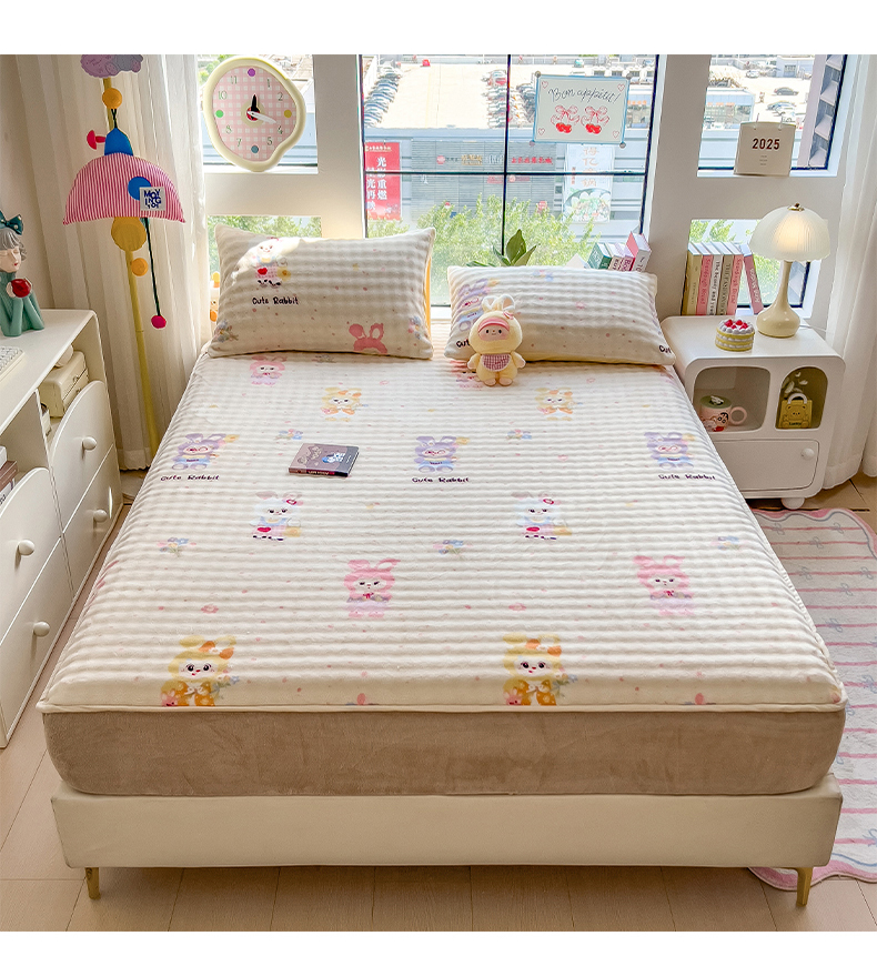 • 91家纺网 家纺一手货源 找家纺 摩妮卡 2025新款加厚牛奶绒泡泡绒床笠三件套 兔兔聚会