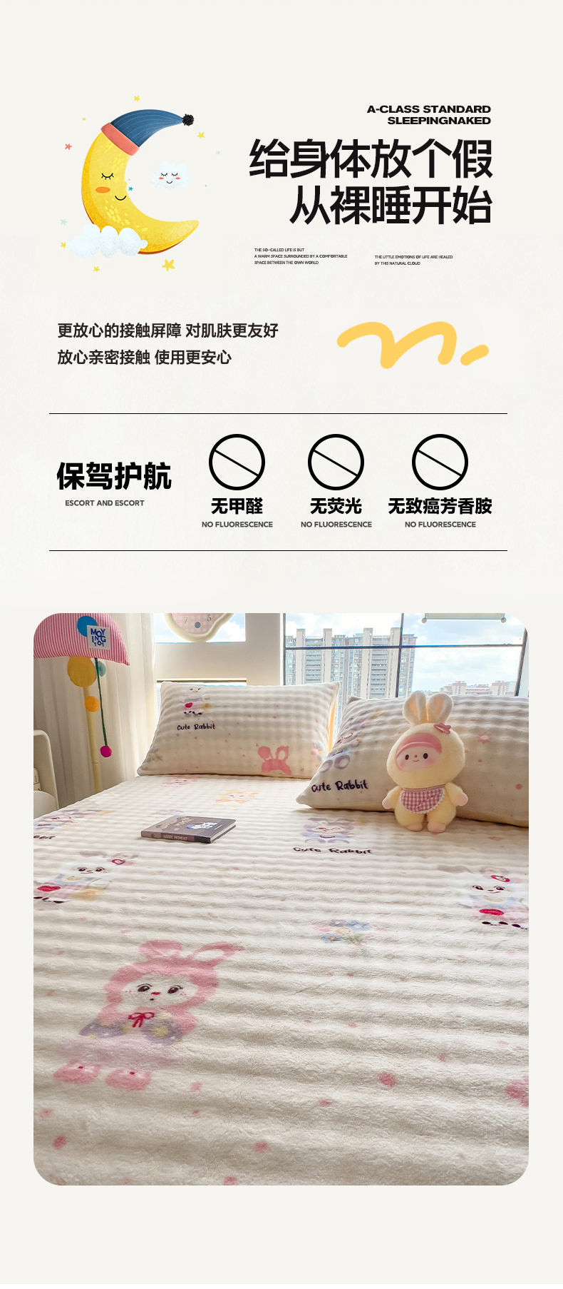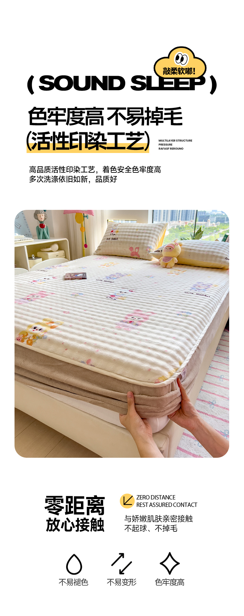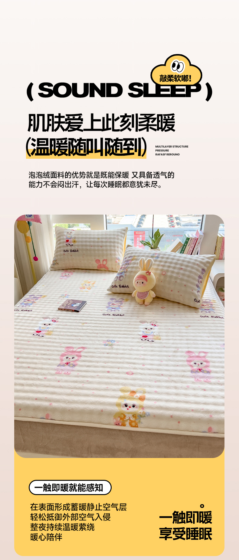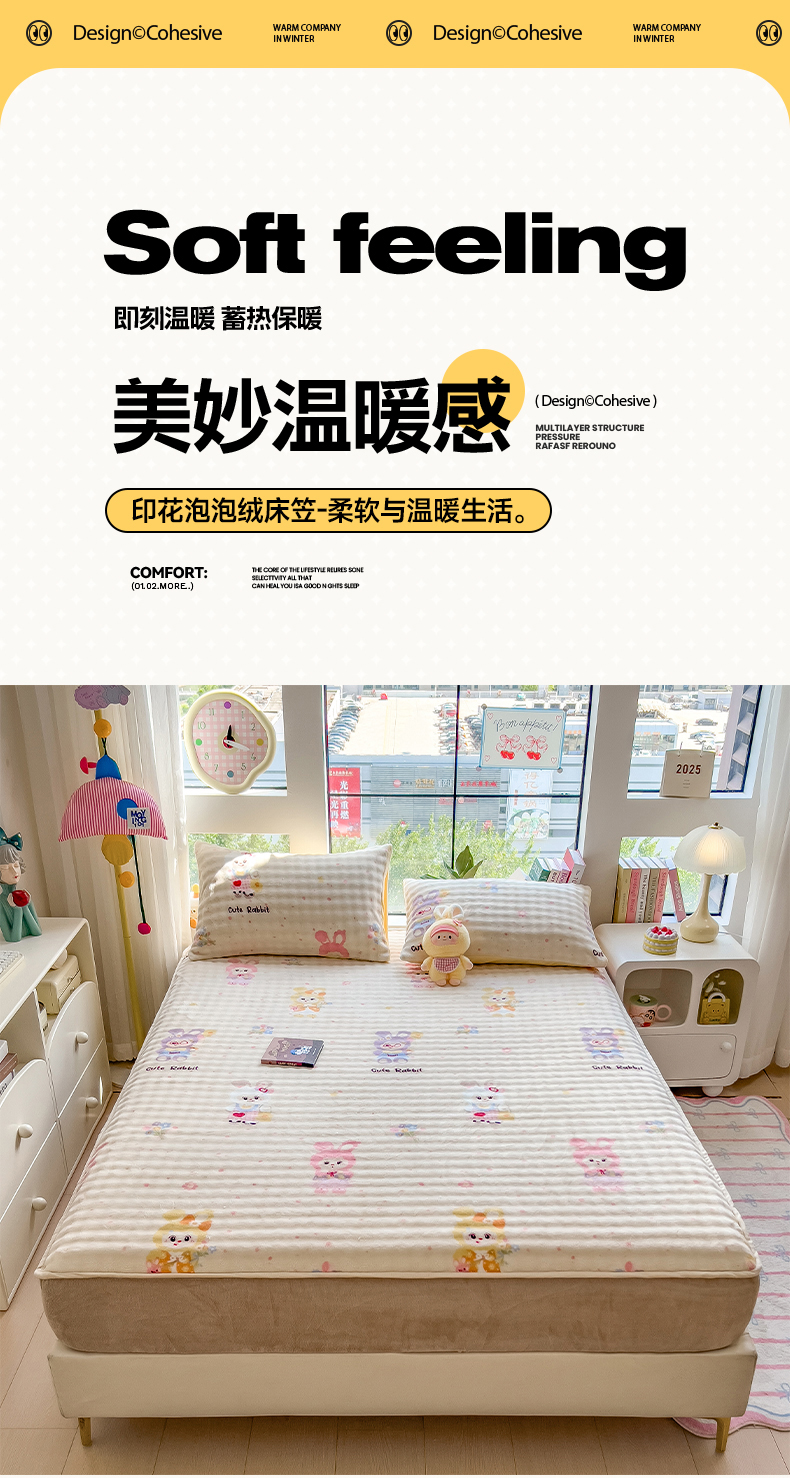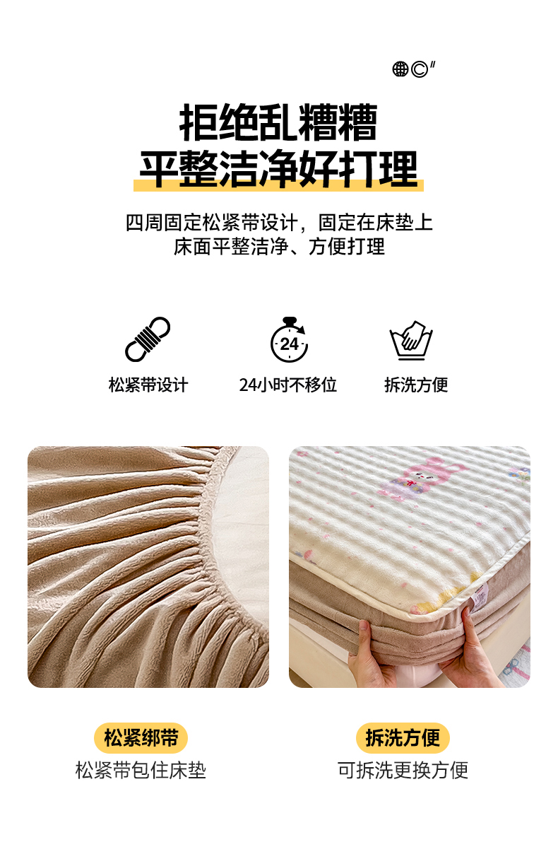 • 91家纺网 家纺一手货源 找家纺 摩妮卡 2025新款加厚牛奶绒泡泡绒床笠三件套 兔兔聚会