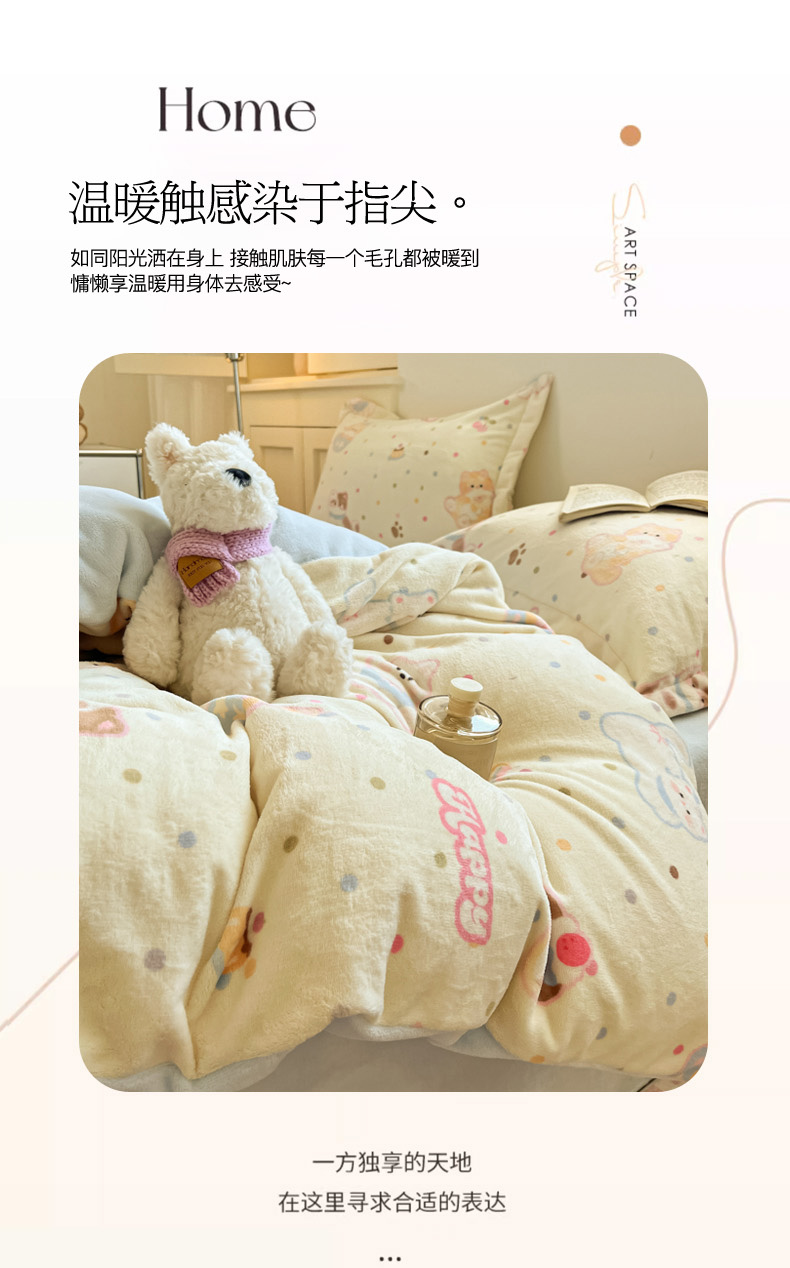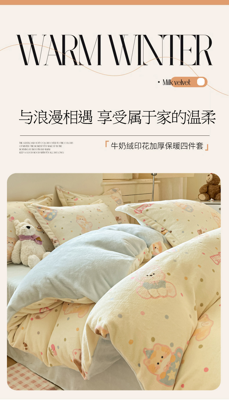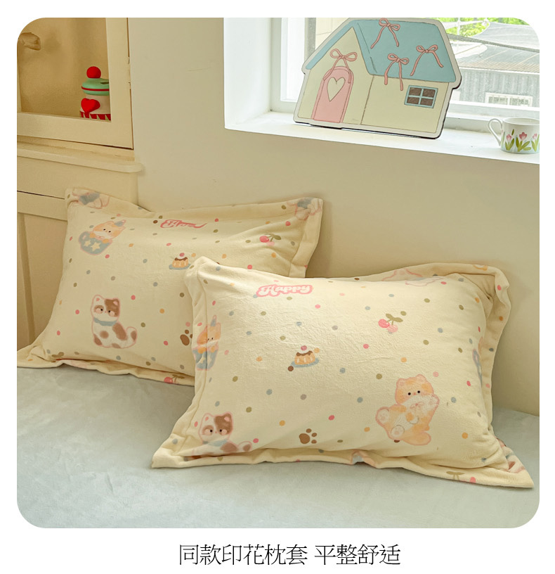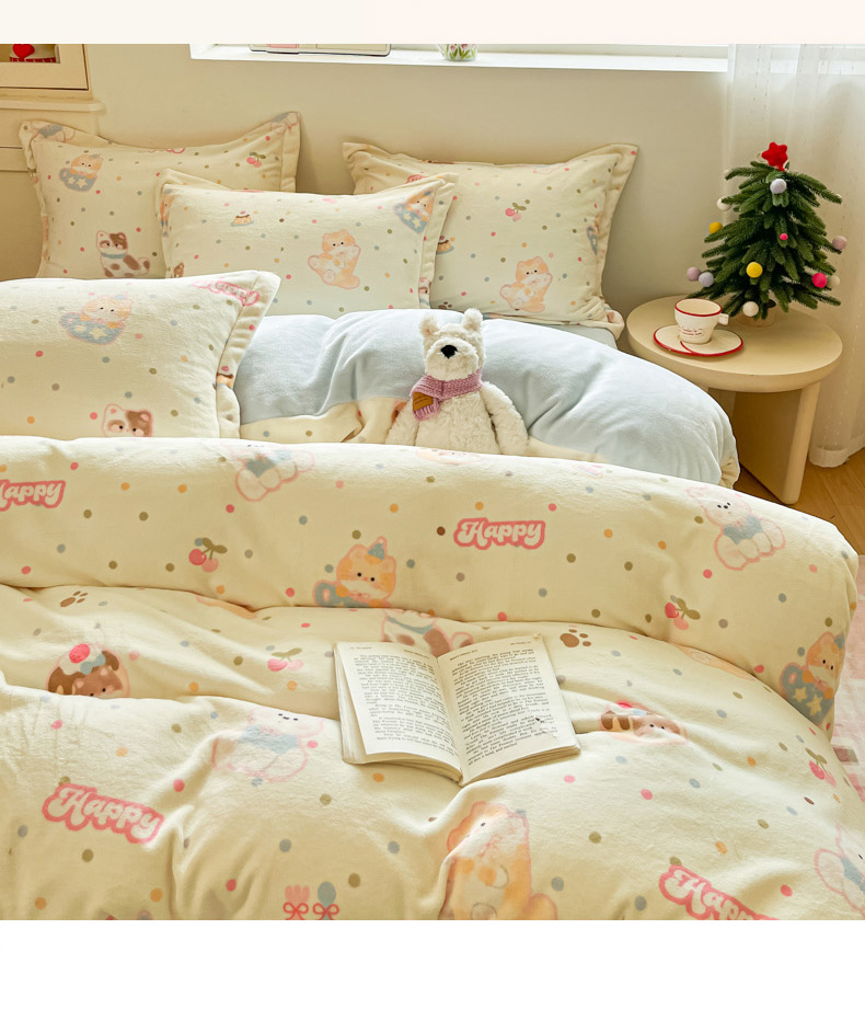 当前位置: 91家纺网 > 商品网购 > 床品套件 > 四件套 > 牛奶绒四件套 > 柒月家居 2025新款高克重牛奶绒印花加厚保暖四件套 波点萌宝