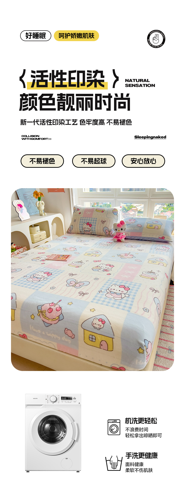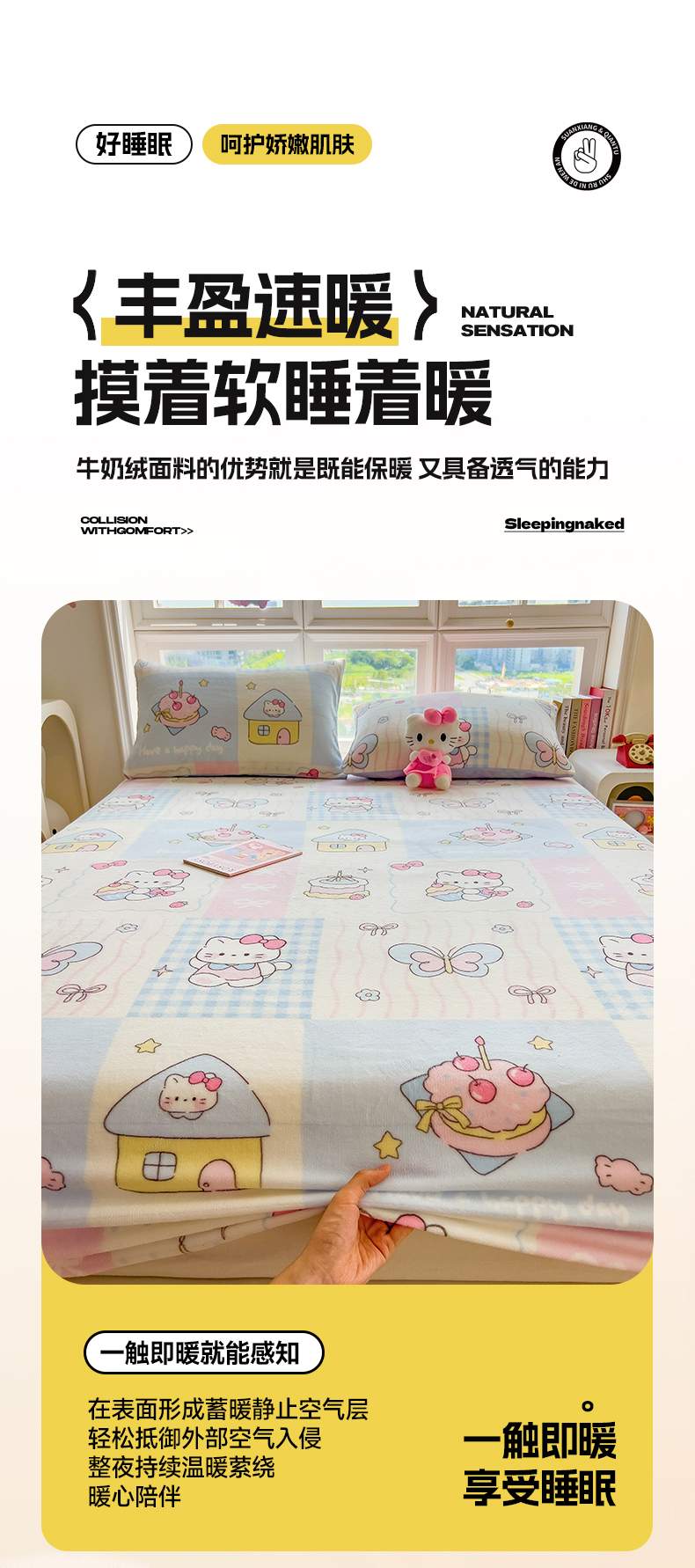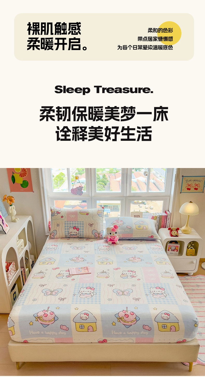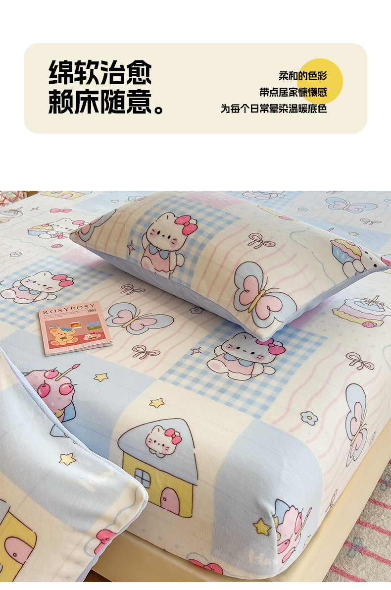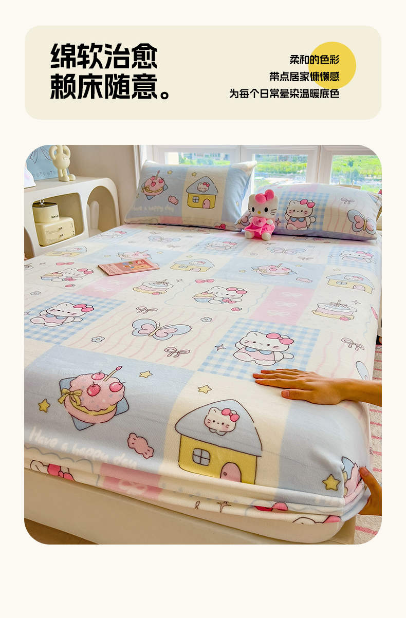 • 91家纺网 家纺一手货源 找家纺 摩妮卡 2025新款印花系列小清新牛奶绒印花床笠三件套 猫咪乐园