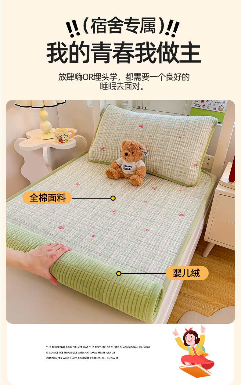 梵朴 2025新款A类棉加绒一面纯棉一面宝宝婴儿牛奶绒双面可用床盖学生宿舍床垫炕盖-学生床图 薄荷糖樱桃