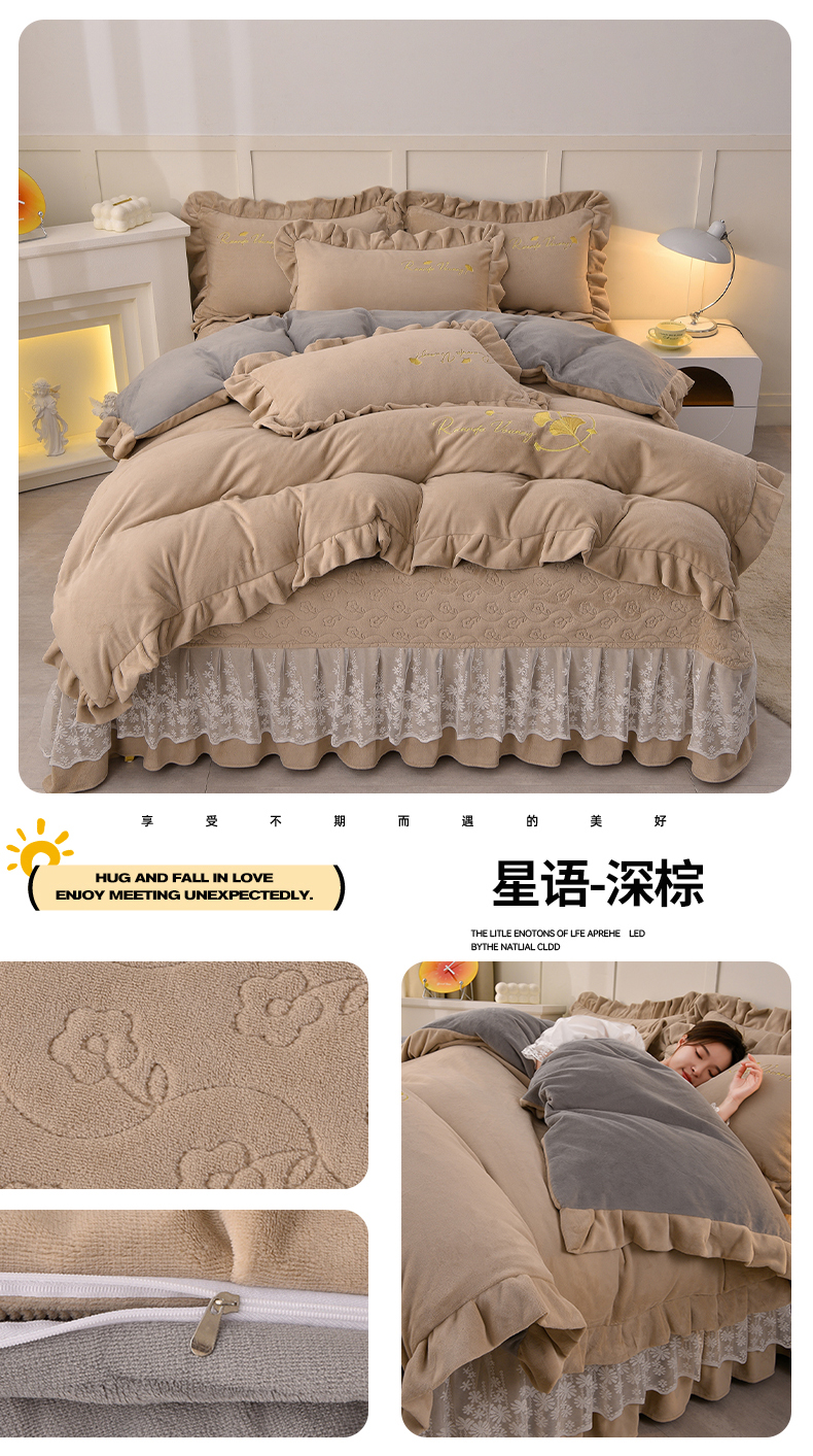 商品名称:湘雪家居 2025新款高克重纯色刺绣牛奶绒床盖款星语系列四件套-提供买家秀 星语款-卡琪色