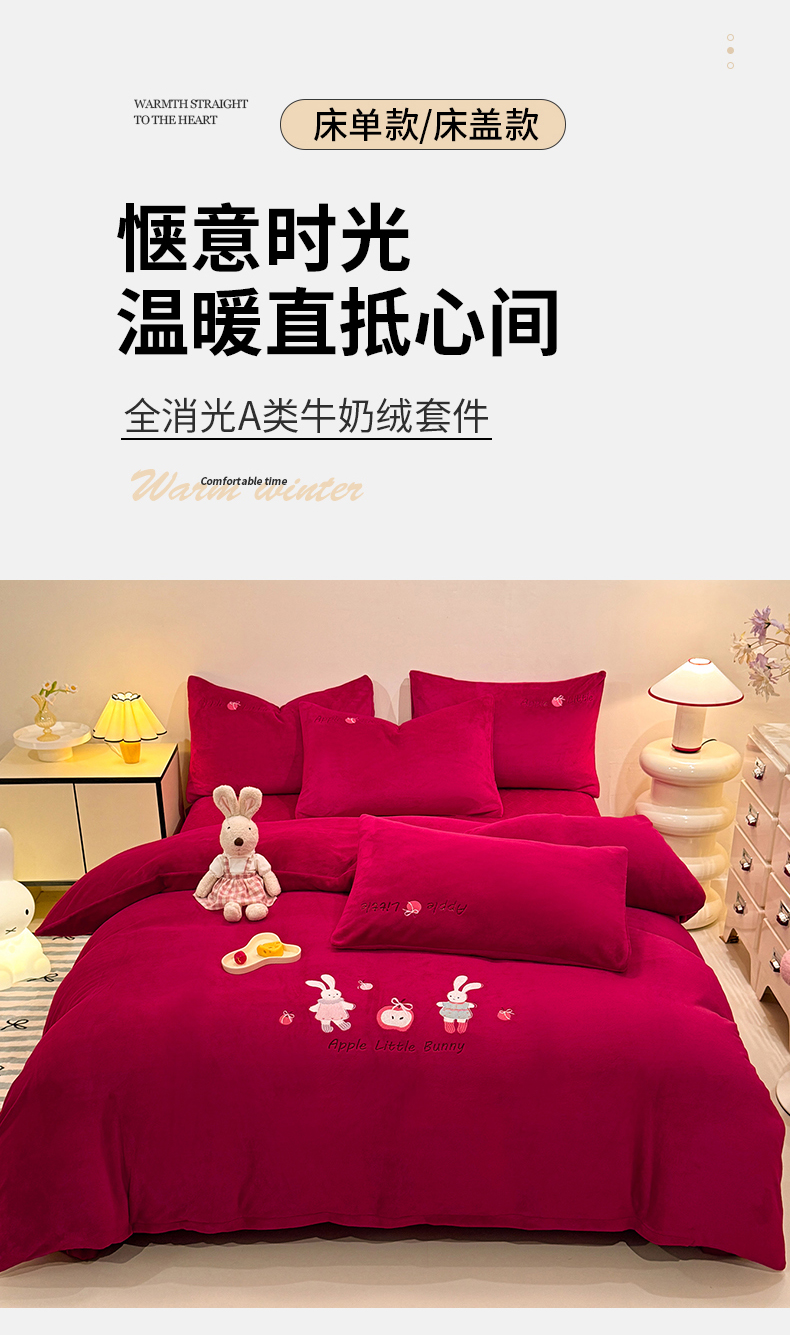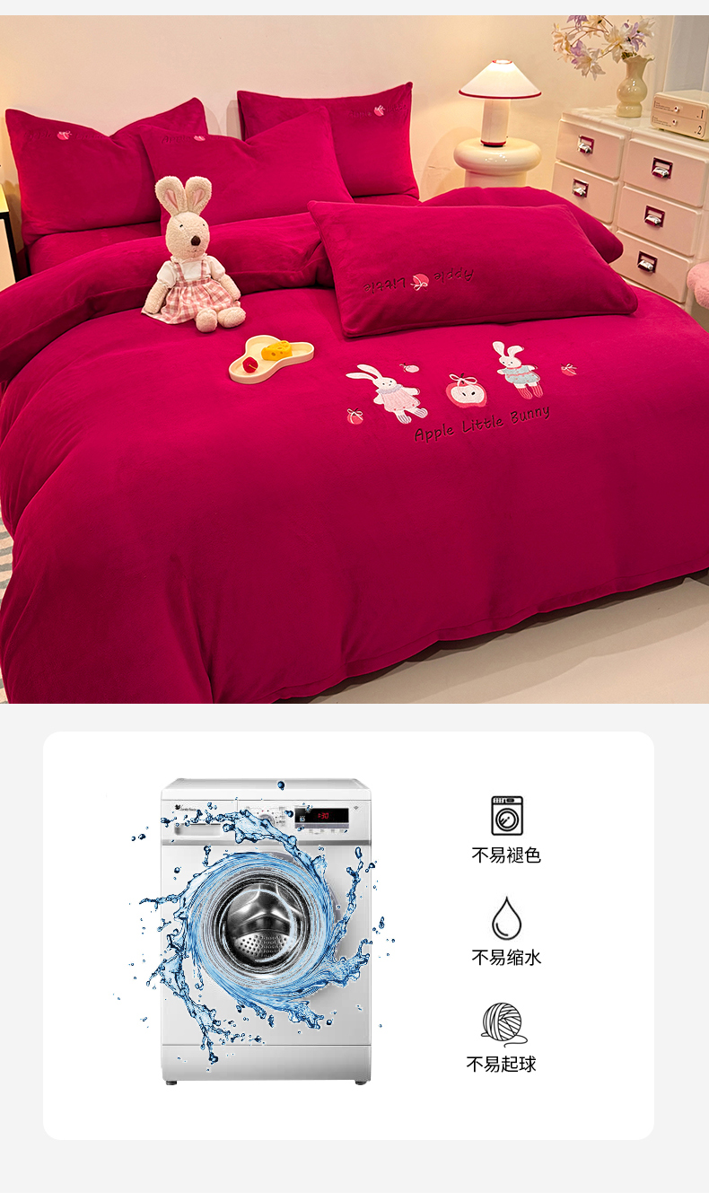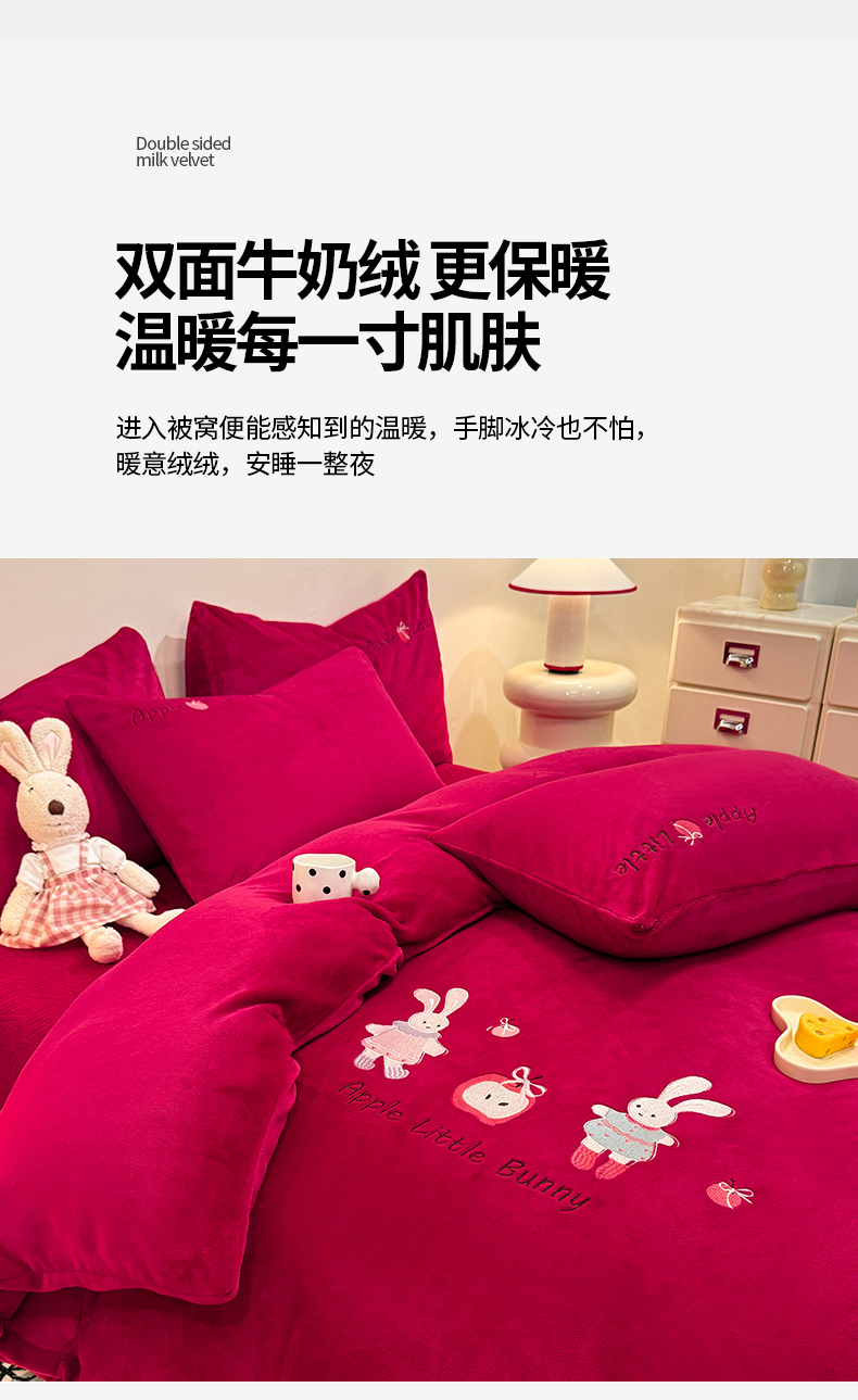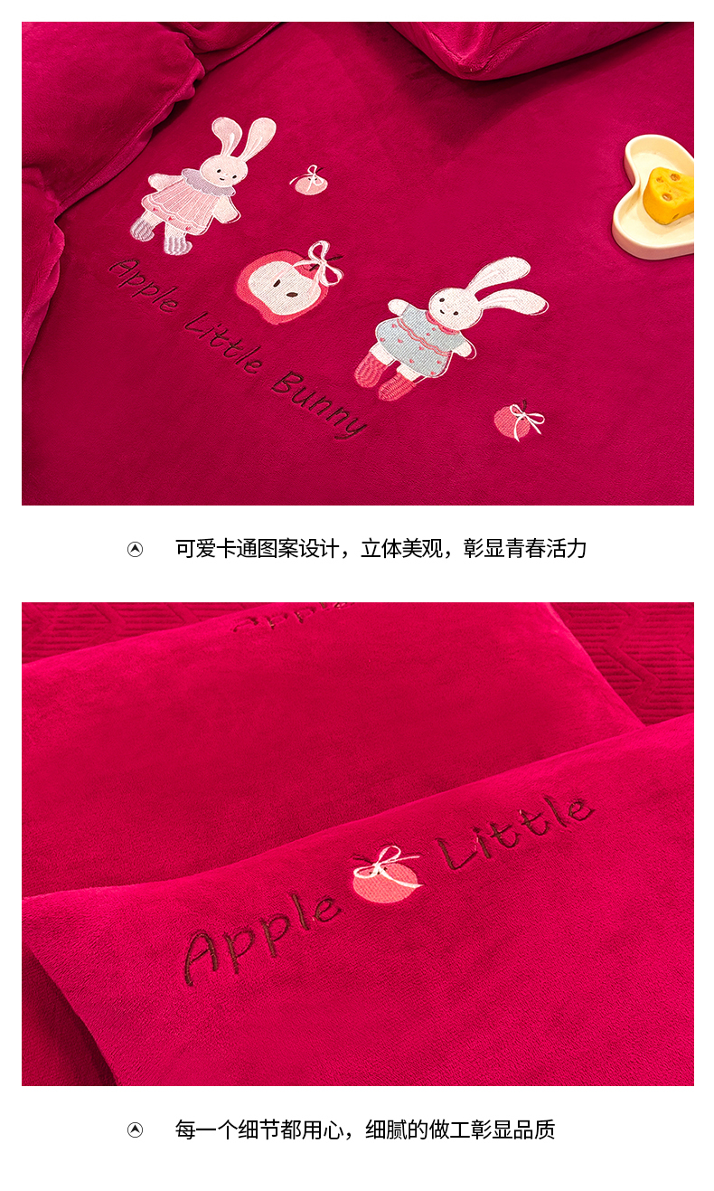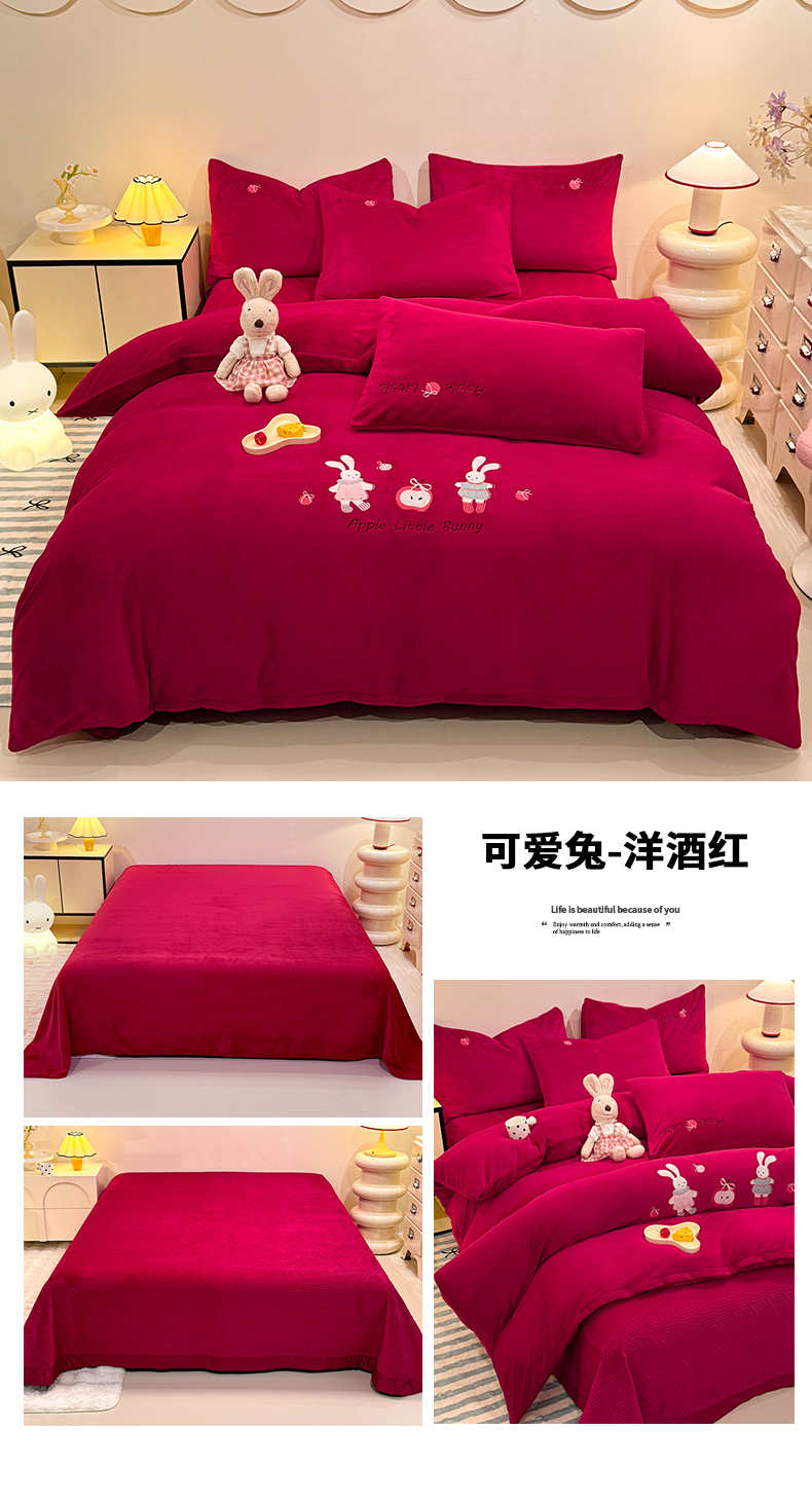 当前位置: 91家纺网 > 商品网购 > 床品套件 > 四件套 > 牛奶绒四件套 > 新方向 2025新款全消光A类刺绣牛奶绒四件套-可爱兔 可爱兔-洋酒红