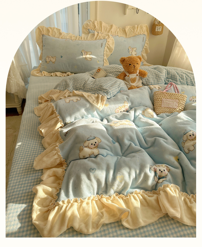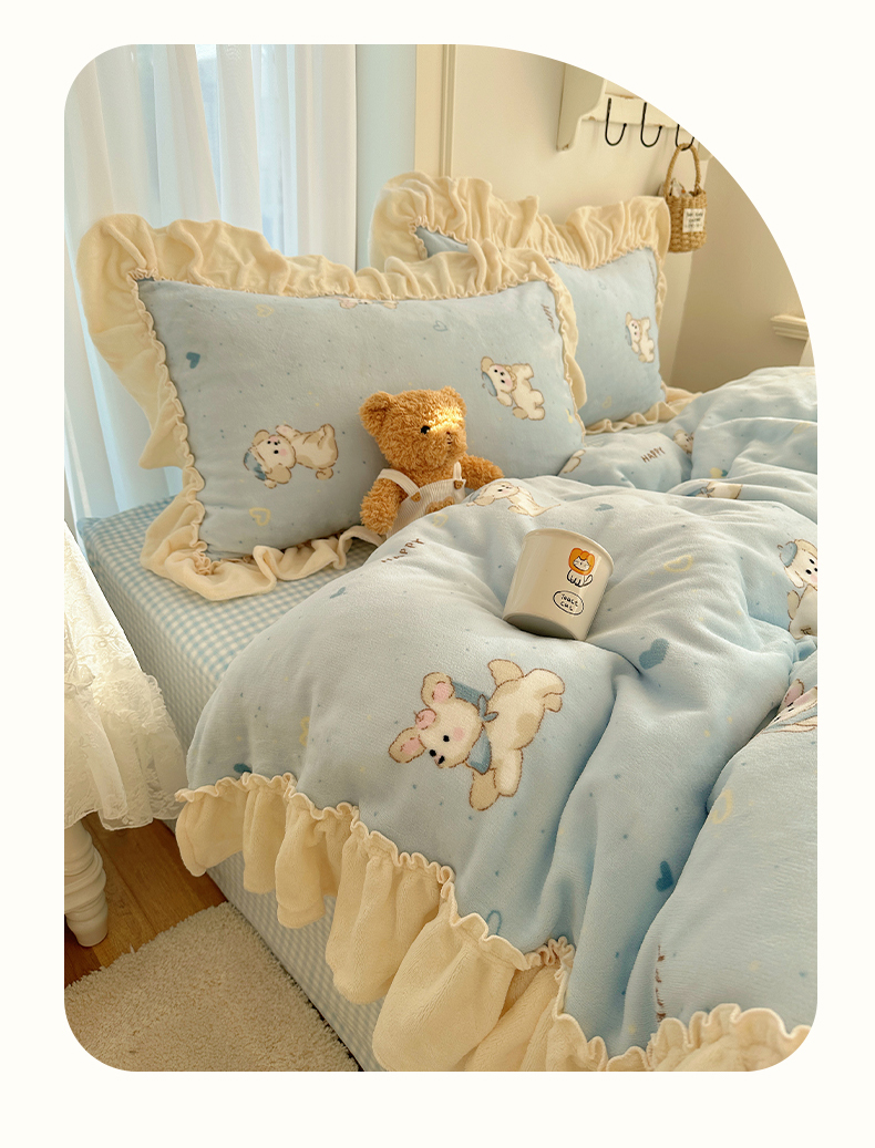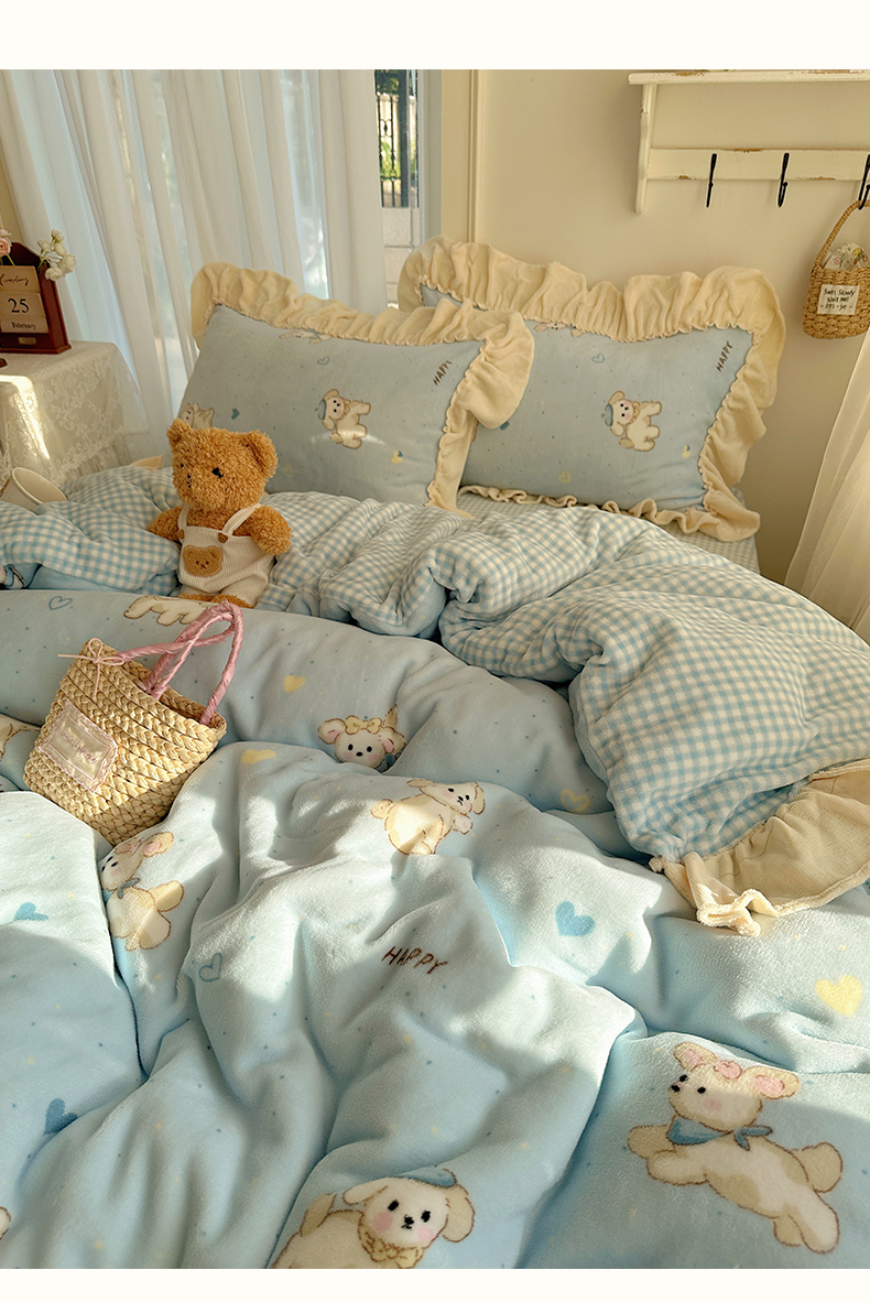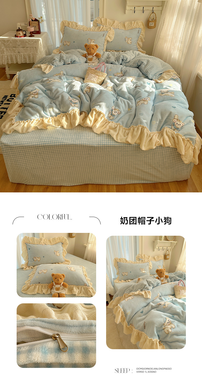 当前位置: 91家纺网 > 商品网购 > 床品套件 > 四件套 > 牛奶绒四件套 > 瑞莱 上新2025年秋冬新款A类200克牛奶绒卡通印花四件套 奶团帽子小狗