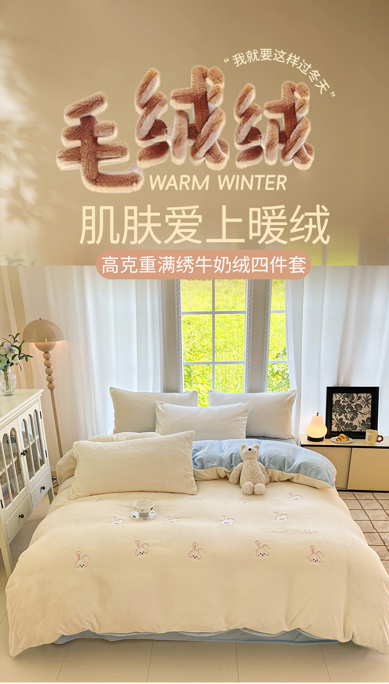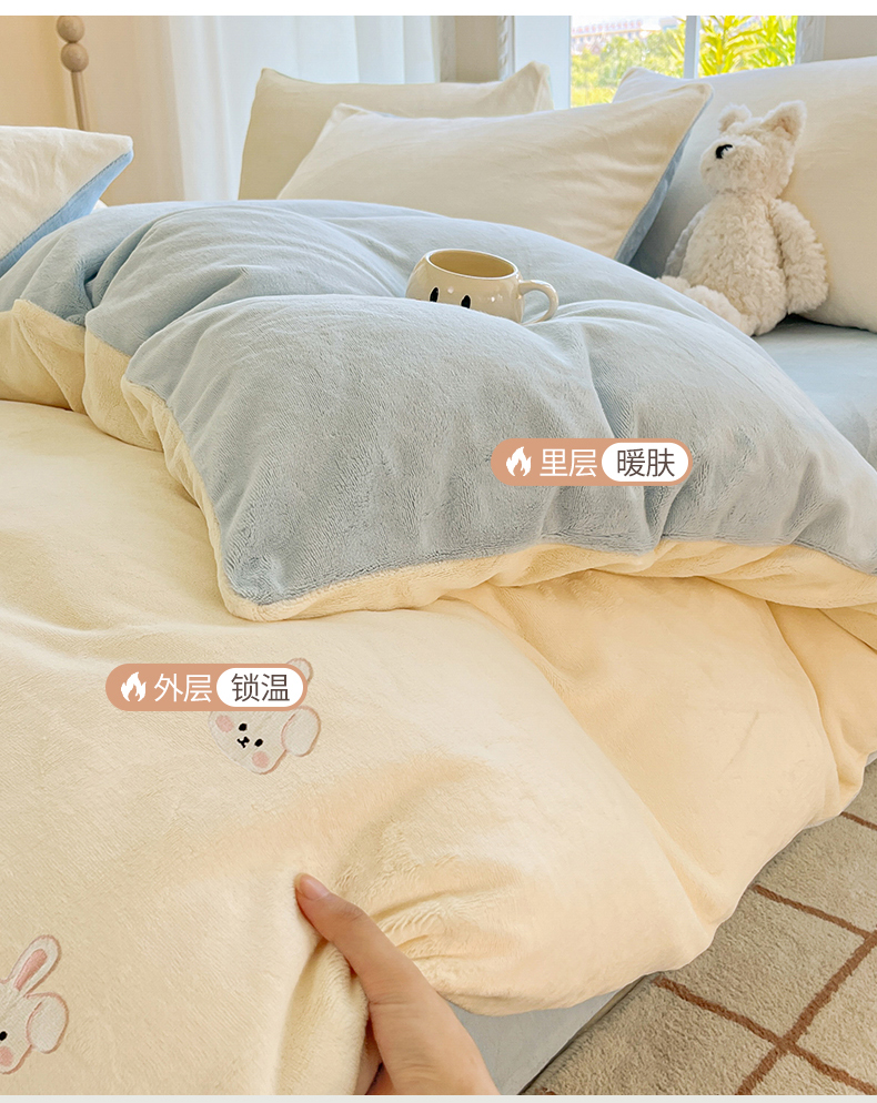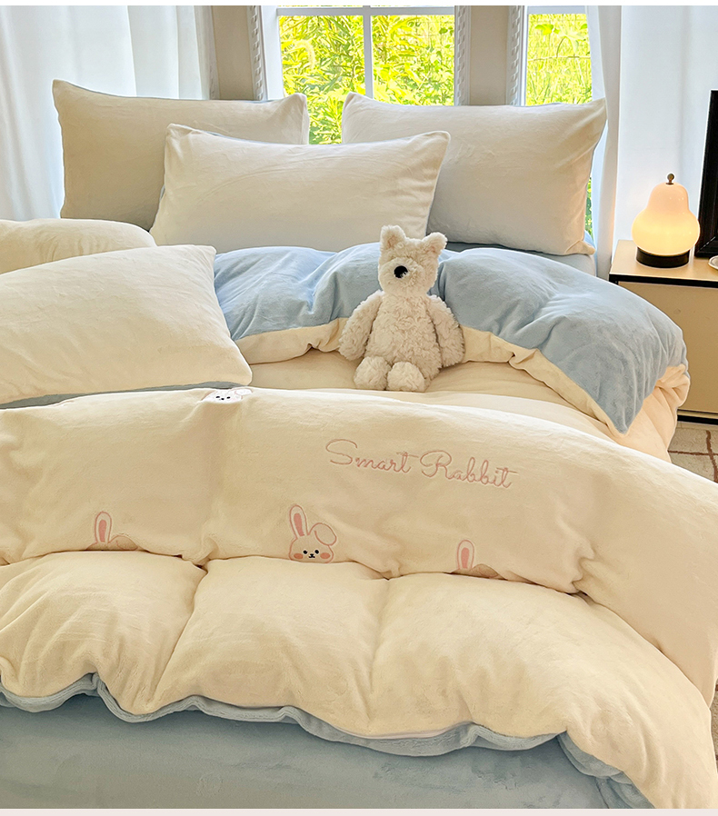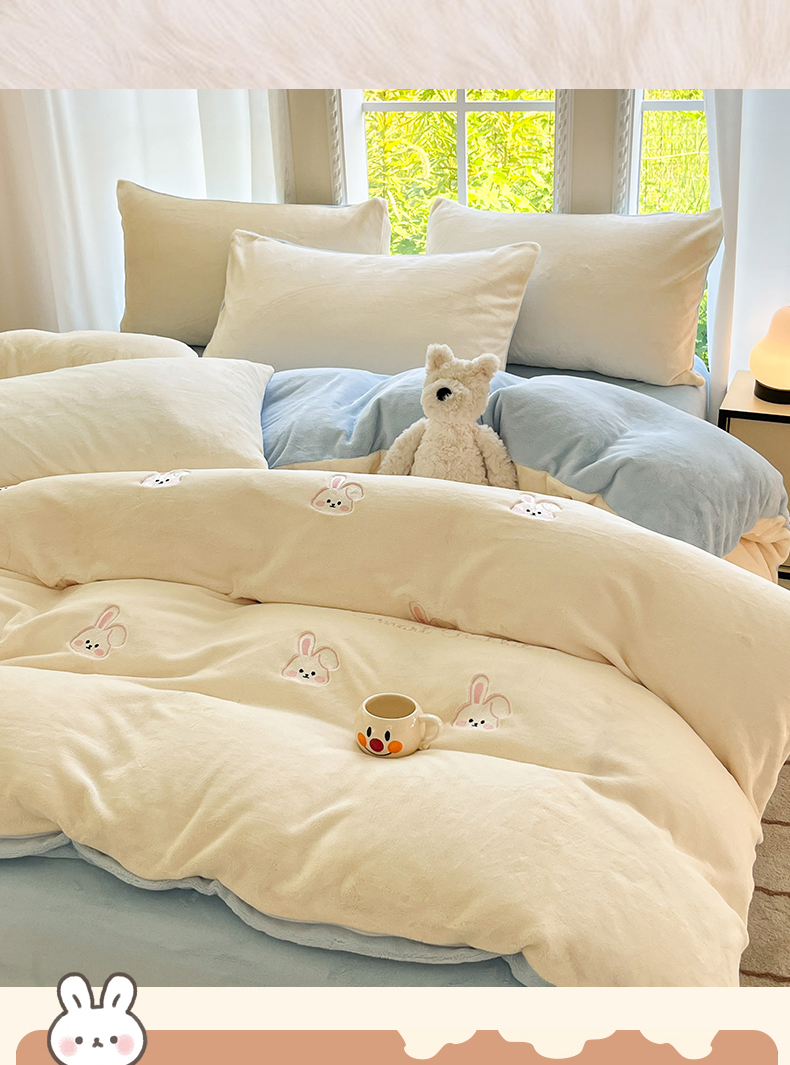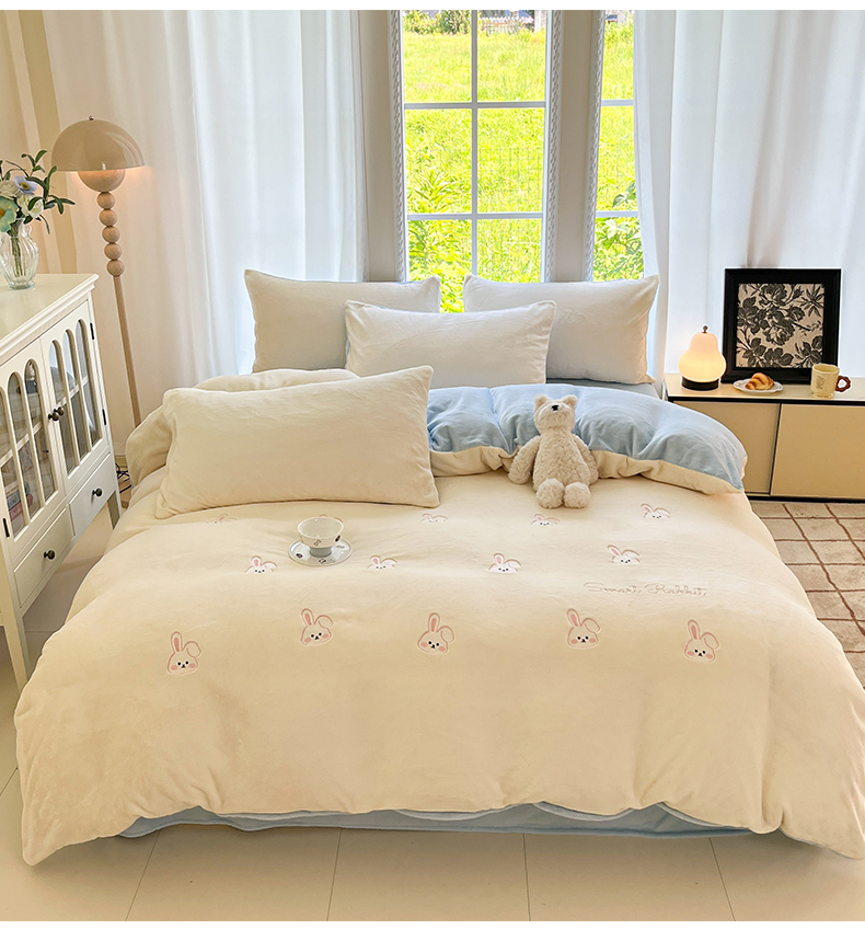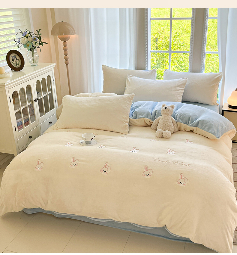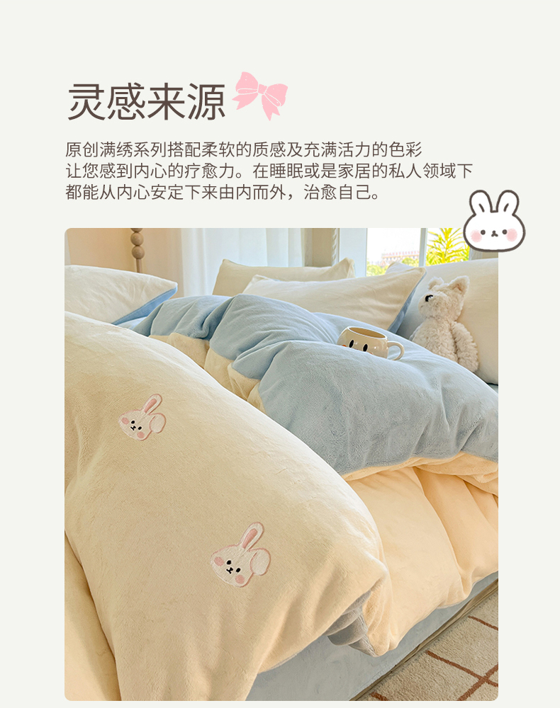 云棉坊 2025新款高克重牛奶绒四件套-满绣系列 可爱兔-奶白蓝