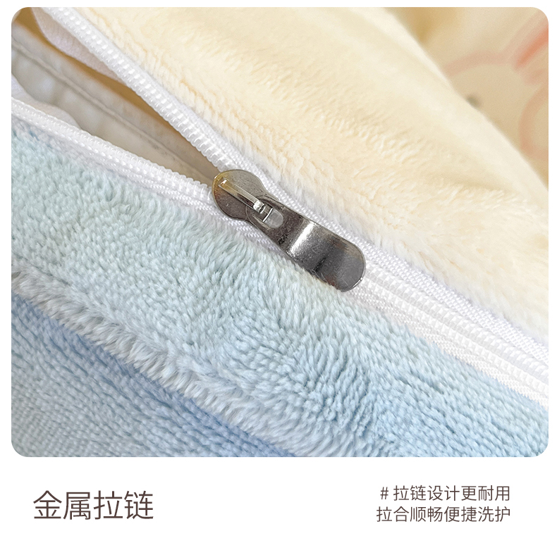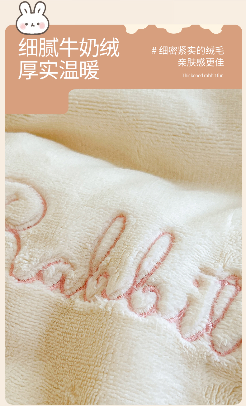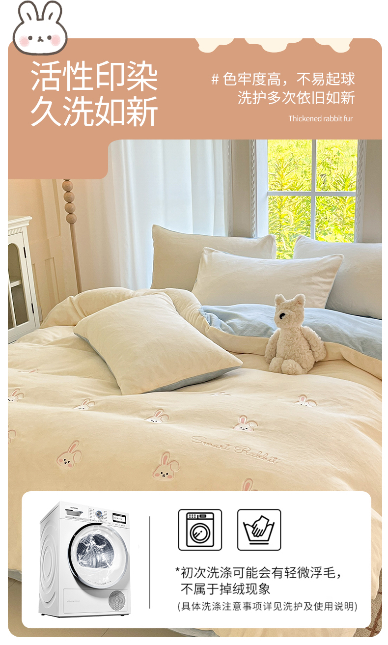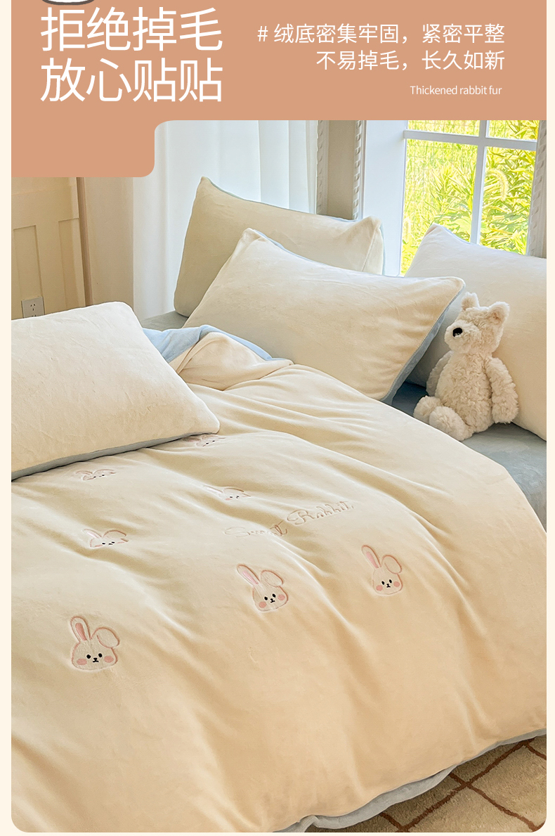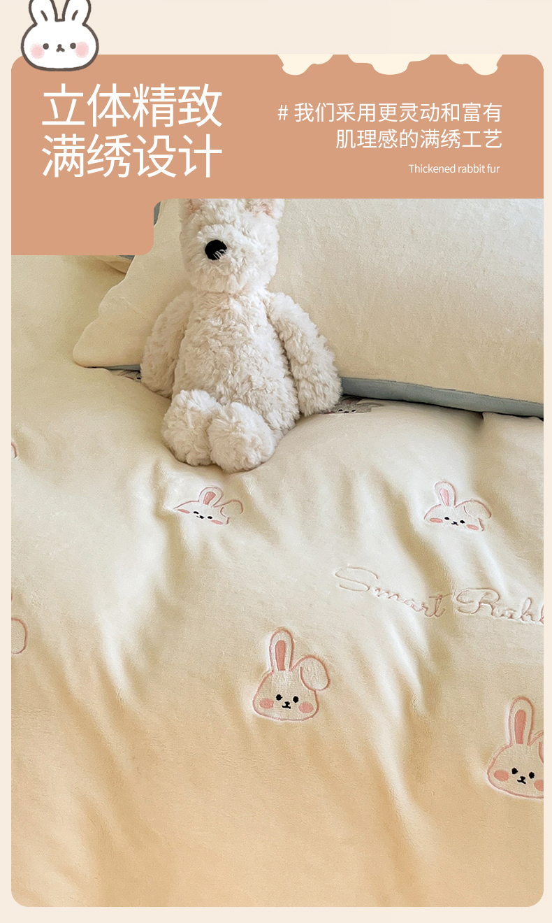 商品名称:云棉坊 2025新款高克重牛奶绒四件套-满绣系列 可爱兔-奶白蓝