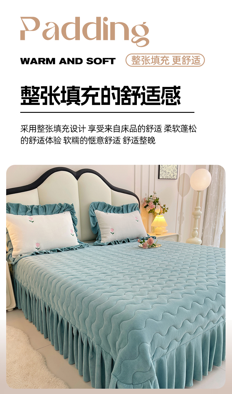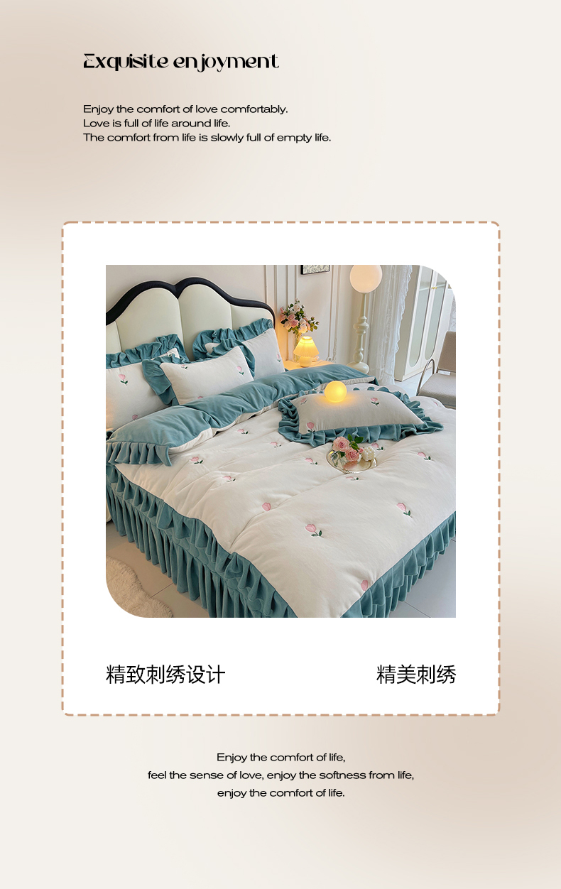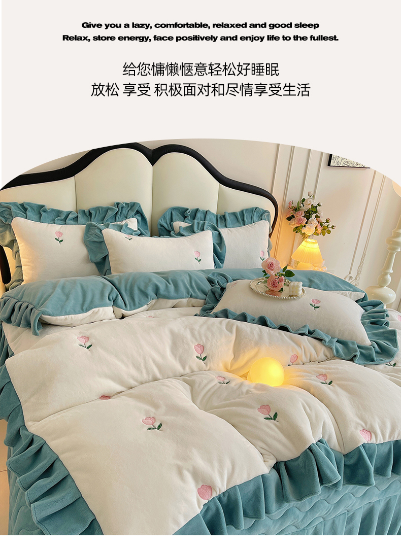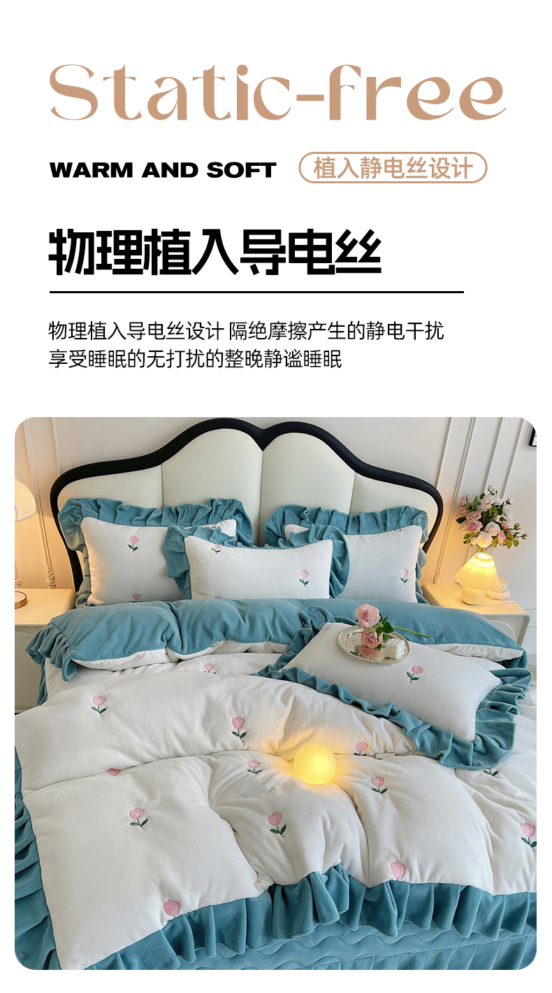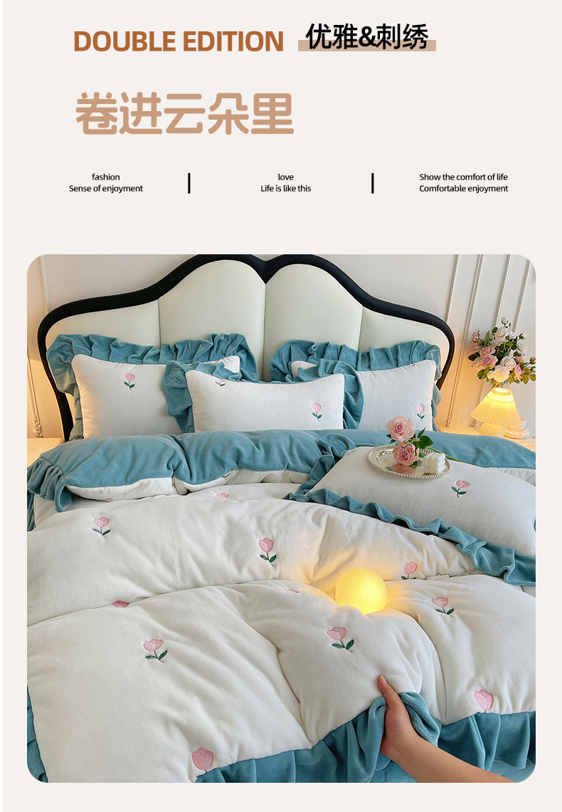 商品名称:茉保家纺 2025新款高克重9.5斤婴儿绒牛奶绒绣花夹棉床盖四件套 郁金香-白拼蓝