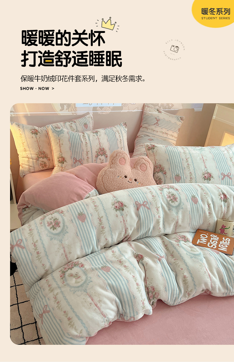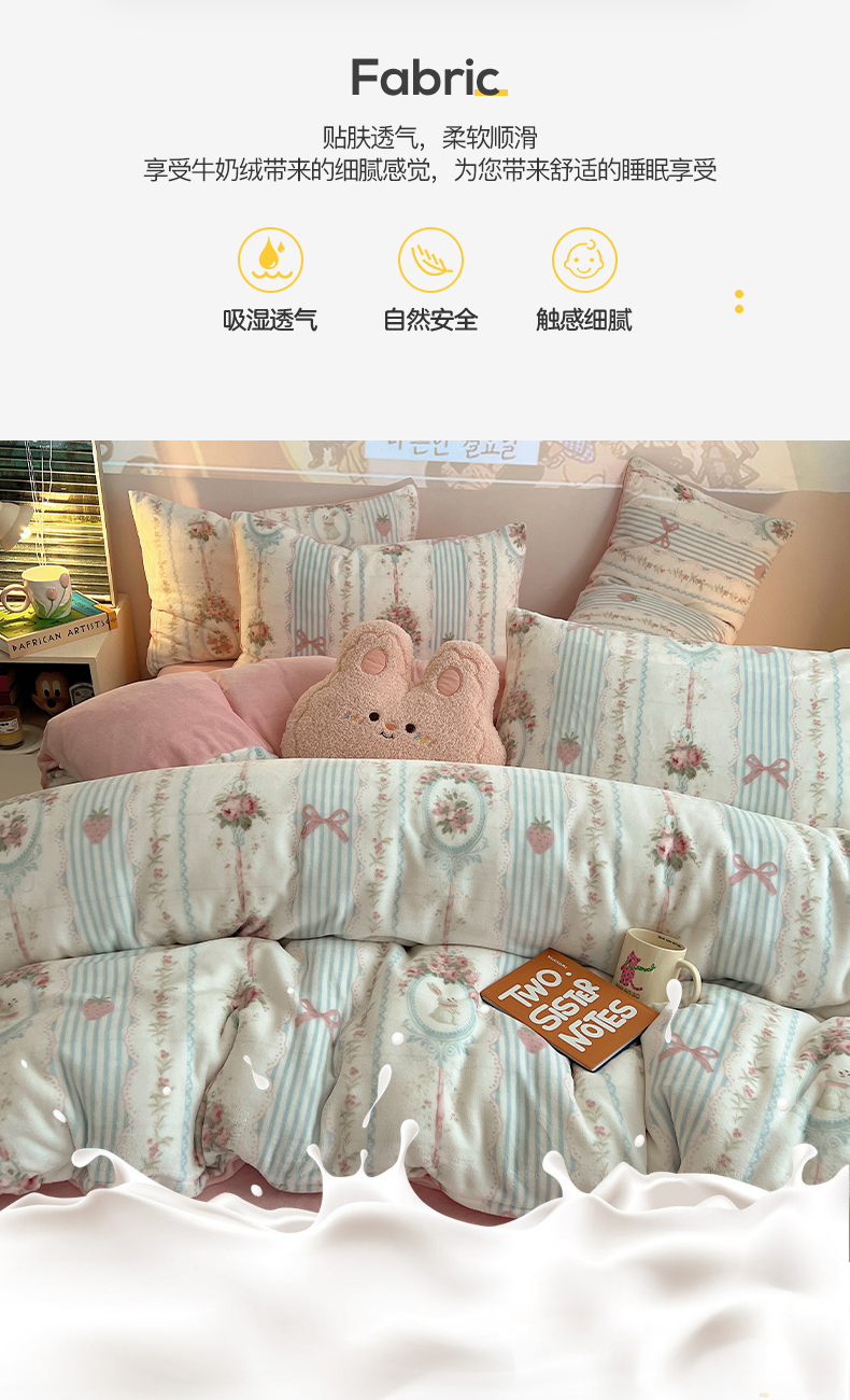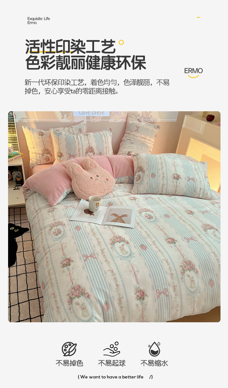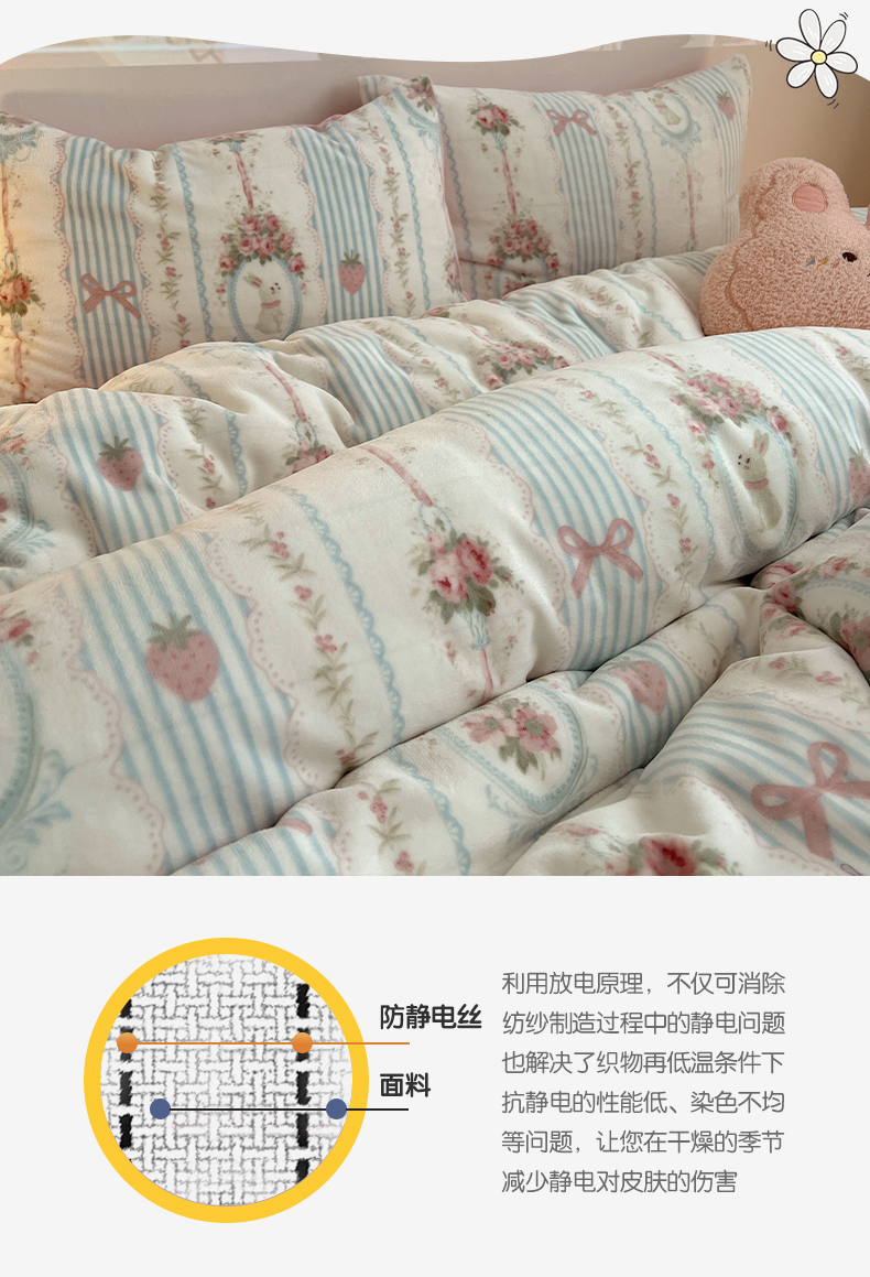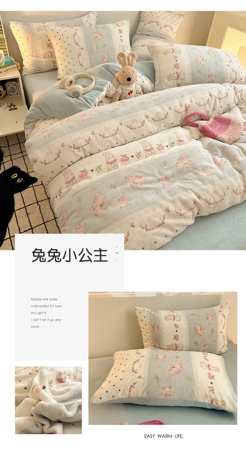 商品名称:瑞莱 2025新款A类200克高克重秋冬印花牛奶绒四件套-卡通系列 花环兔