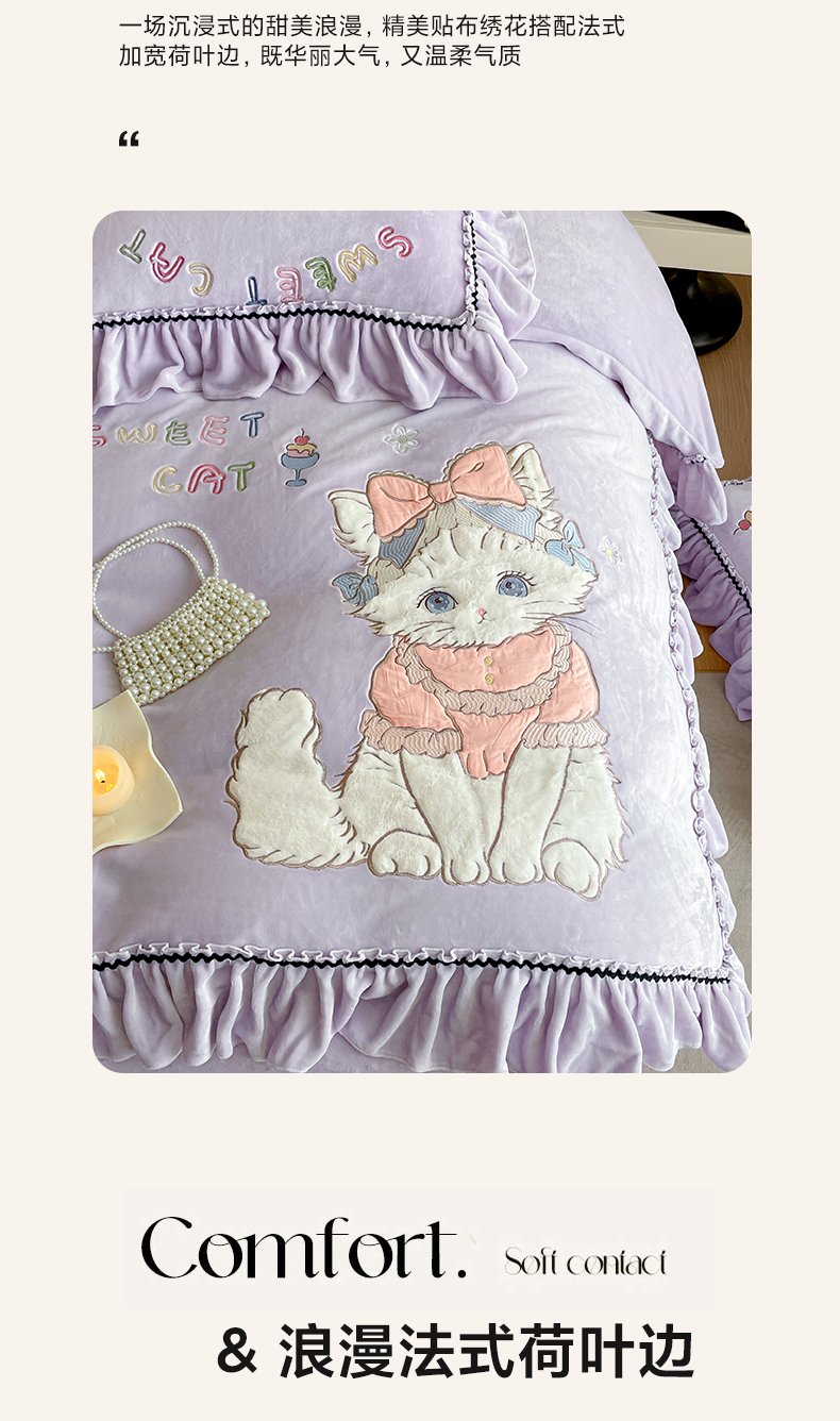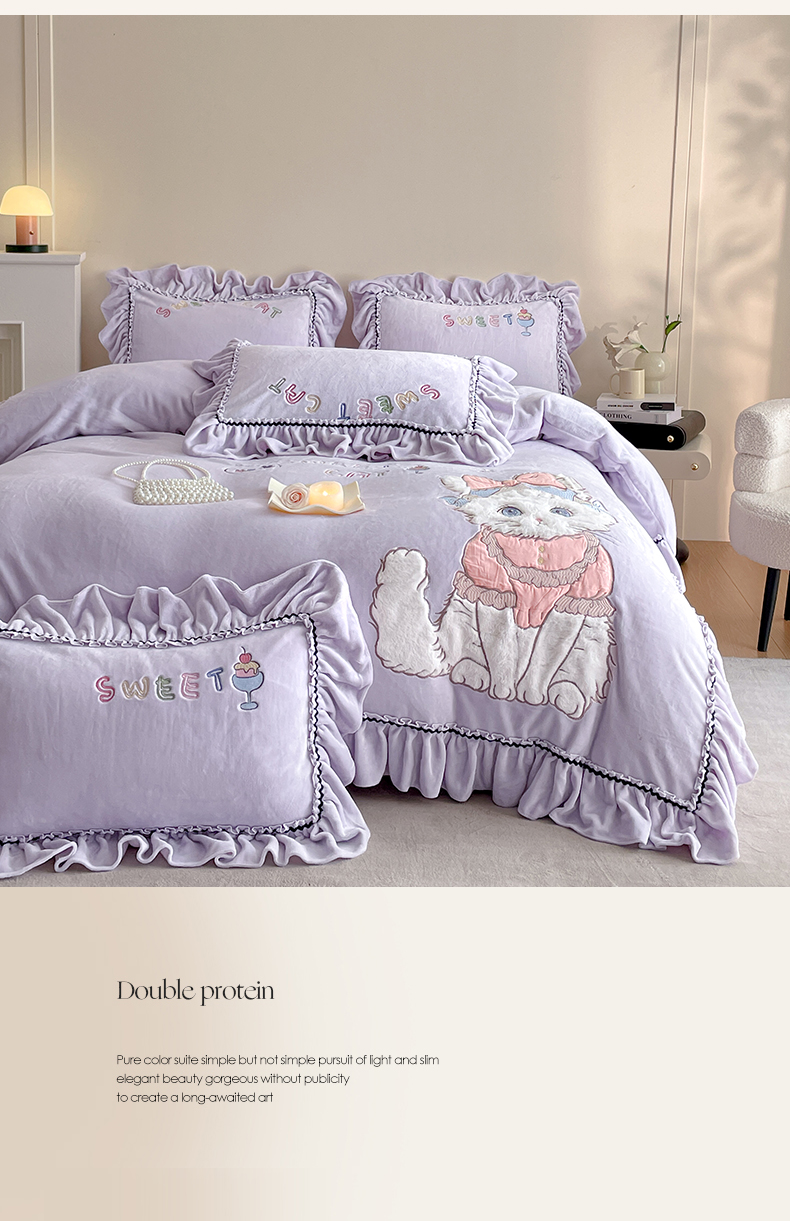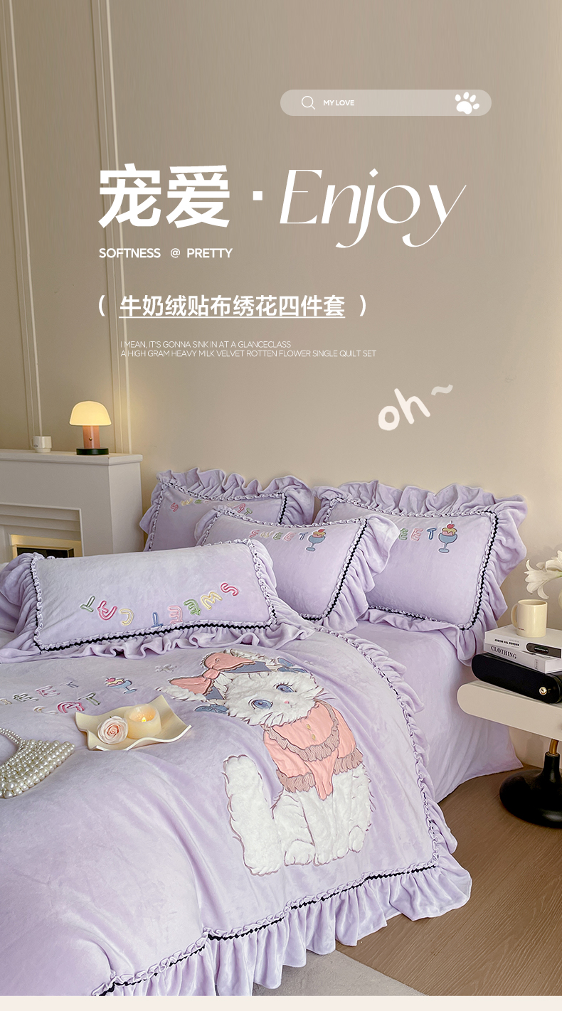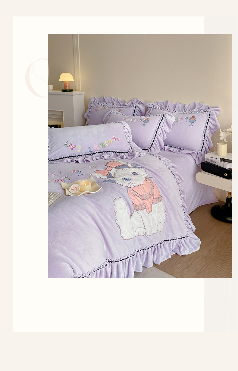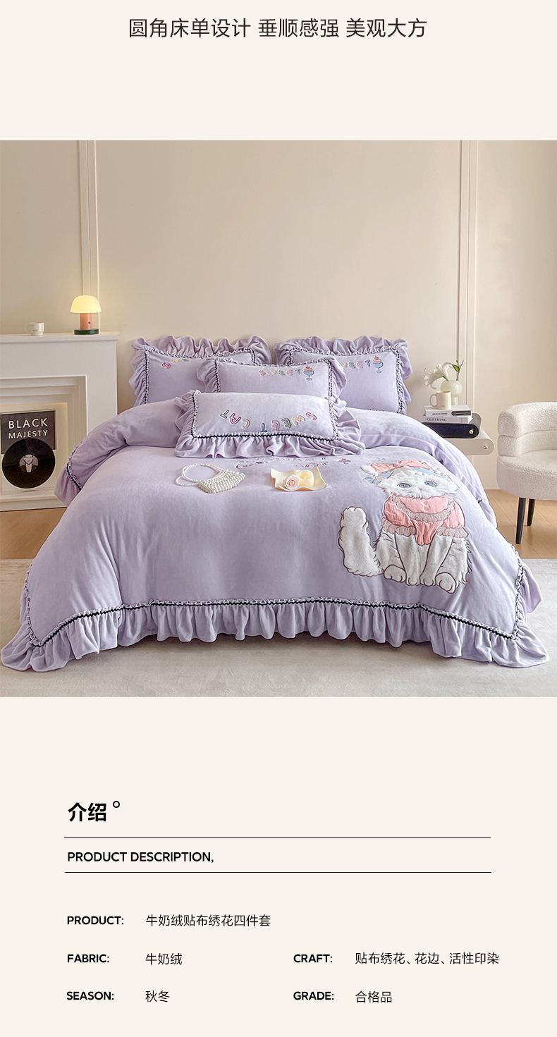 商品名称:民新家纺 2025新款牛奶绒毛巾绣贴布绣花四件套 蜜语-浅紫