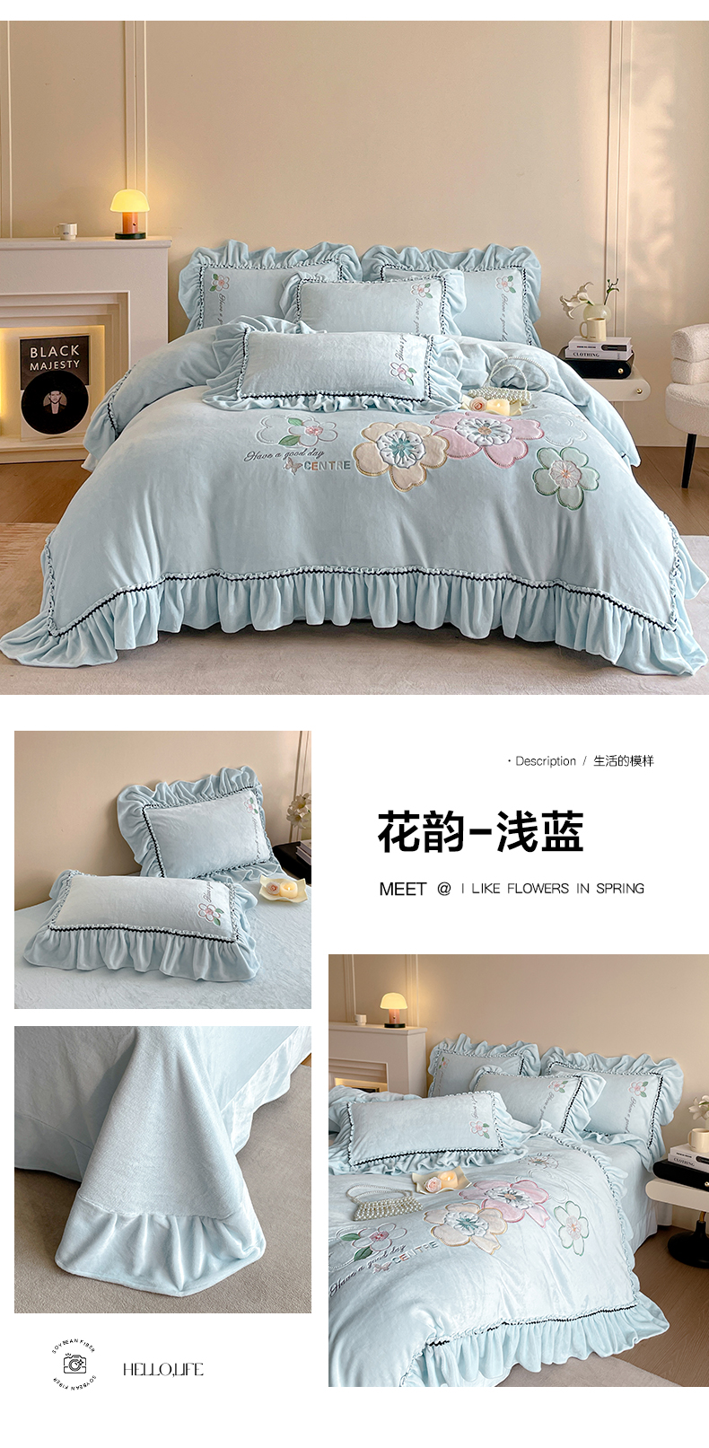 (总)民新家纺 2025新款牛奶绒刺绣花边四件套-挚爱,挚爱-浅紫,挚爱-浅蓝,挚爱-浅米黄,挚爱-青柠绿,挚爱-樱花粉