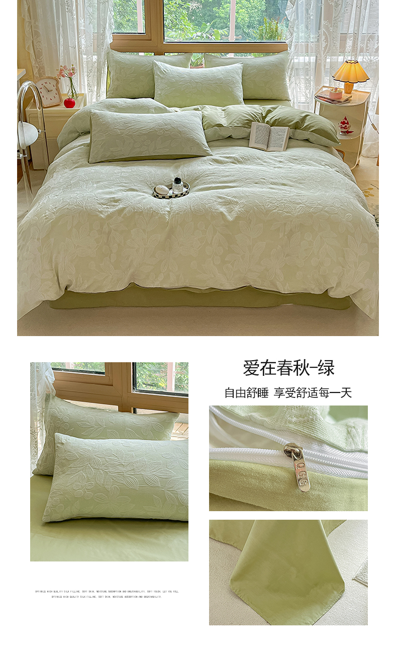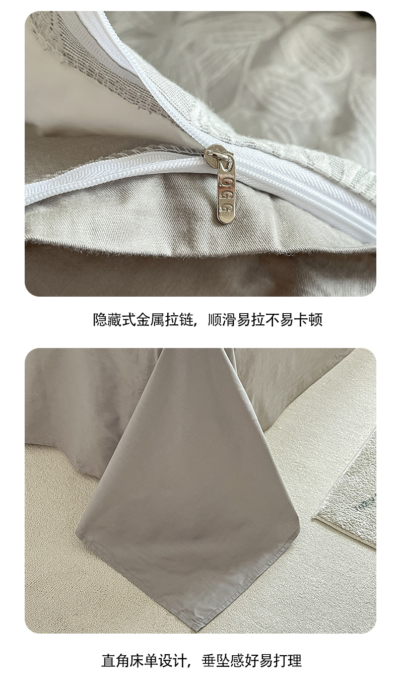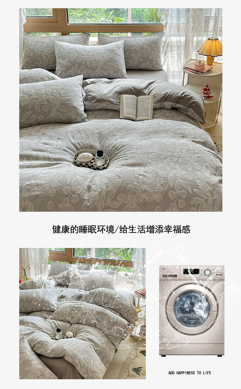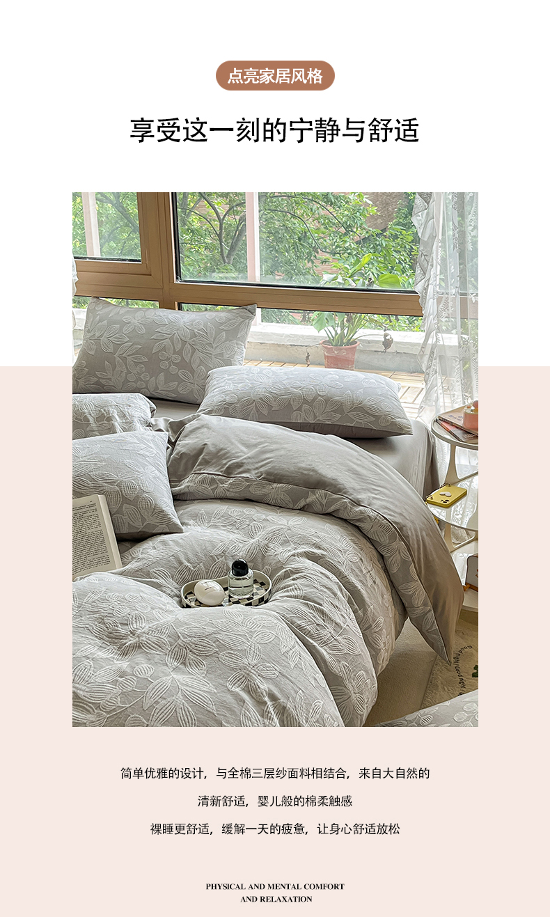 当前位置: 91家纺网 > 商品网购 > 床品套件 > 四件套 > 色织四件套 > 琪格格纺织 2025新款全棉A类色织三层纱提花四件套 三层纱 爱在春秋-灰