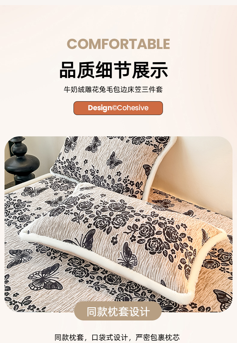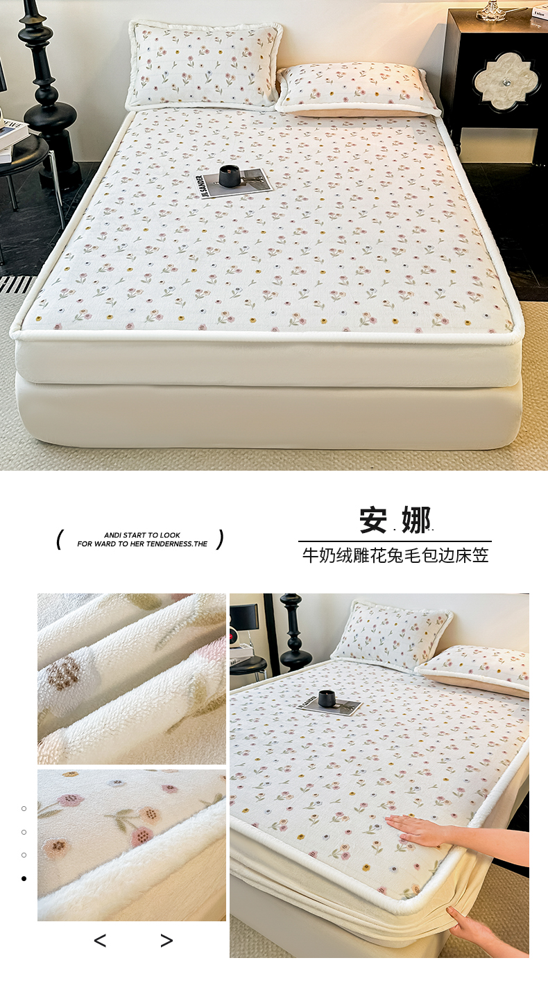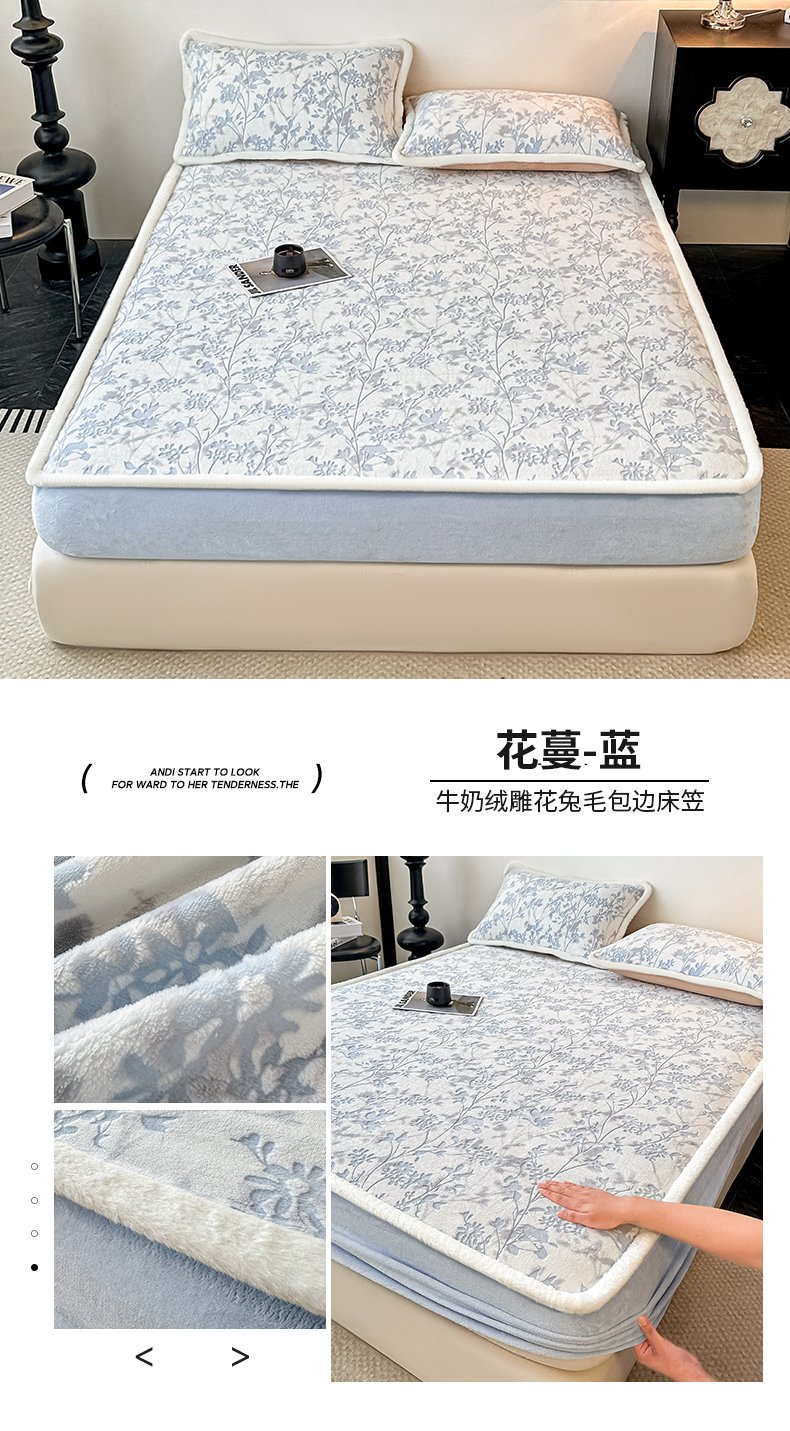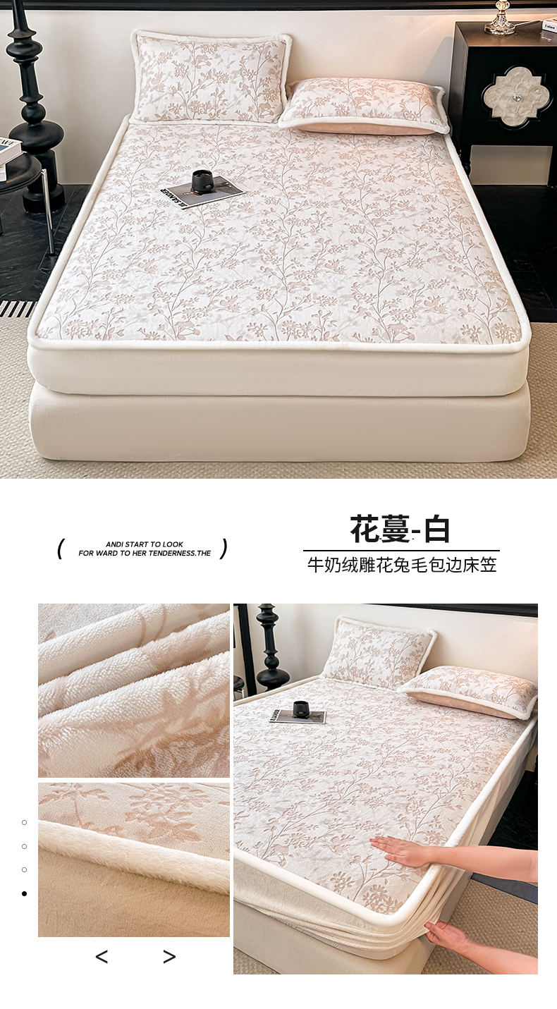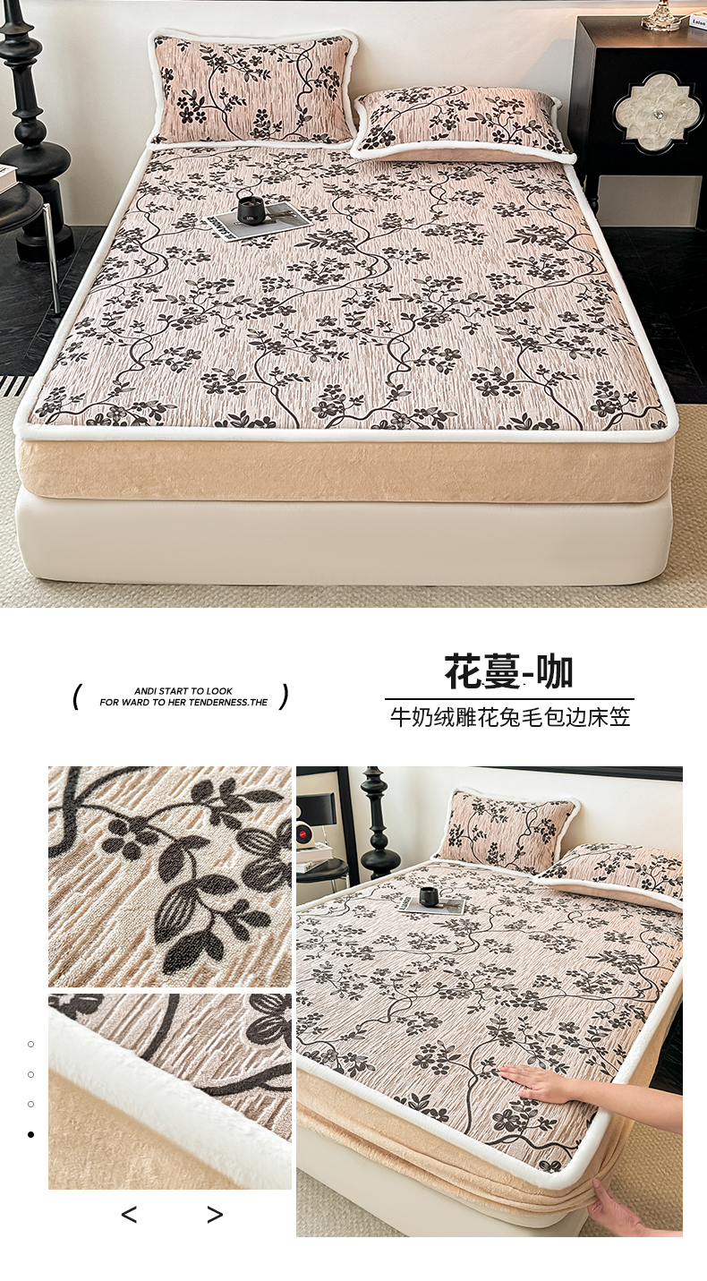 商品名称:(总)盛眠家纺 2025新款牛奶绒雕花兔毛包边床笠三件套