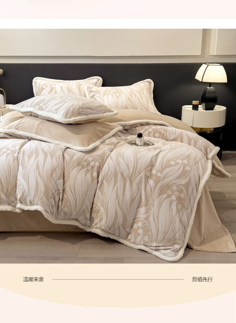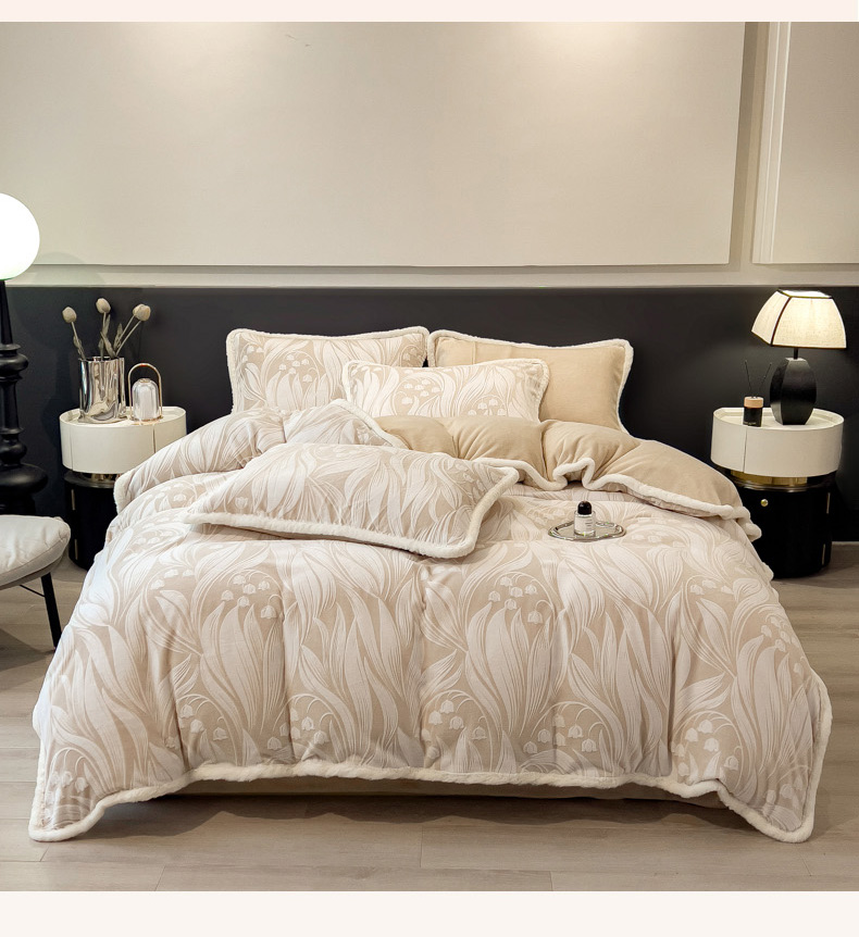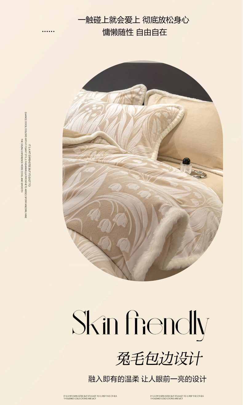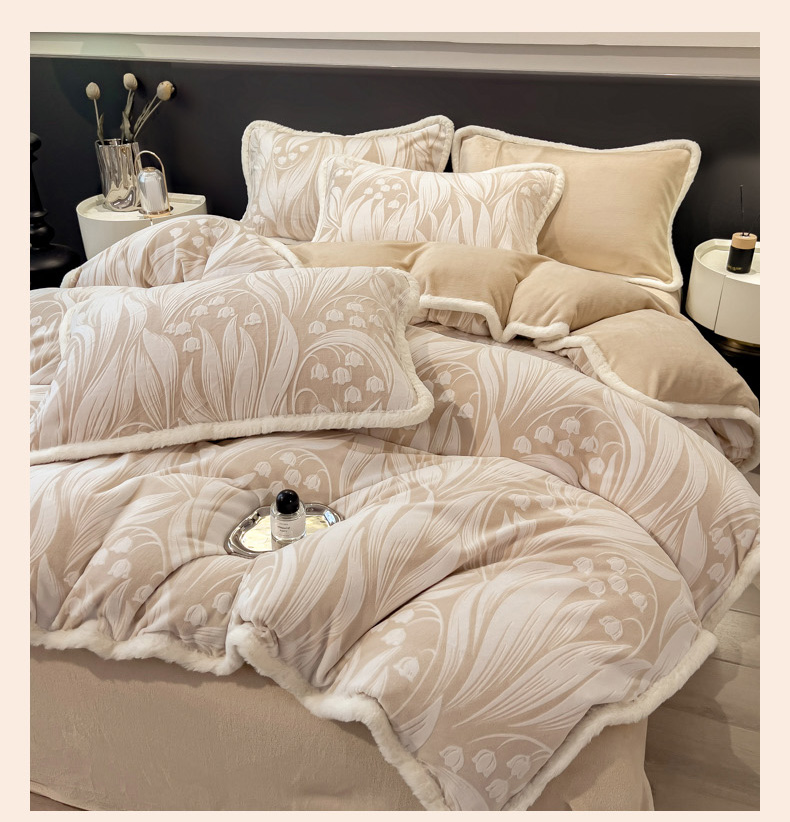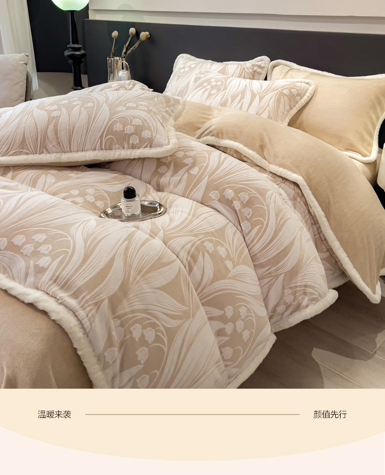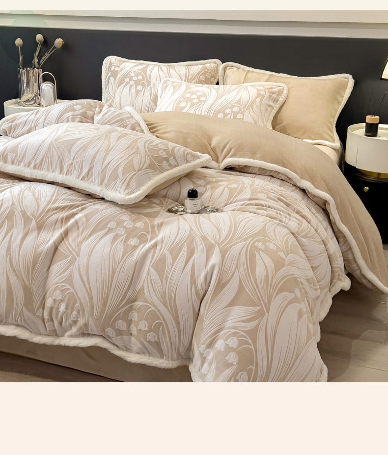 当前位置: 91家纺网 > 商品网购 > 床品套件 > 四件套 > 兔毛绒四件套 > 印季家纺 2025新款法式立体雕花绒兔毛包边四件套 铃兰梦境-米黄