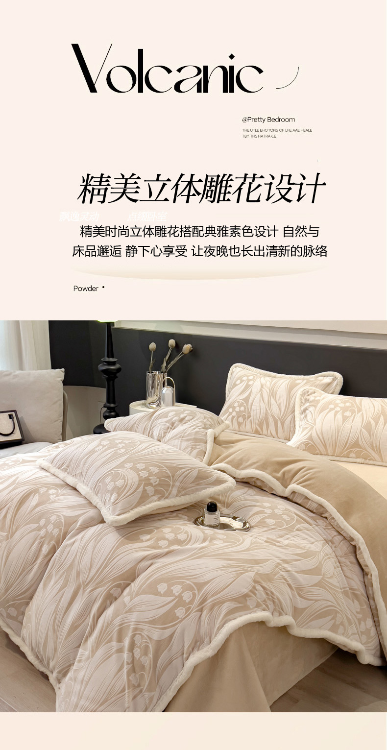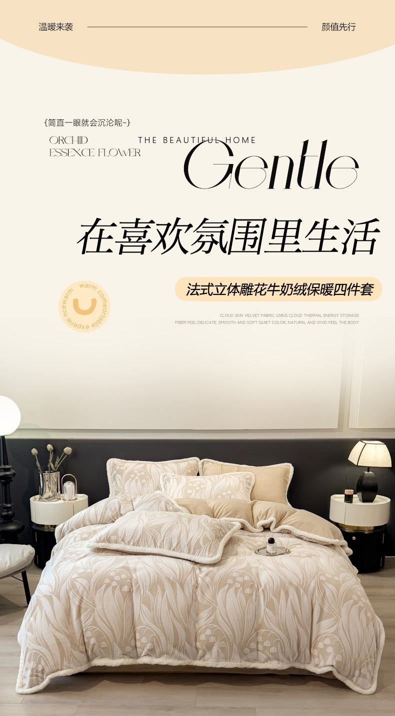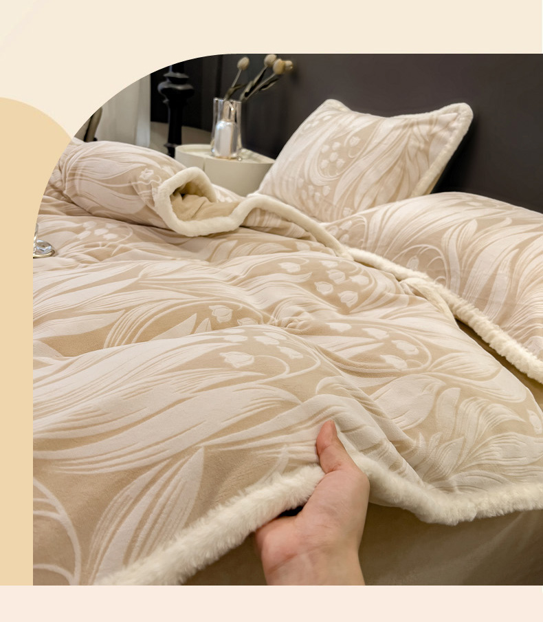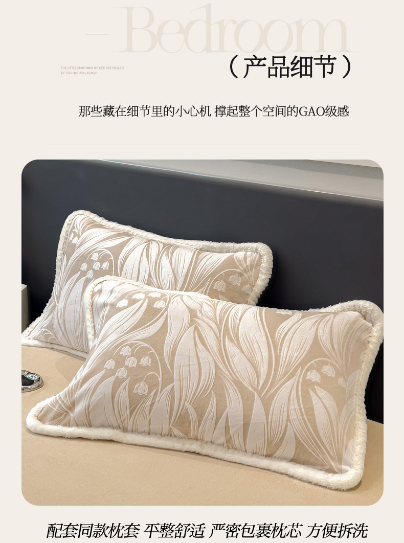 当前位置: 91家纺网 > 商品网购 > 床品套件 > 四件套 > 兔毛绒四件套 > 印季家纺 2025新款法式立体雕花绒兔毛包边四件套 铃兰梦境-米黄