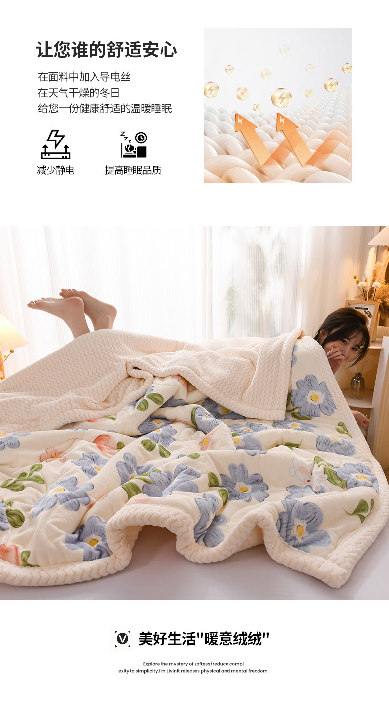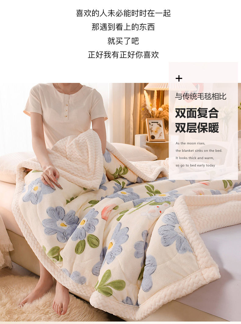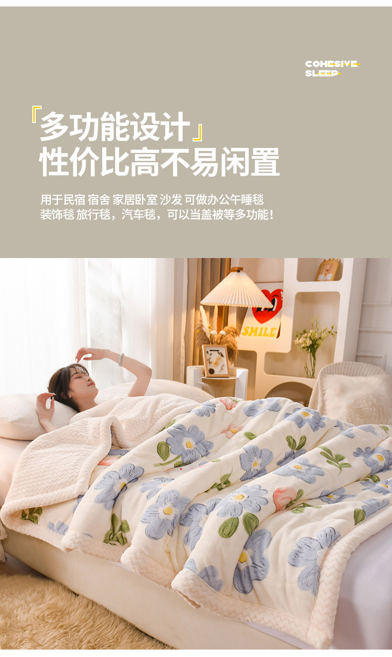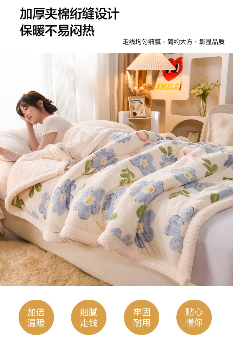印季家纺 2025新款三层夹棉印花牛奶绒毛毯毯子 蓝色心情