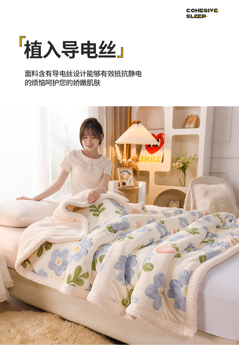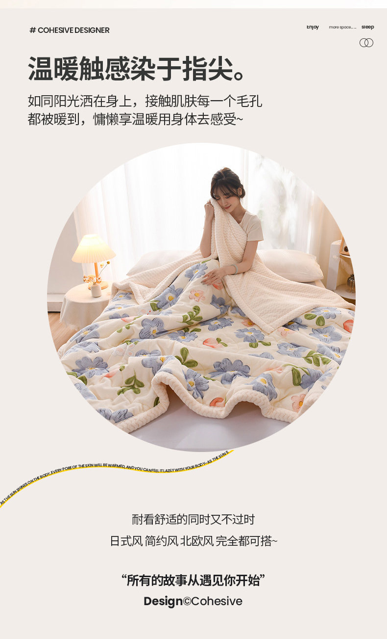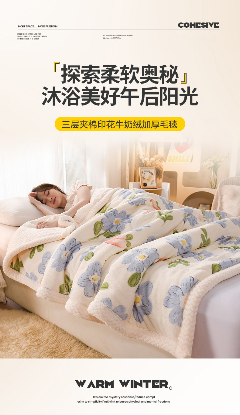 印季家纺 2025新款三层夹棉印花牛奶绒毛毯毯子 蓝色心情