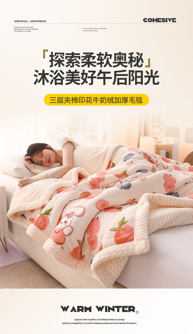 商品名称:印季家纺 2025新款三层夹棉印花牛奶绒毛毯毯子 桃桃兔