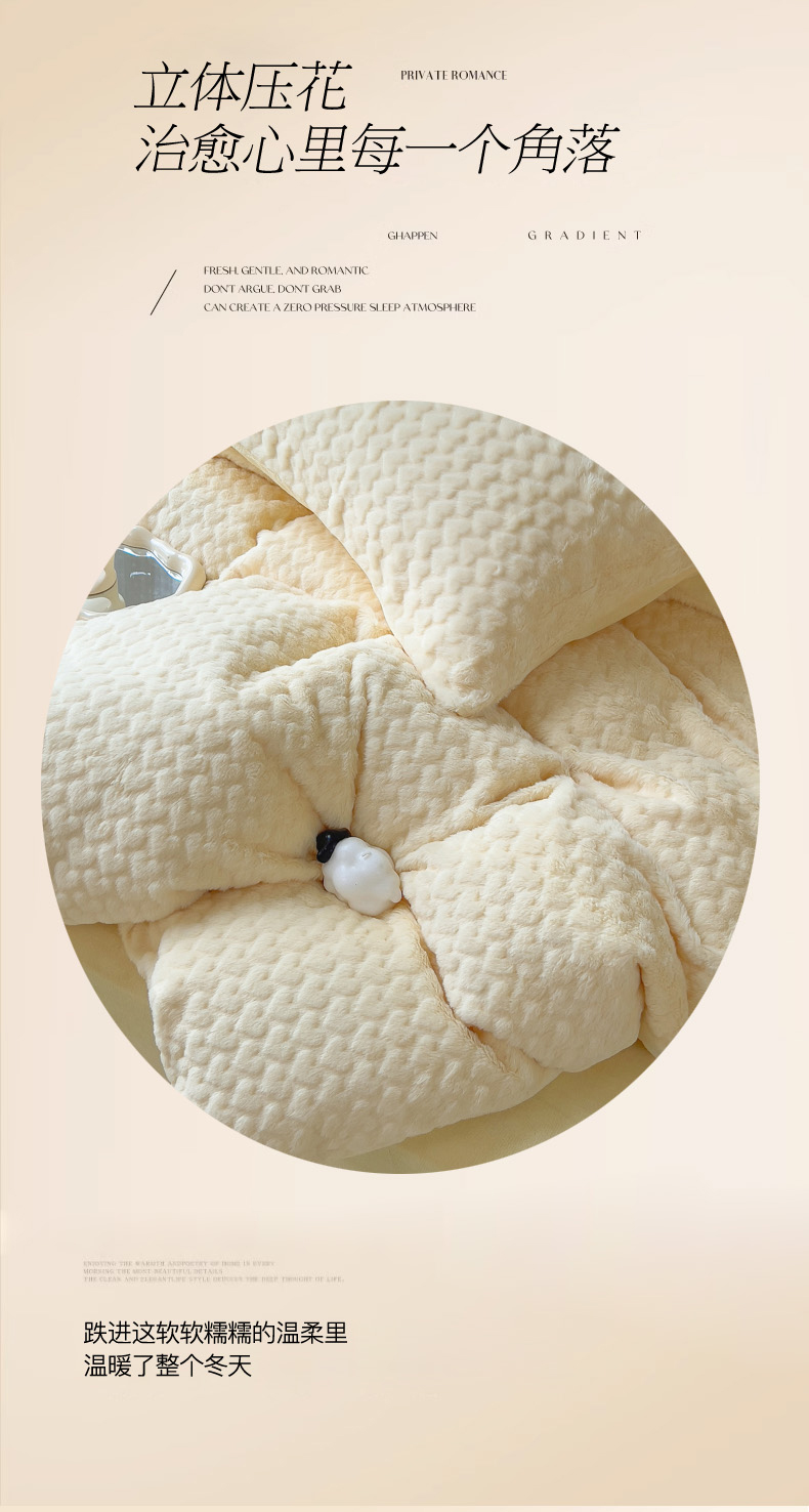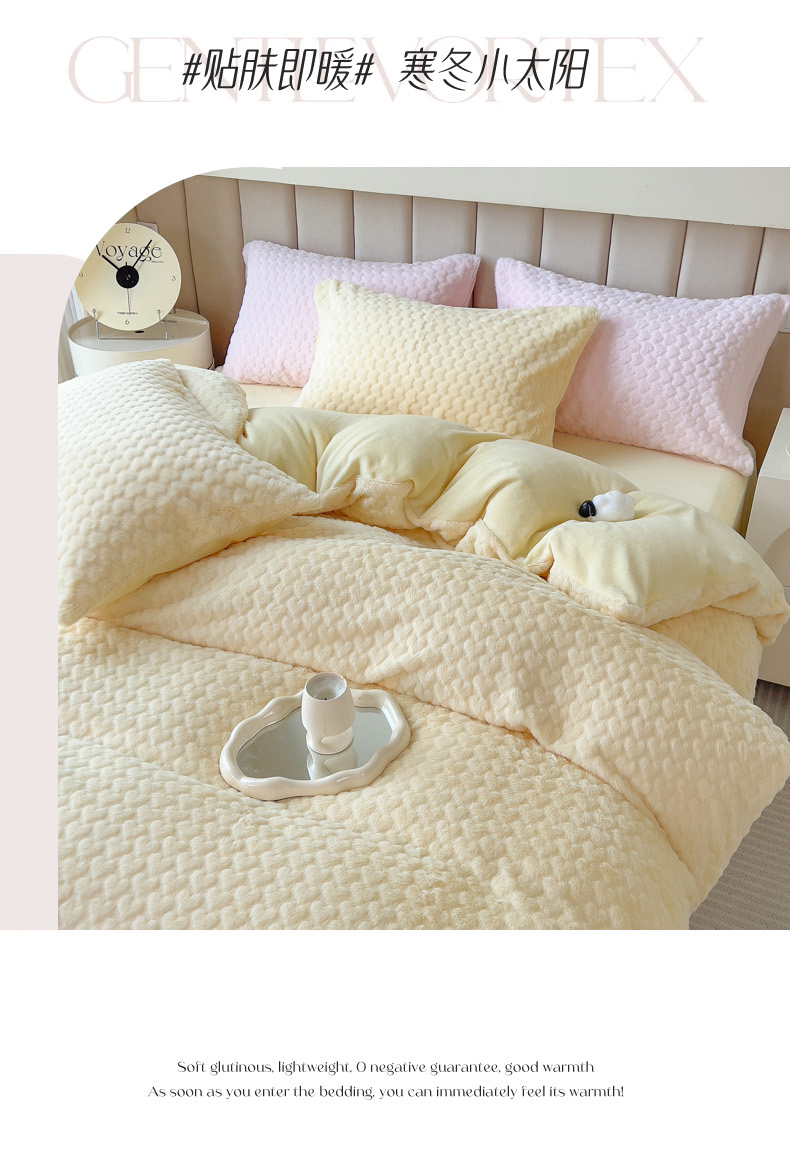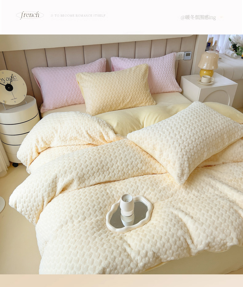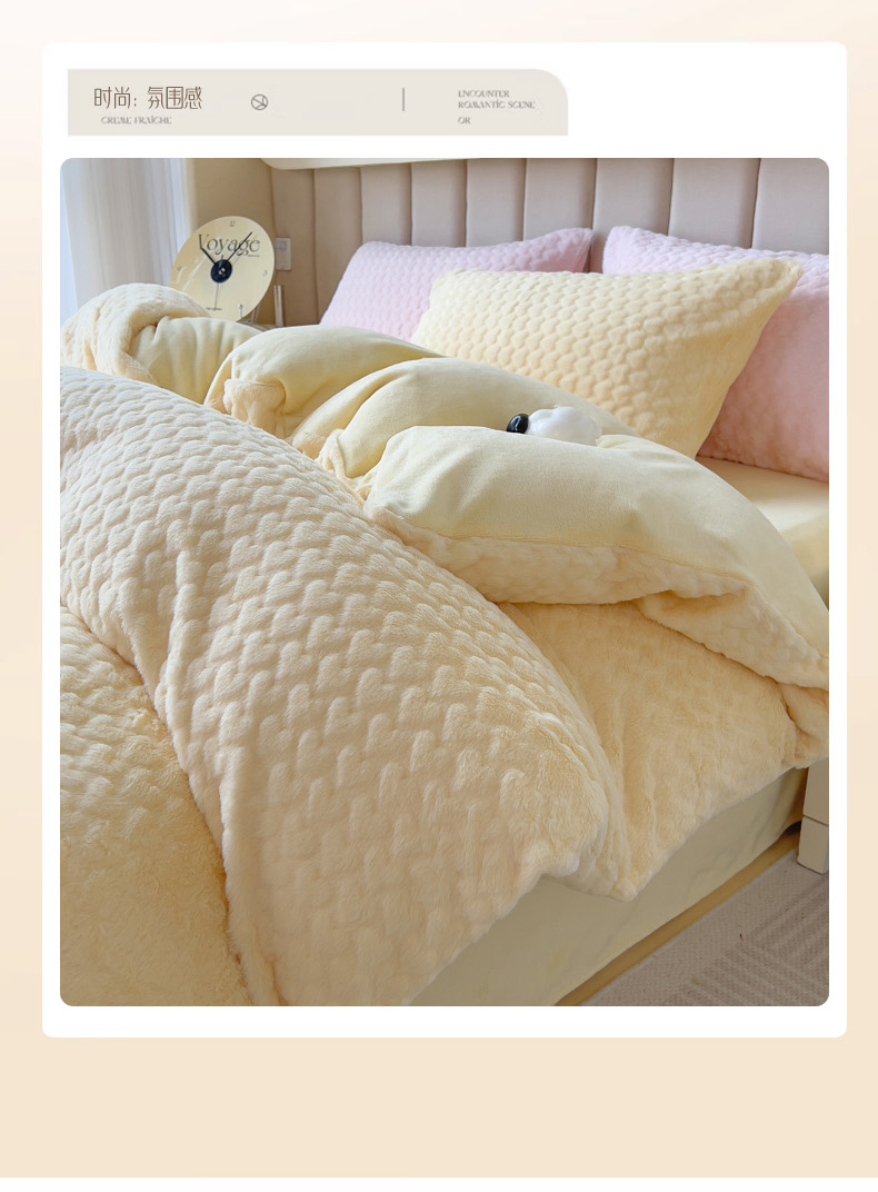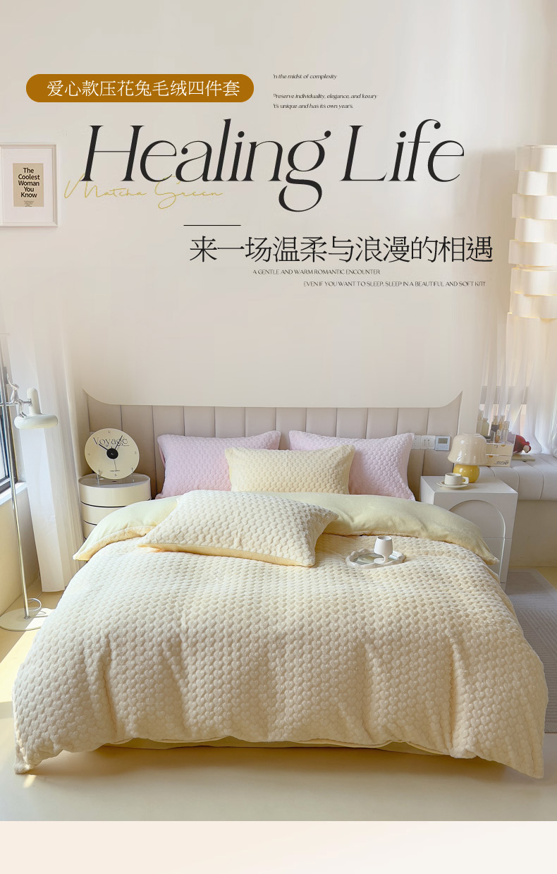当前位置: 91家纺网 > 商品网购 > 床品套件 > 四件套 > 兔毛绒四件套 > 印季家纺 2025新款爱心款压花兔毛绒四件套 鹅黄