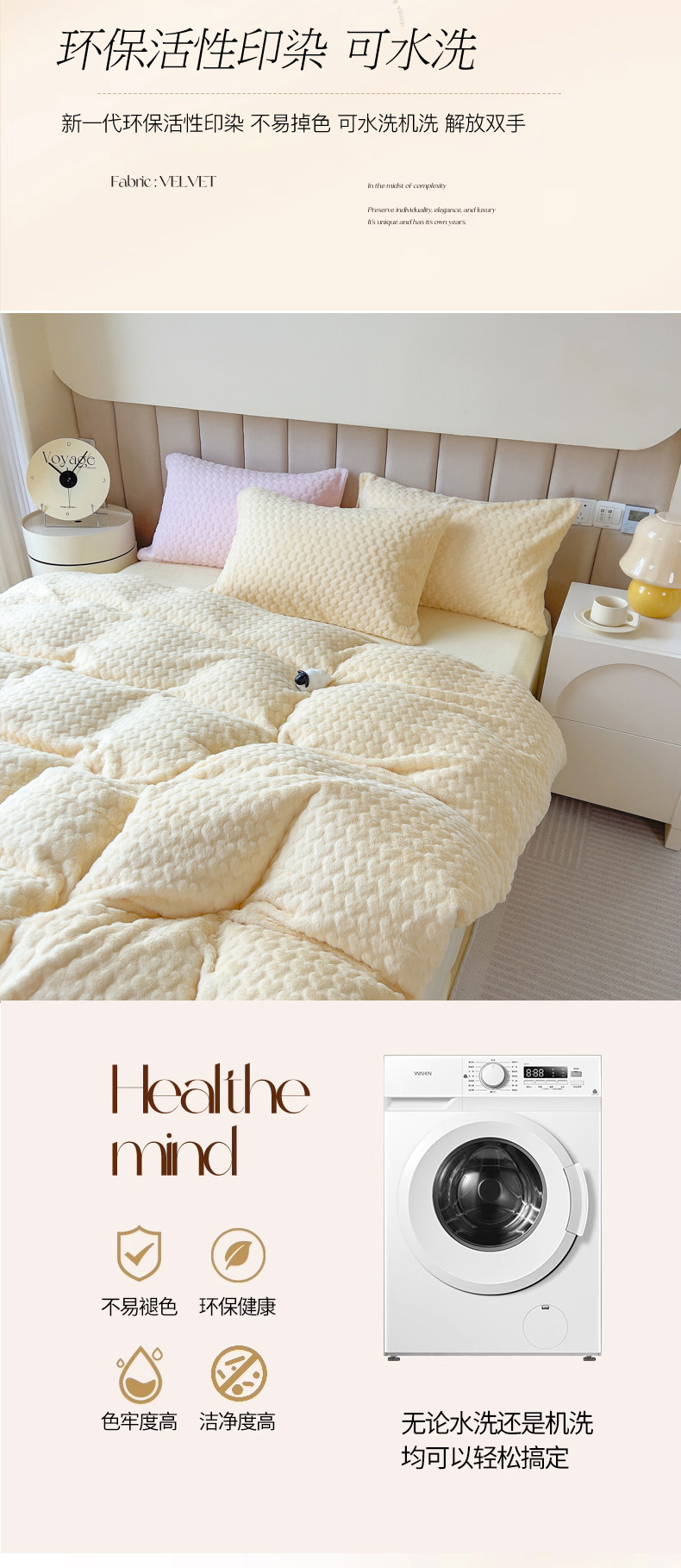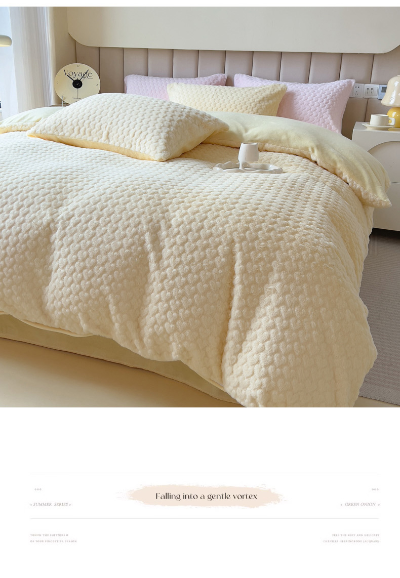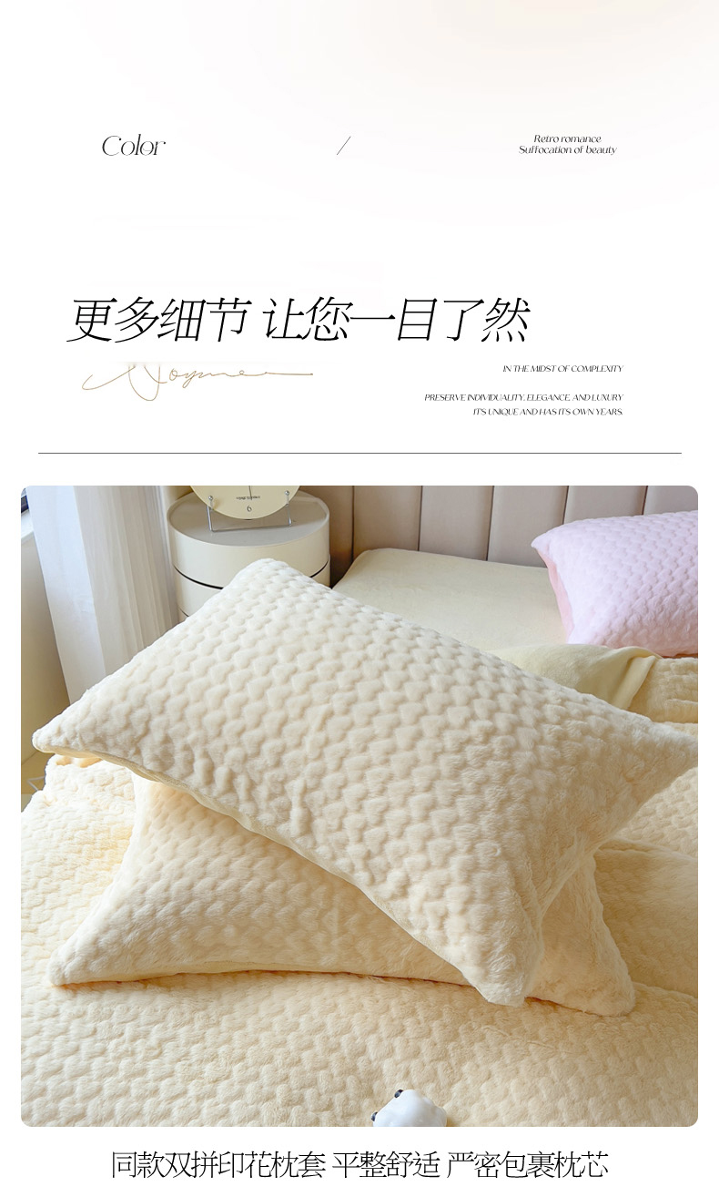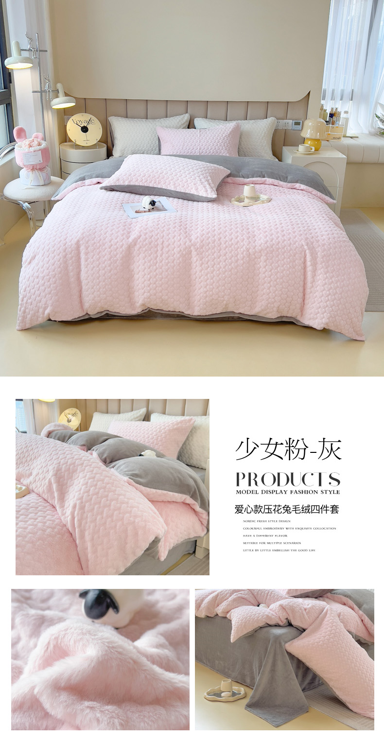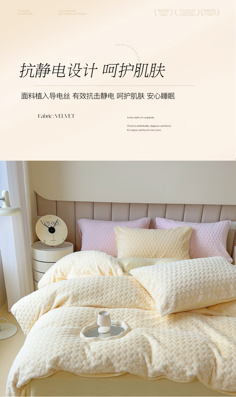 当前位置: 91家纺网 > 商品网购 > 床品套件 > 四件套 > 兔毛绒四件套 > 印季家纺 2025新款爱心款压花兔毛绒四件套 鹅黄