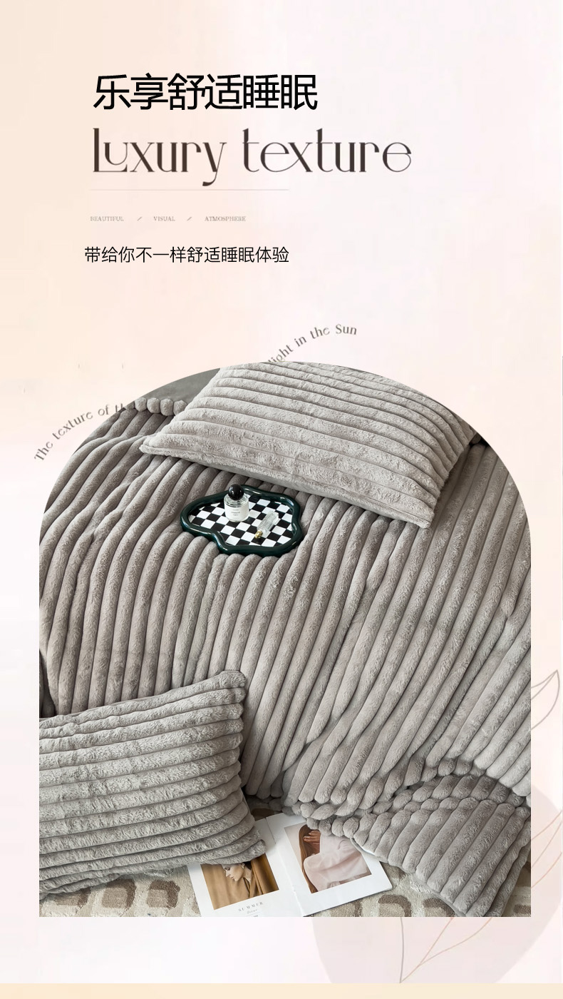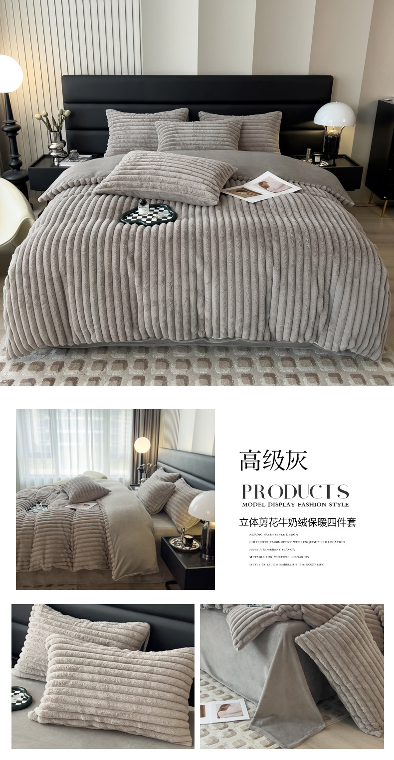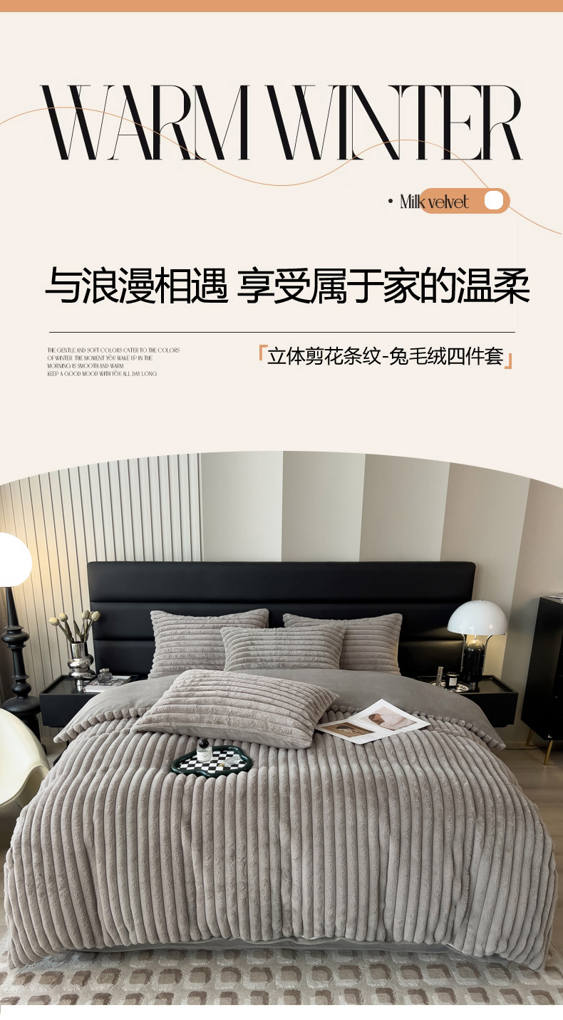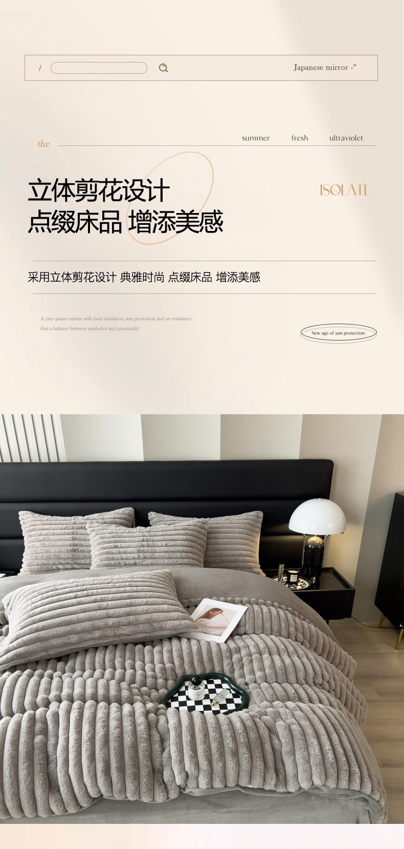 当前位置: 91家纺网 > 商品网购 > 床品套件 > 四件套 > 兔毛绒四件套 > 印季家纺 2025新款立体剪花条纹兔毛绒四件套 高级灰