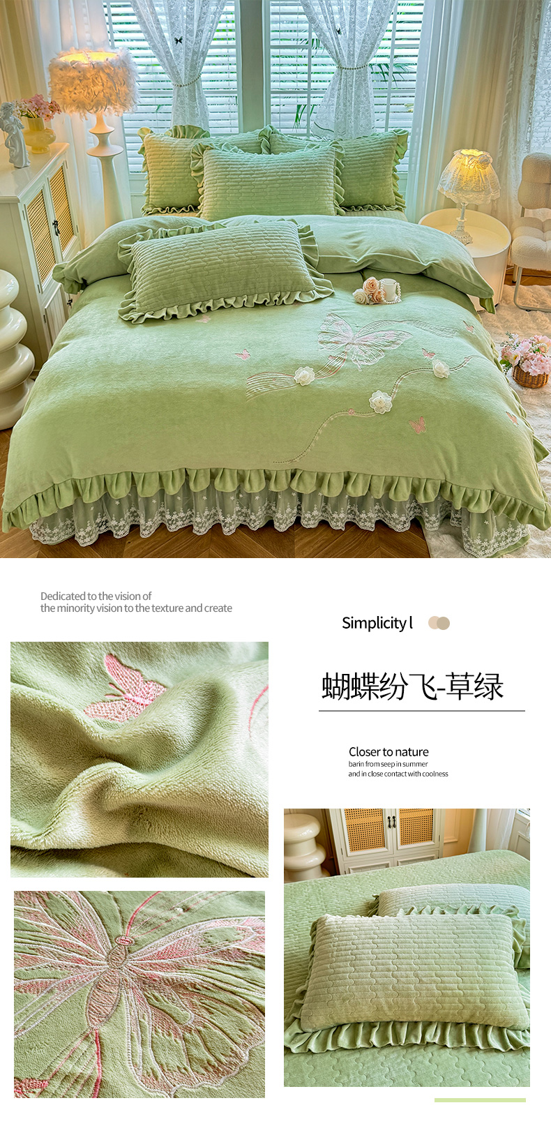商品名称:唐人居 2025新款高克重牛奶绒花边夹棉四件套-蝴蝶纷飞 蝴蝶纷飞-草绿