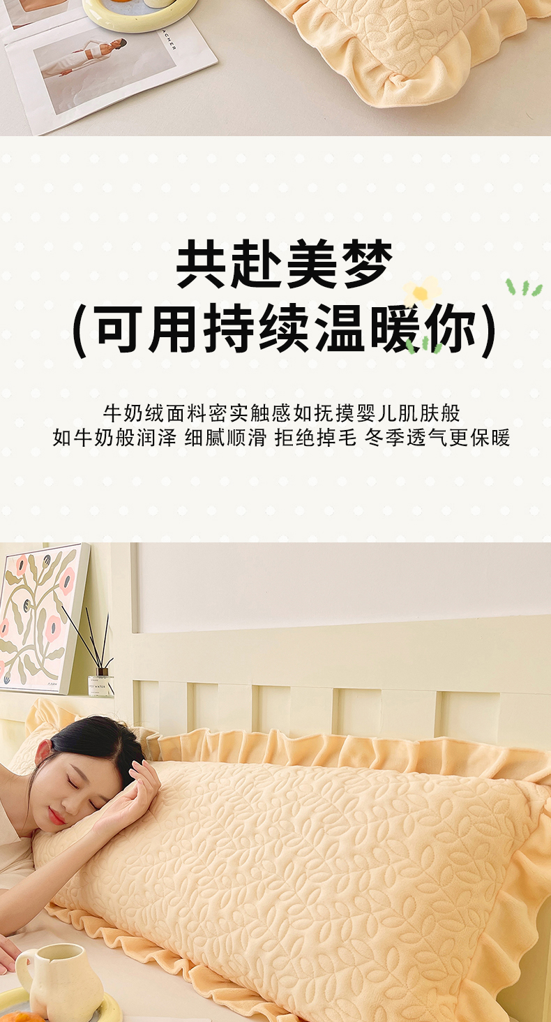 商品名称:雨彤家纺 2025新款牛奶绒花边夹棉长枕套 幸运草-鹅黄