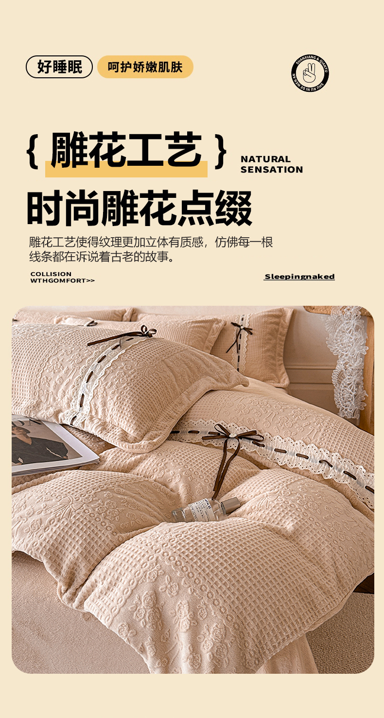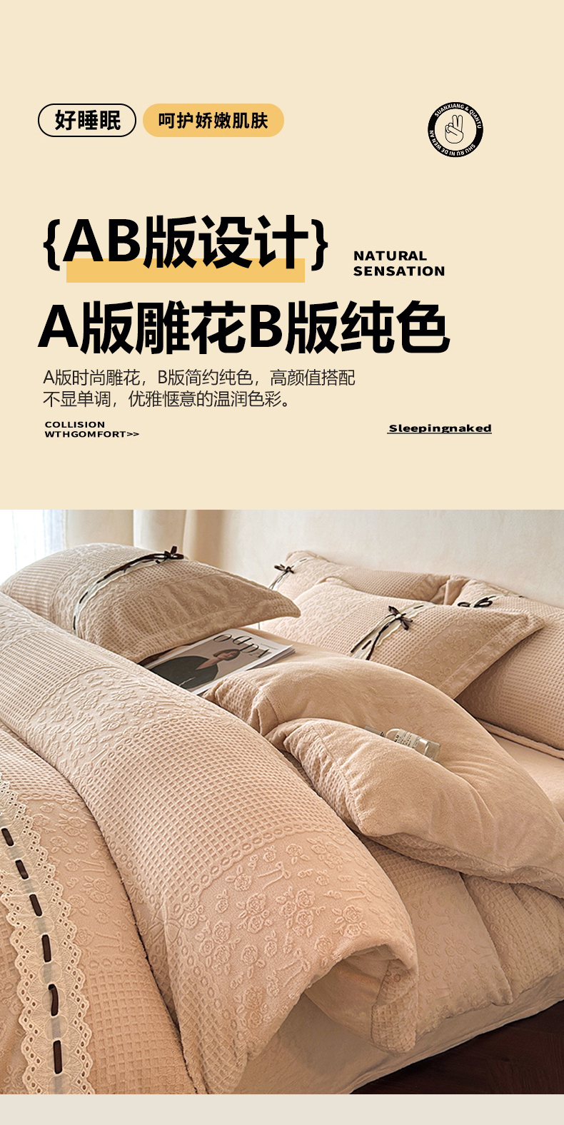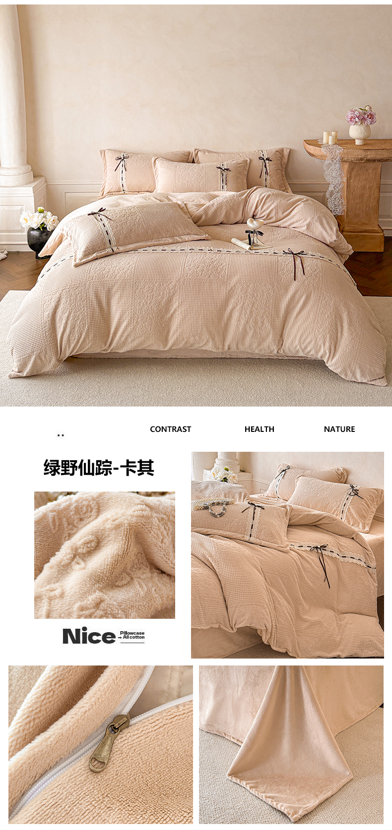 (总)叠派家纺 2025新款高克重高端牛奶绒雕花织带工艺款梦巢系列四件套(直播热款)提供买家秀,梦巢-星空蓝,梦巢-金典灰,梦巢-麦卡其,梦巢-玉粉,送精美手提包装