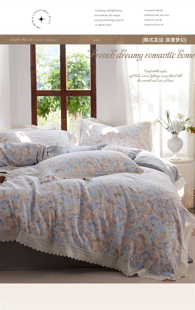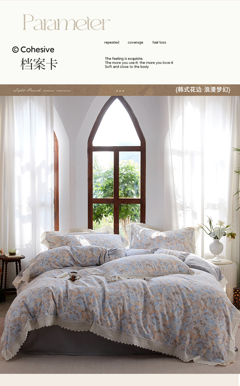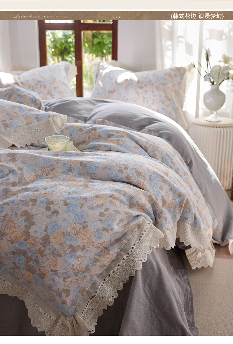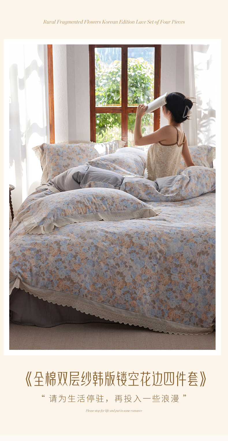当前位置: 91家纺网 > 商品网购 > 床品套件 > 四件套 > 全棉普通四件套 > 梵克保罗 2026春夏新品韩版全棉纯棉双层纱镂空花边系列四件套 半岛花园-兰