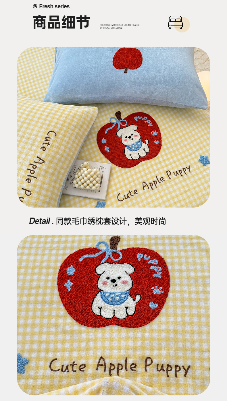 • 91家纺网 家纺一手货源 找家纺 灰鲸 2025新款高克重牛奶绒毛巾绣单床单 黄格苹果狗