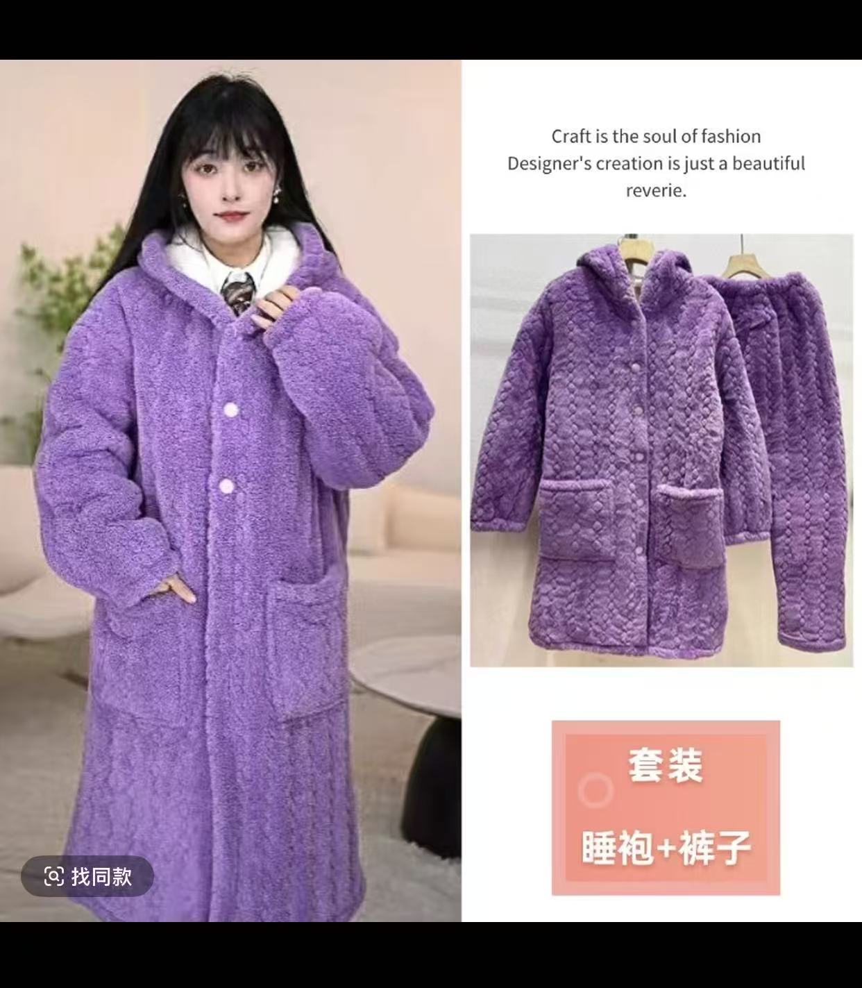 (总)洛兰沙家居馆 2024新款睡衣女秋冬季素色三层夹棉珊瑚绒加厚保暖两件套女士可外穿加绒家居服,紫色,咖色,橘色,绿色,蓝色,米色
