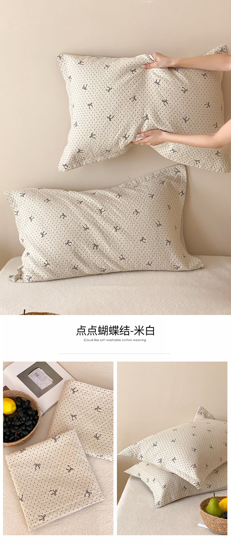 商品名称:麻依 2025新款安心棉枕套四层纱布枕套 点点蝴蝶结-粉
