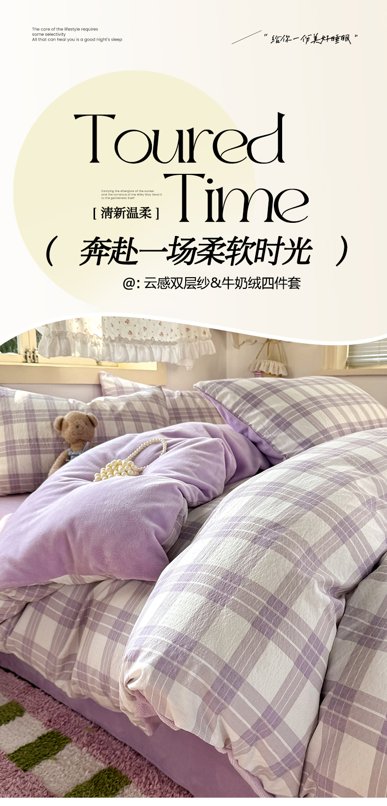 (总)多品家纺 2025新款云感双层纱高克重牛奶绒四件套,甜甜草莓,黛西紫,可爱新新,空谷兰香,蓝大格,猫猫小姐,木兰蝶,七里花香,十里春风,珍妮公主,紫大格