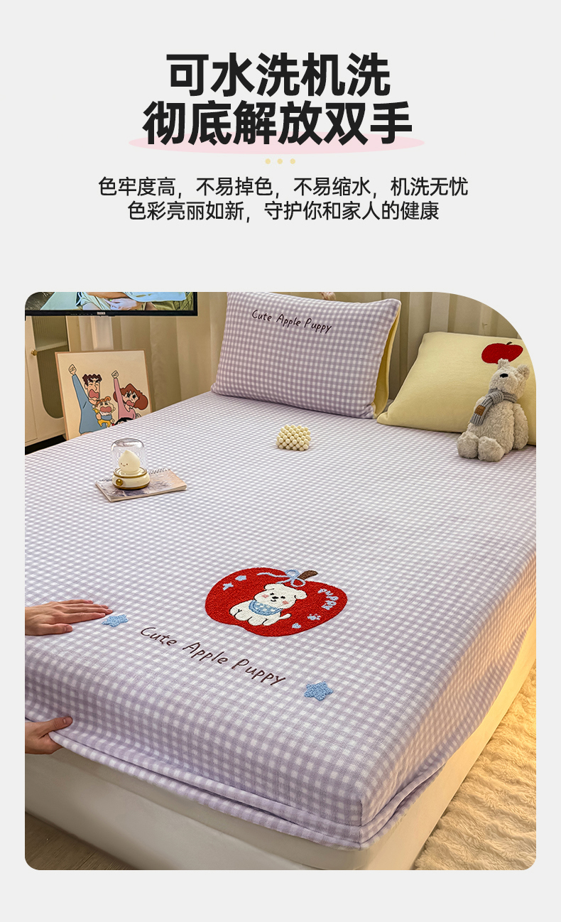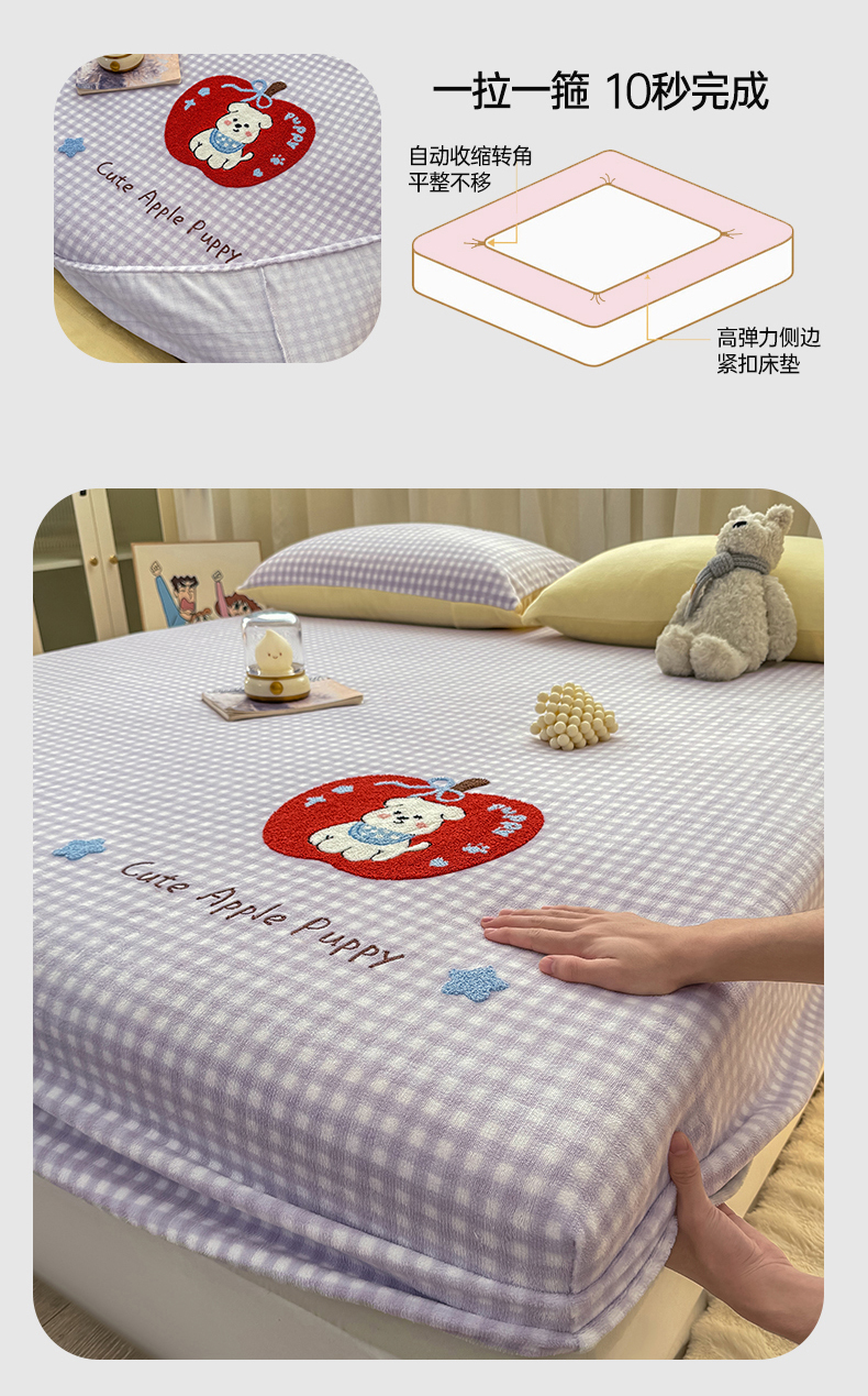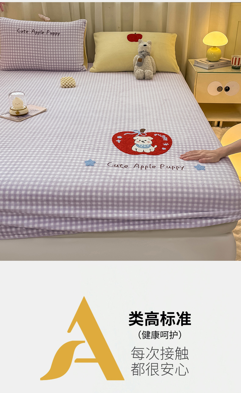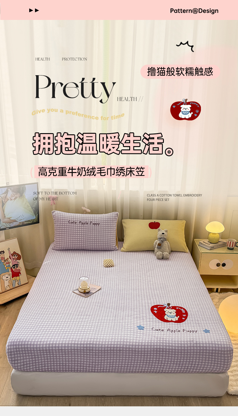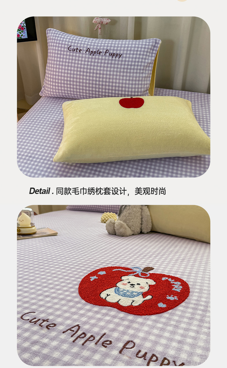 • 91家纺网 家纺一手货源 找家纺 灰鲸 2025新款高克重牛奶绒毛巾绣床笠单床笠单品床笠床笠单件 紫格苹果狗