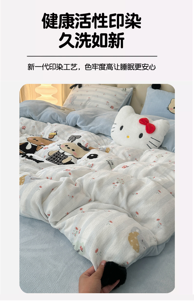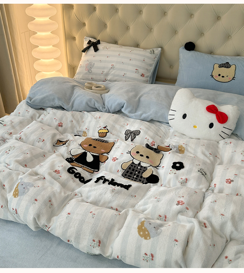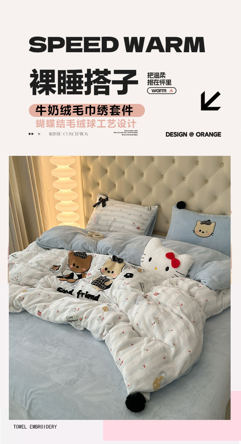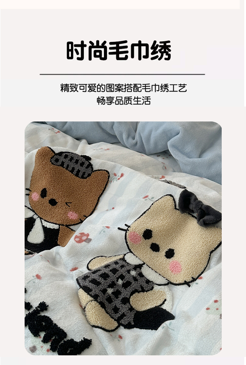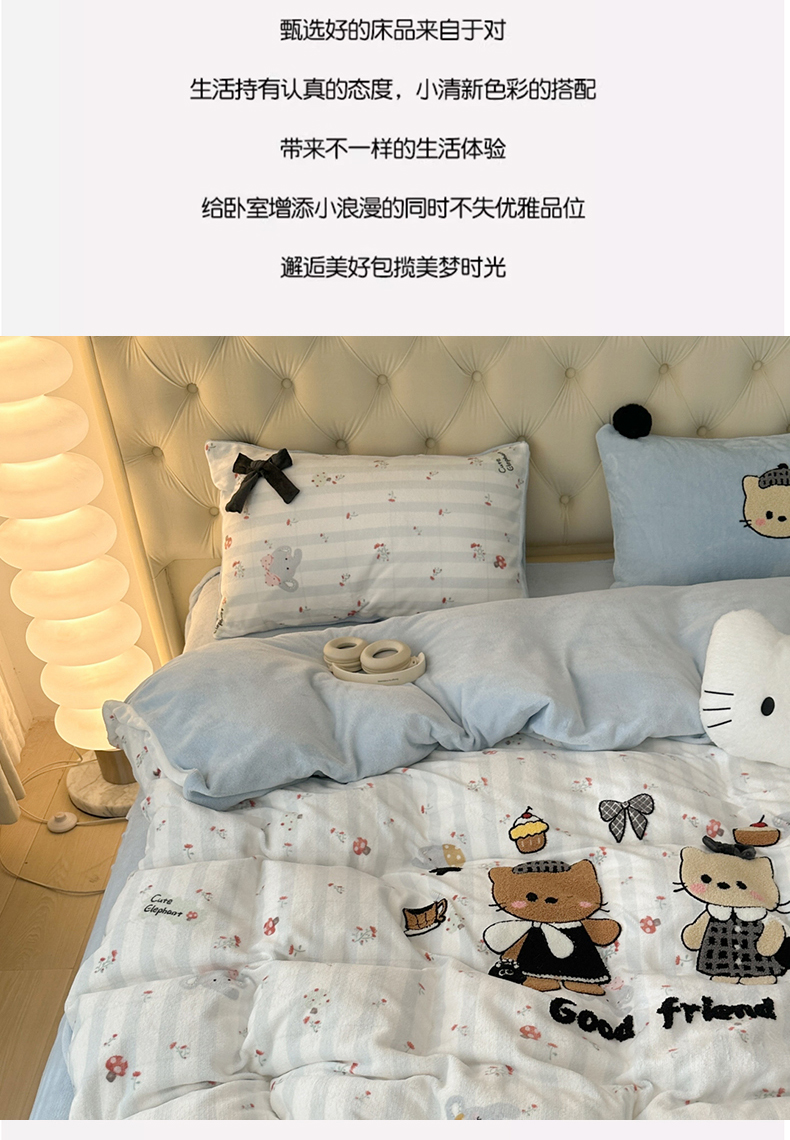 子钦家纺 2025秋冬新款暗黑系小红书同款加厚牛奶绒蝴蝶结款毛巾绣床单床笠四件套-快乐兄妹场景一 快乐兄妹-好时光