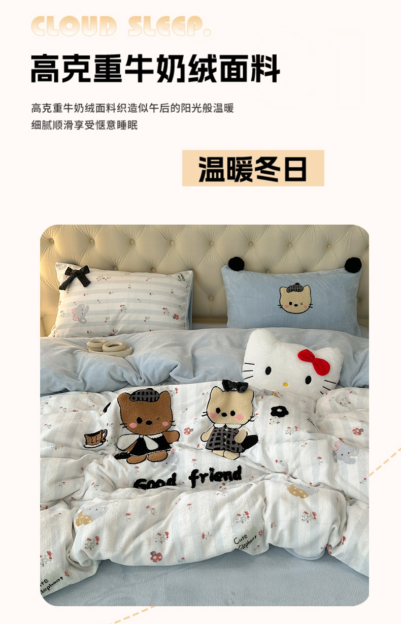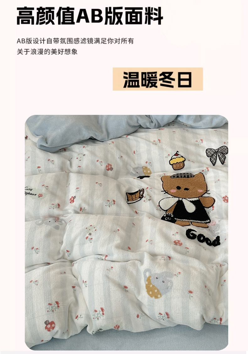 (总)子钦家纺 2023新款赫本风棉加绒牛奶绒四件套,爱心,斑纹,豹纹,蝴蝶结,可爱熊,奶牛,山茶花,神秘花园,素描花,田园风情