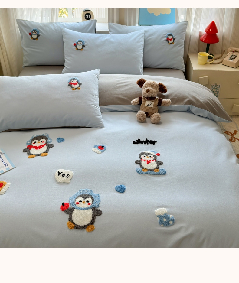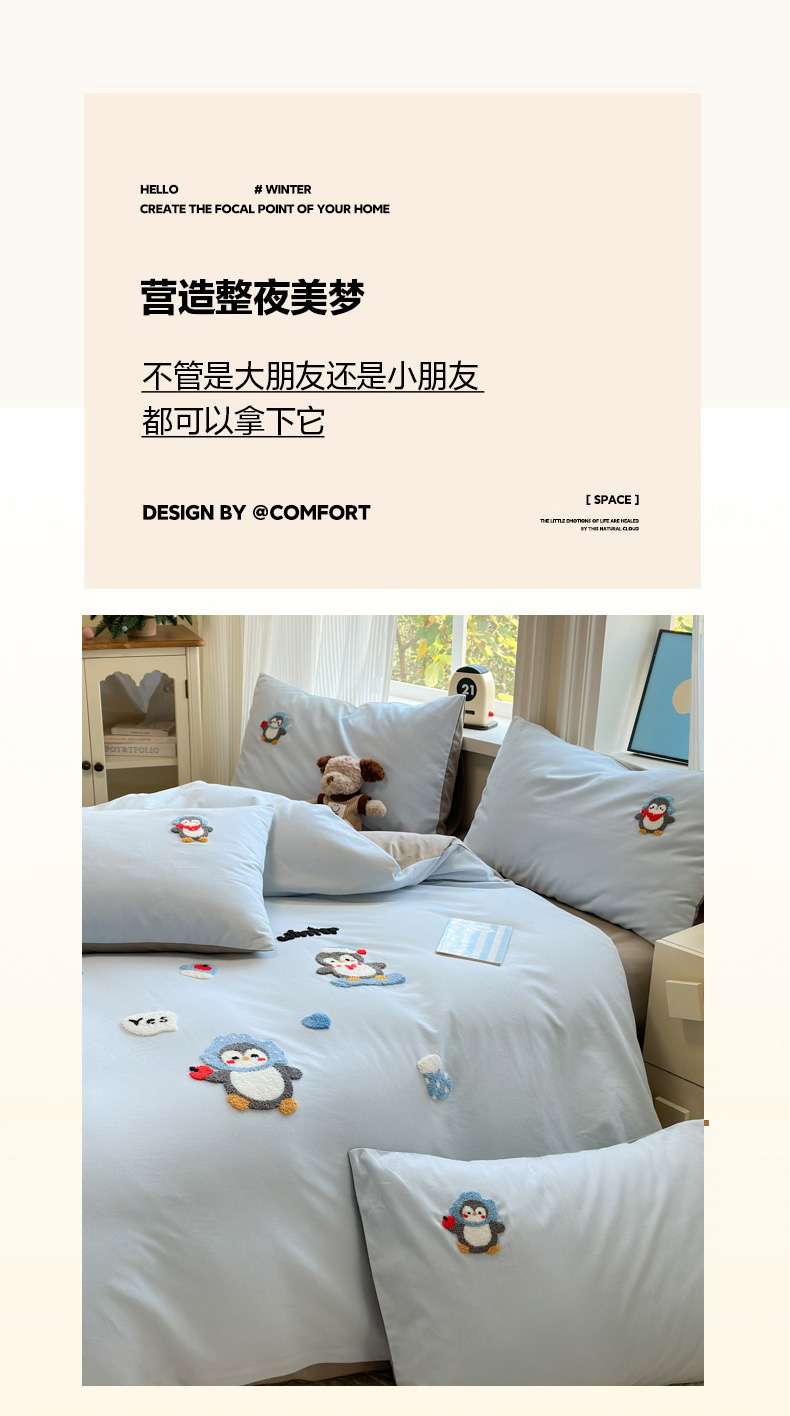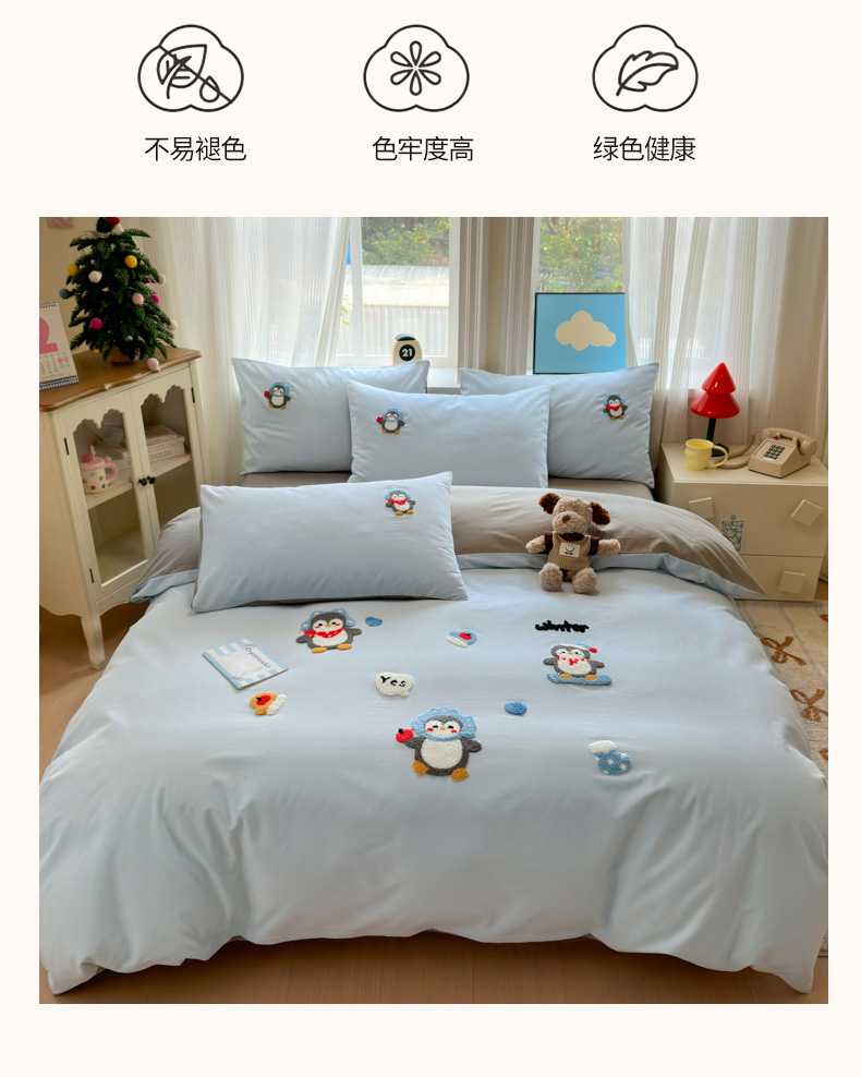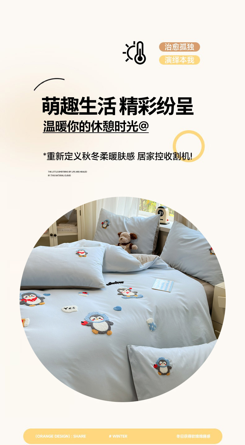 当前位置: 91家纺网 > 商品网购 > 床品套件 > 四件套 > 全棉普通四件套 > 如意朵 2025新款全棉加厚磨毛绣花四件套风格二(专版花型) 追梦企鹅蓝