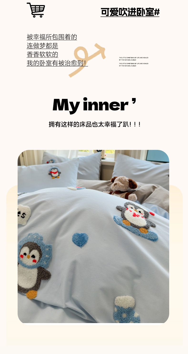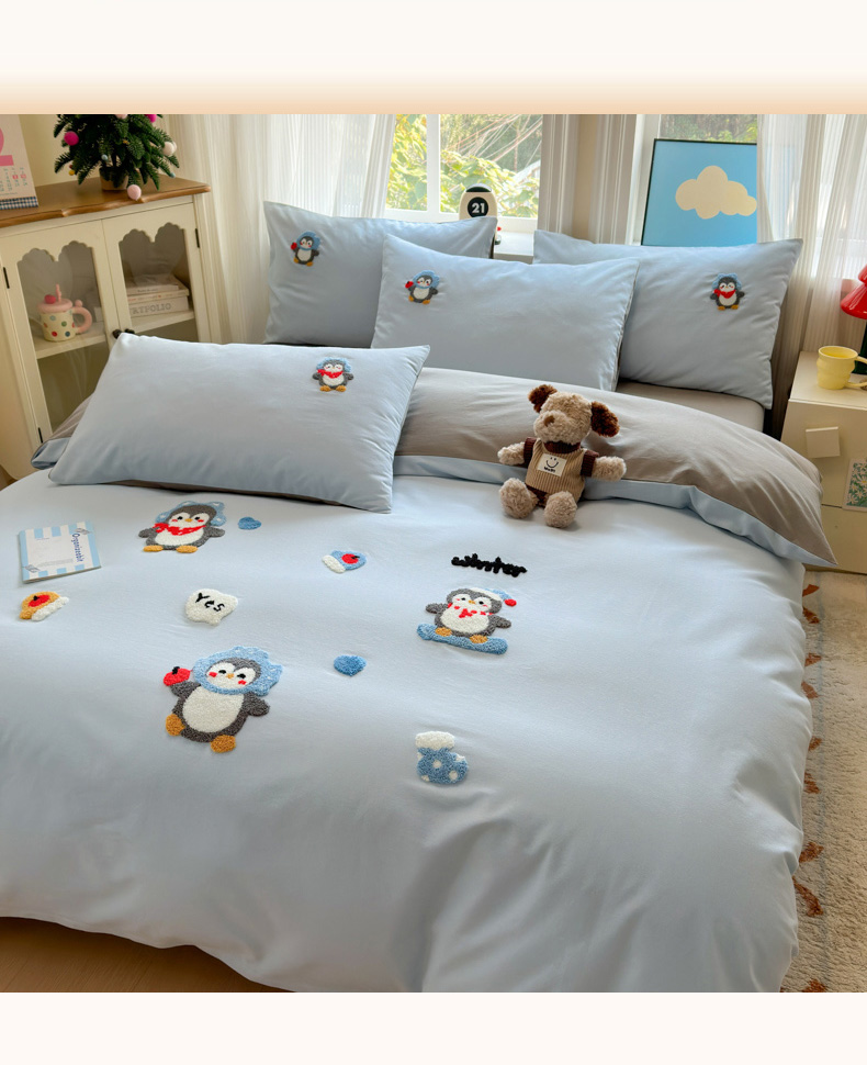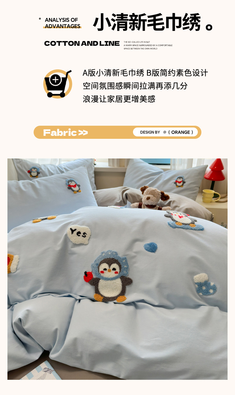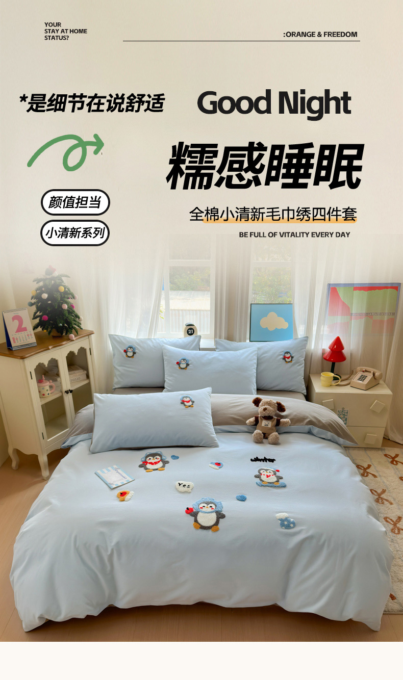 当前位置: 91家纺网 > 商品网购 > 床品套件 > 四件套 > 全棉普通四件套 > 如意朵 2025新款全棉加厚磨毛绣花四件套风格二(专版花型) 追梦企鹅蓝