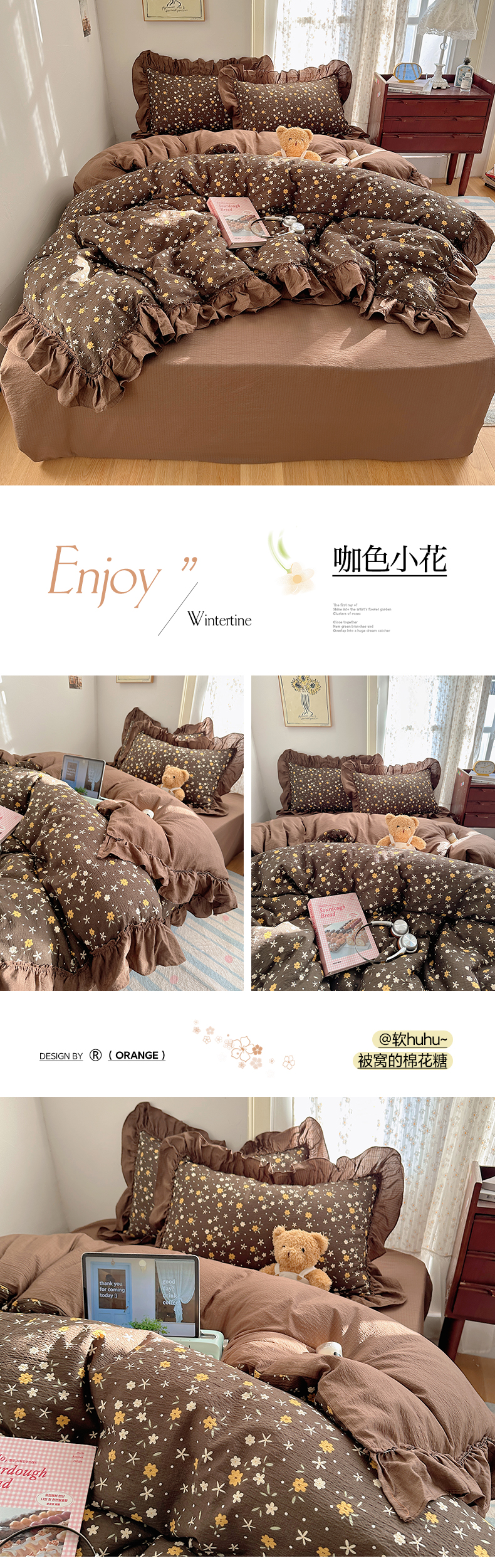 美乐迪家纺 2026新款法式云感双层纱花边四件套 咖色小花